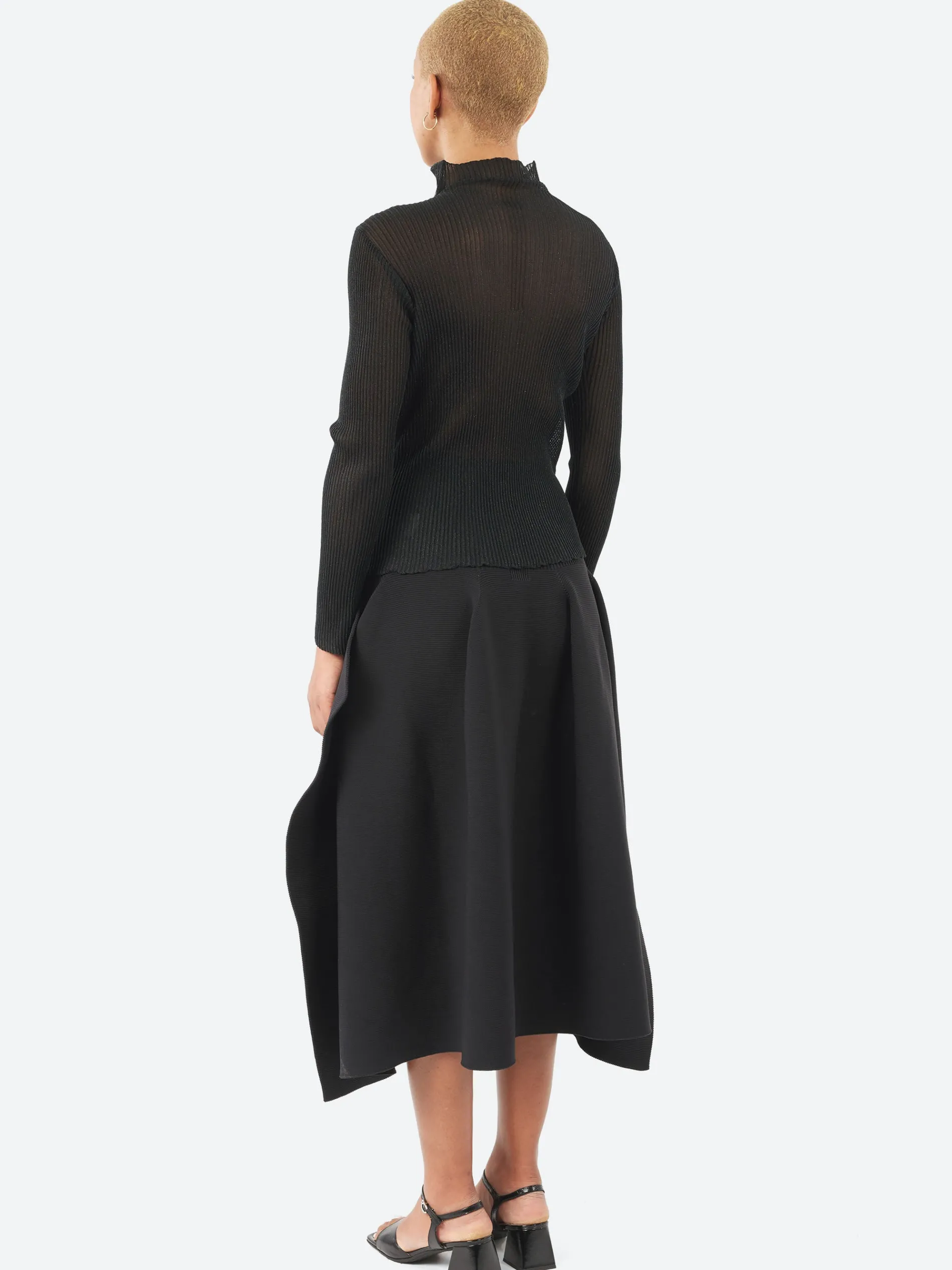 The CFCL Hypha Lucent Glitter Long Sleeve Top is designed with a unique pintuck knit structure combining sheer and opaque materials. It features a flared high-neck, a slim-fitting silhouette, and a seamless finish for a polished, contemporary style.