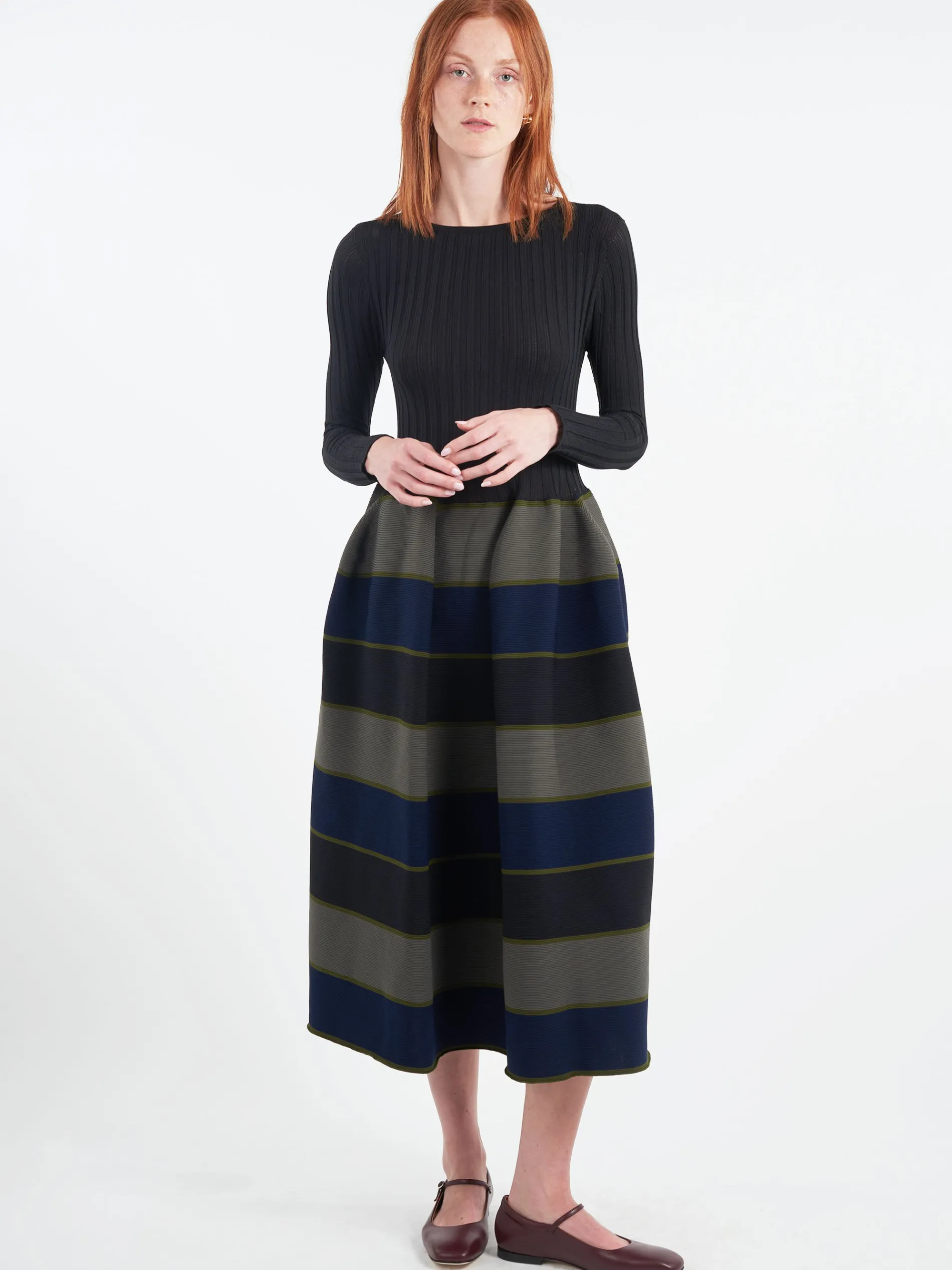 Inspired by the fine lines in ceramic pottery, this CFCL pleated dress’ voluminous constructed form is created by computer programming. The seamless knit is made entirely from recycled polyester.