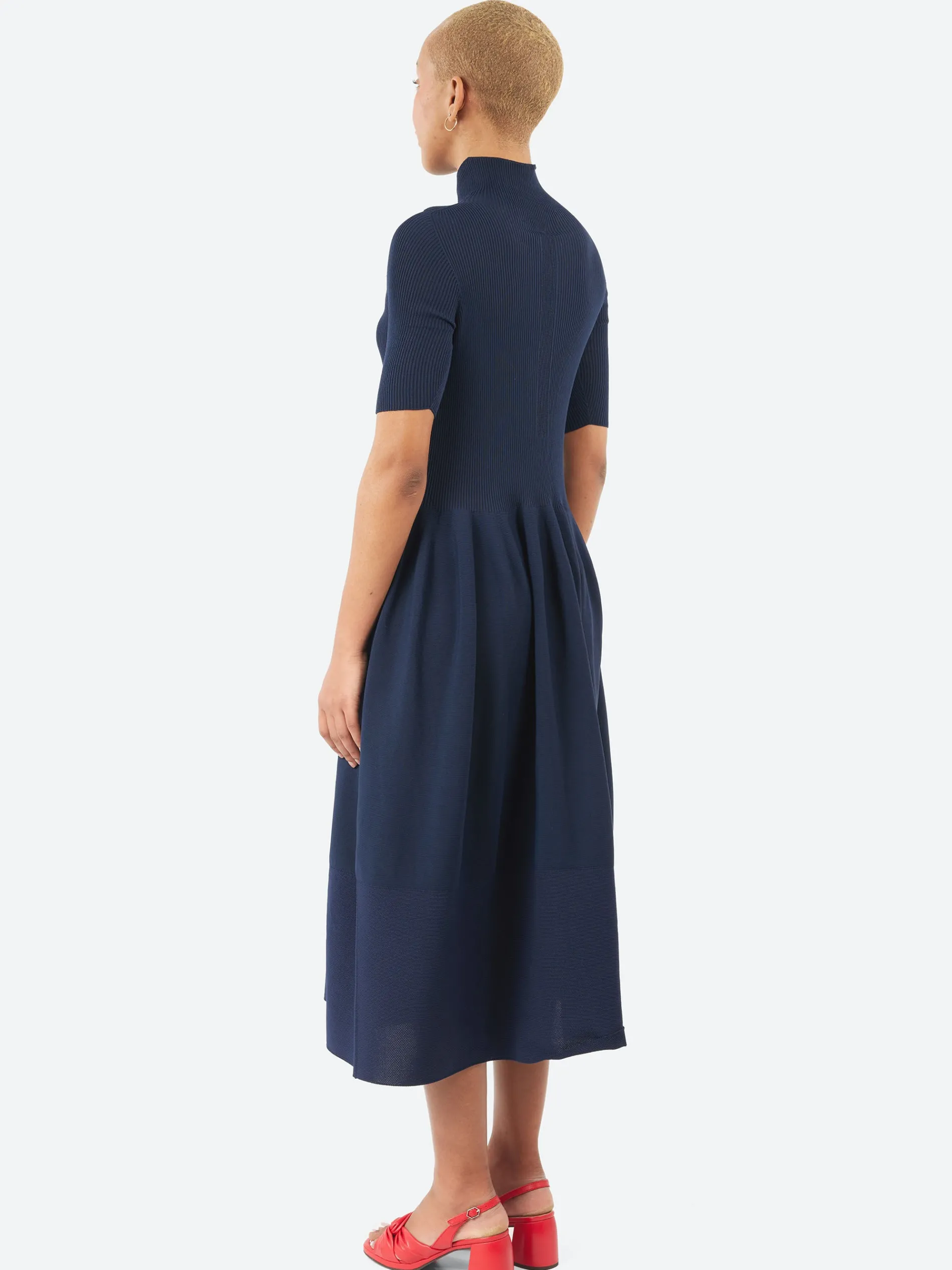 The CFCL Rivulet Short Sleeve Dress is crafted from a gathered knit construction designed through computer programming, creating a form-fitting silhouette. It features a solid hem, a seamless design, and a flattering midi-length for a sleek, contemporary look.
