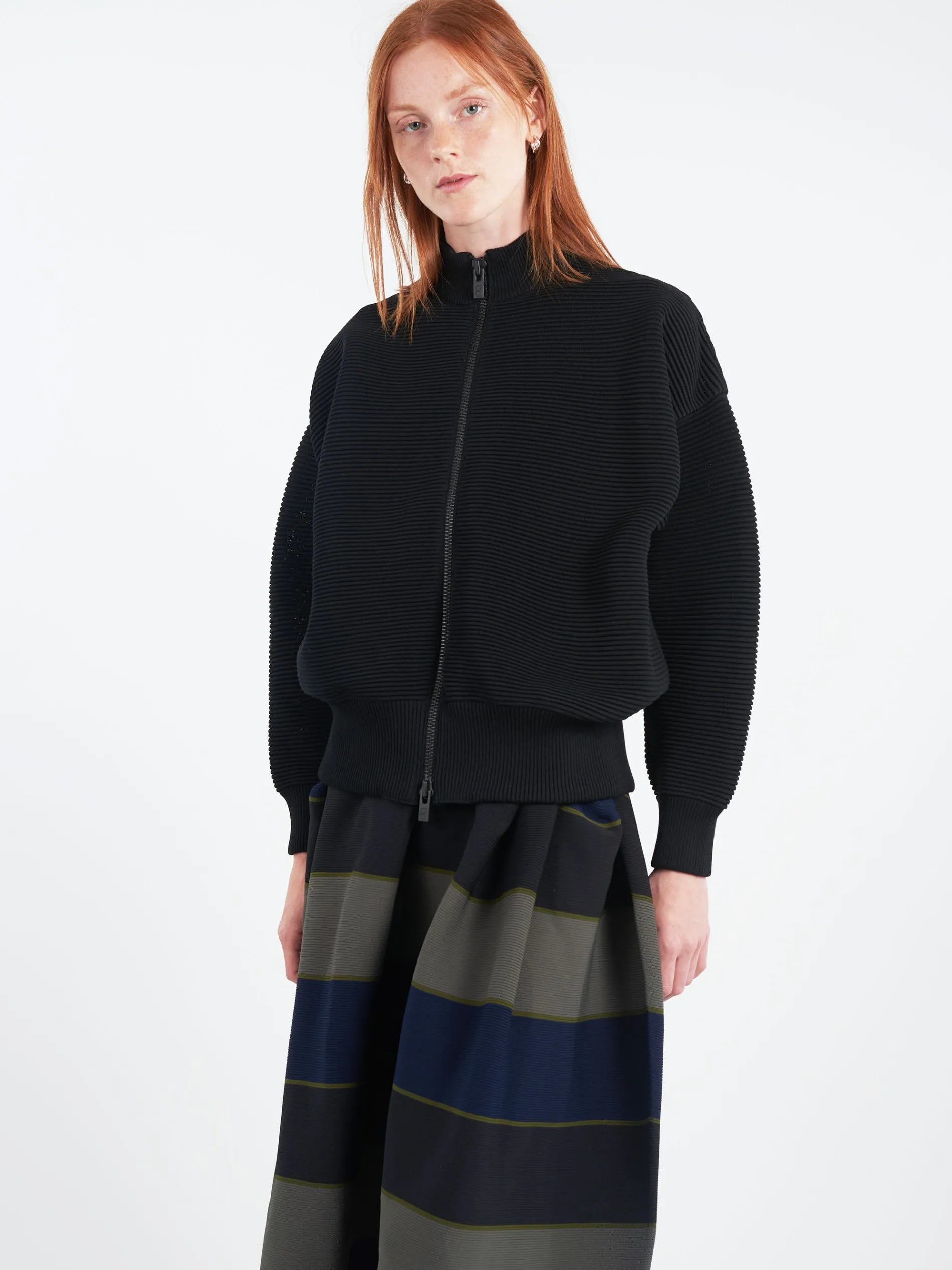This bomber jacket from CFCL has a textured pintuck knit structure. With its voluminous silhouette and high neck, it provides endless versatility.