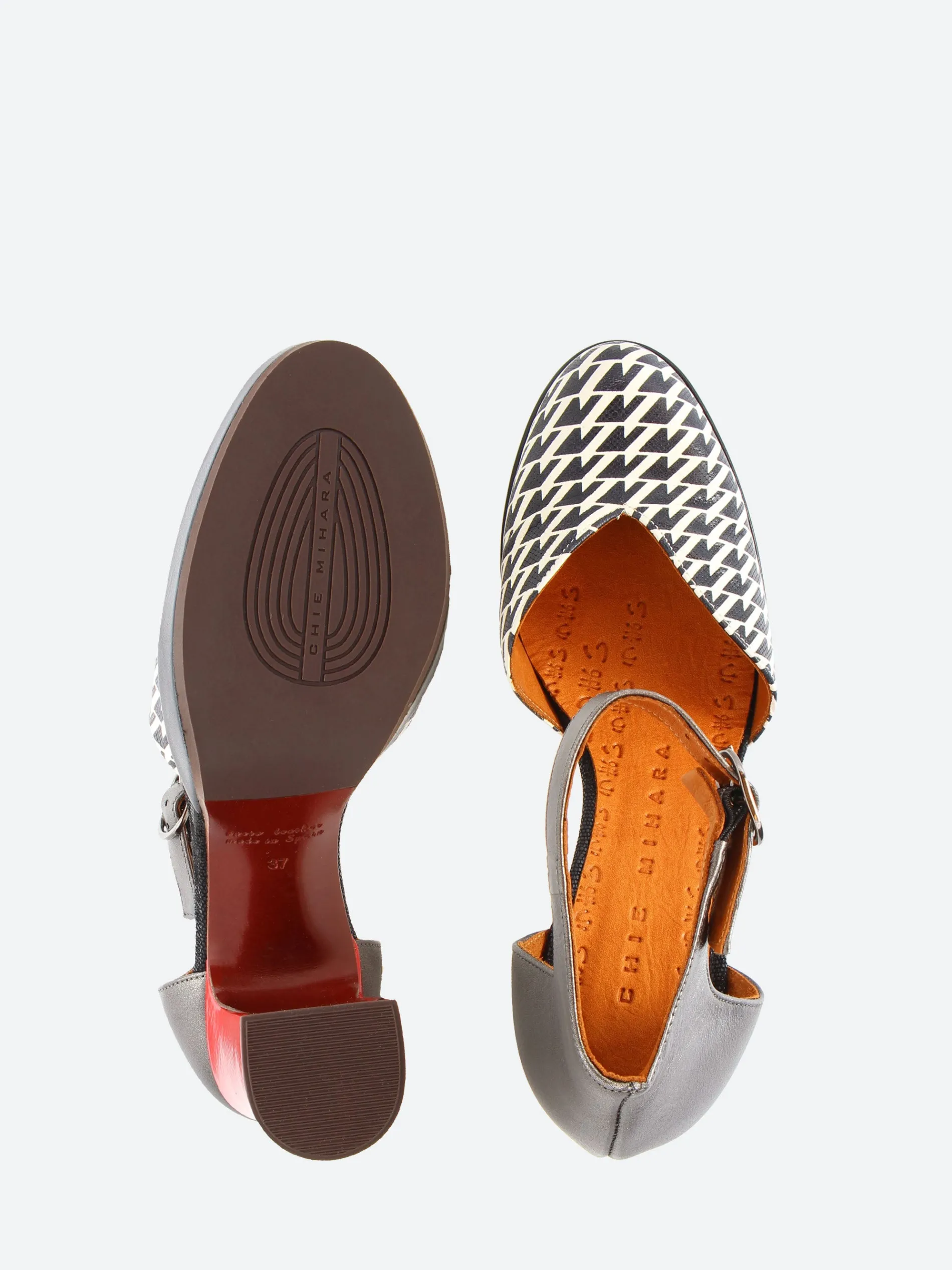 Chie Mihara Damaho, an ankle strapped shoe with a graphic-printed leather upper, sitting on a high, stacked heel.