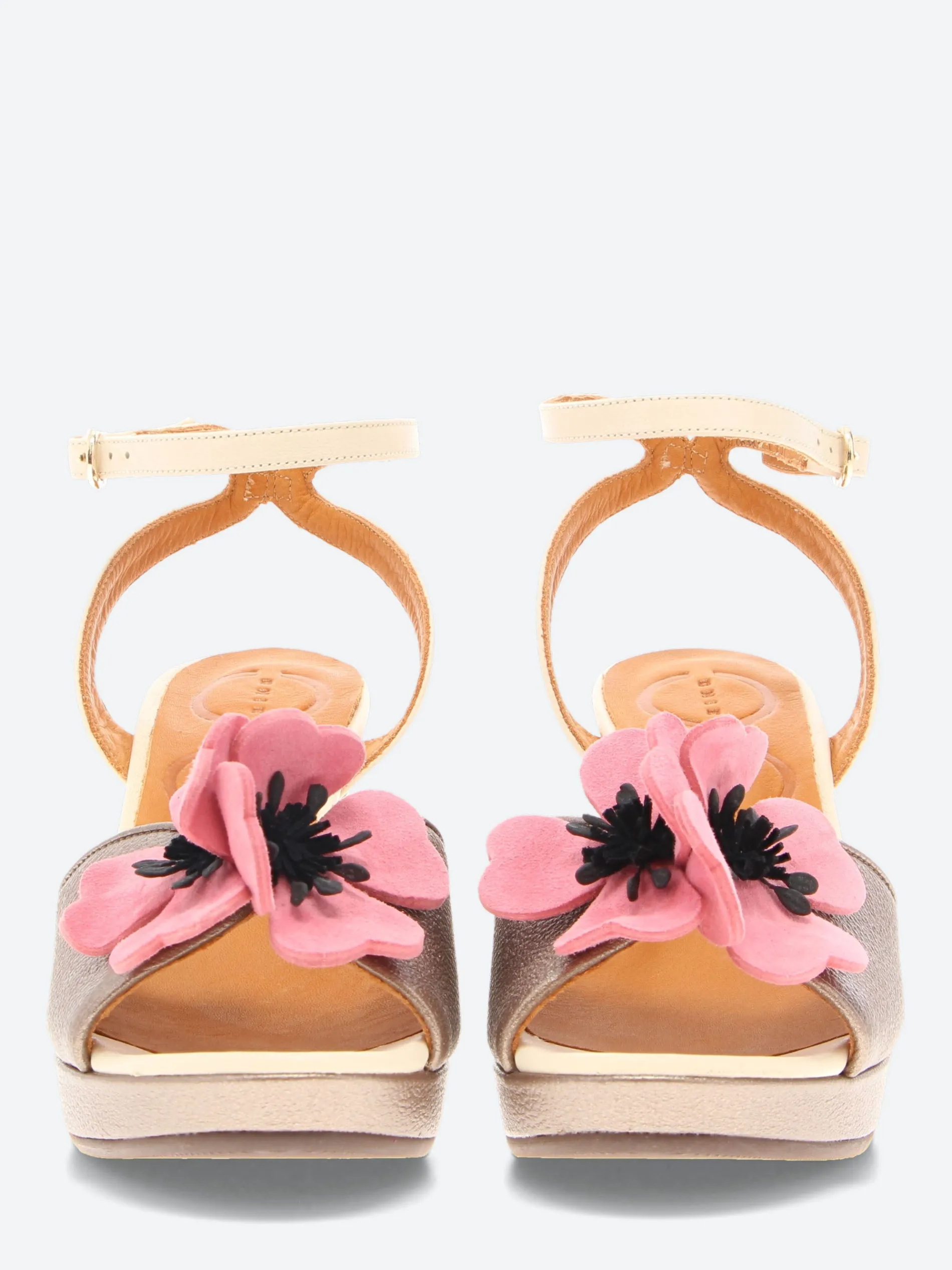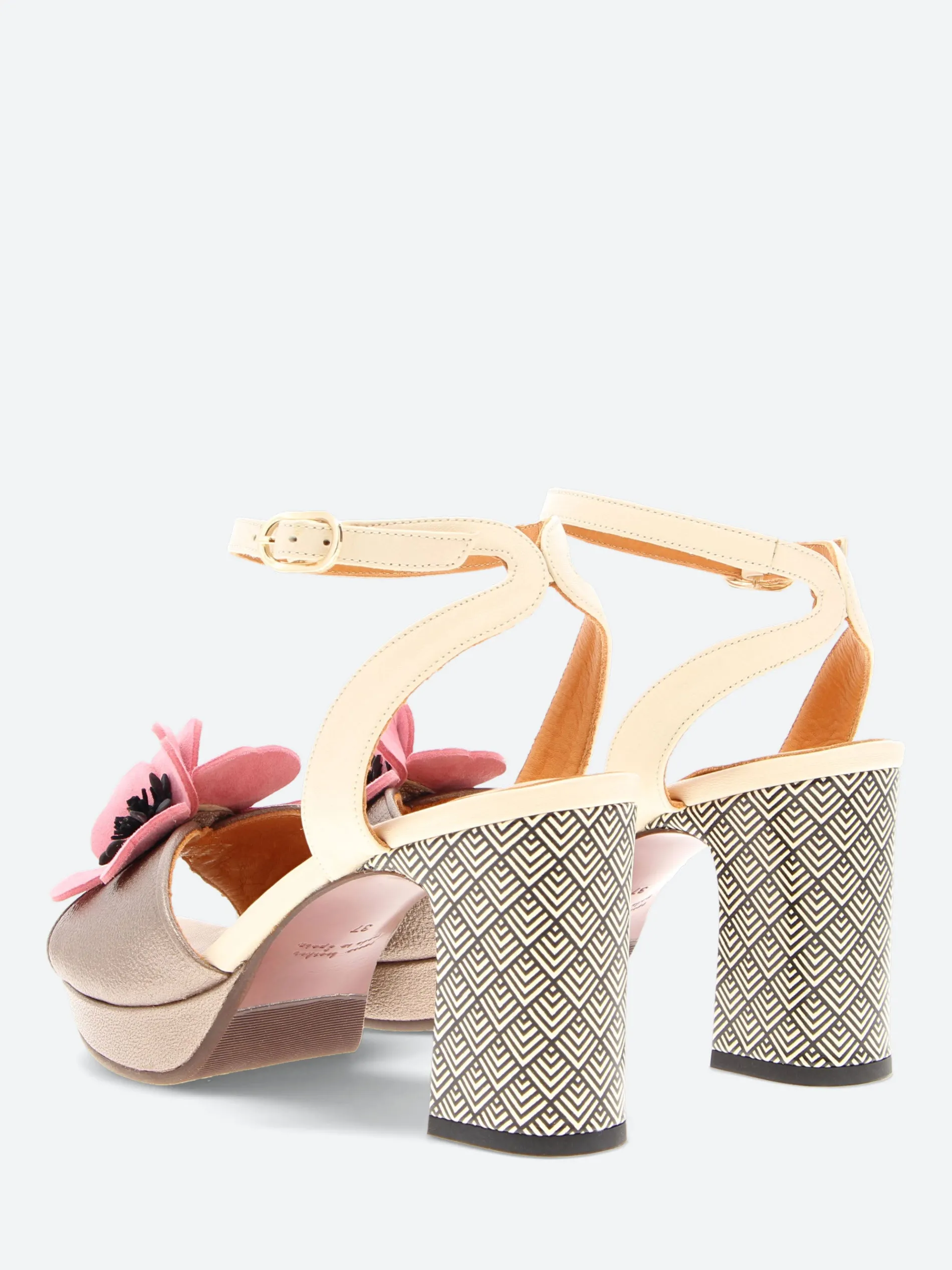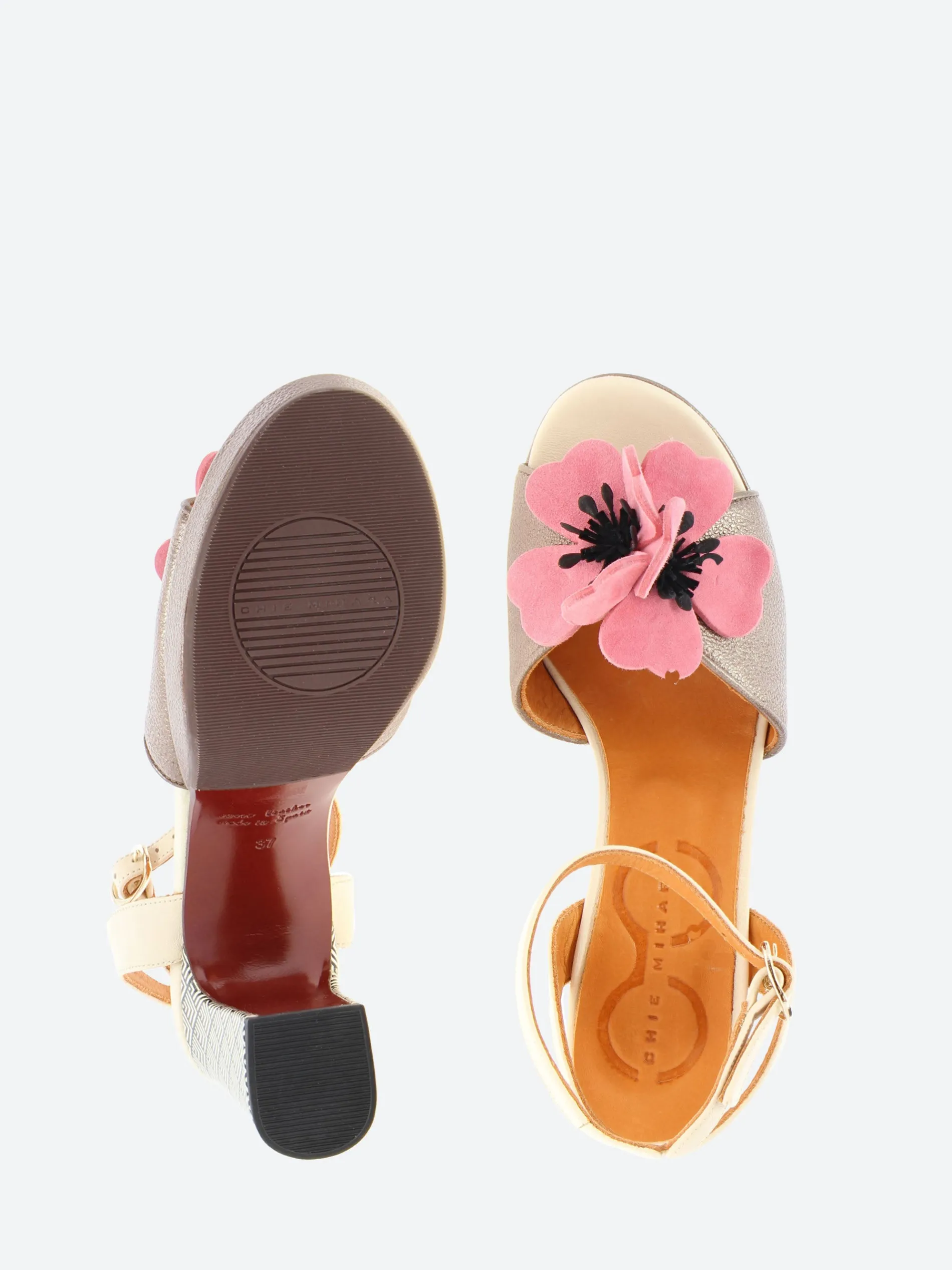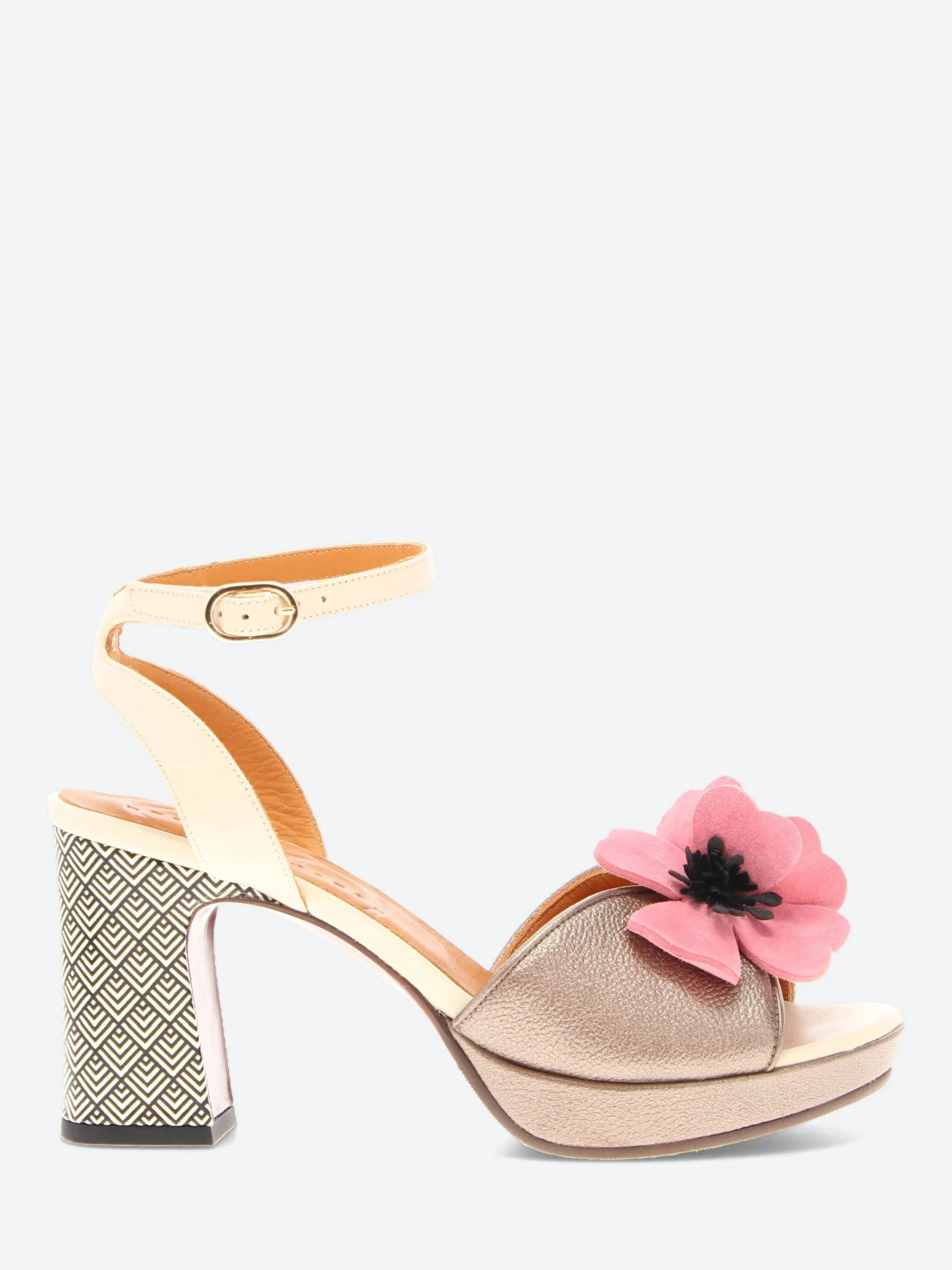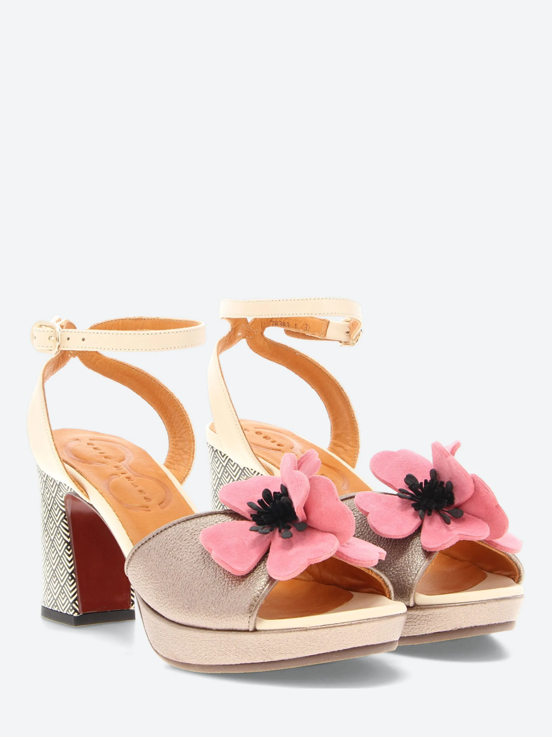 The Kaski sandal from Chie Mihara is a statement piece that combines bold design with exceptional comfort. Crafted from soft leather, it features a cross-ankle buckle closure strap and a floral applique on the toe piece, adding a touch of femininity. The sandal is designed with a 70 mm self-covered heel, offering a comfortable lift, and sits on a combination leather and rubber sole for durability and grip.