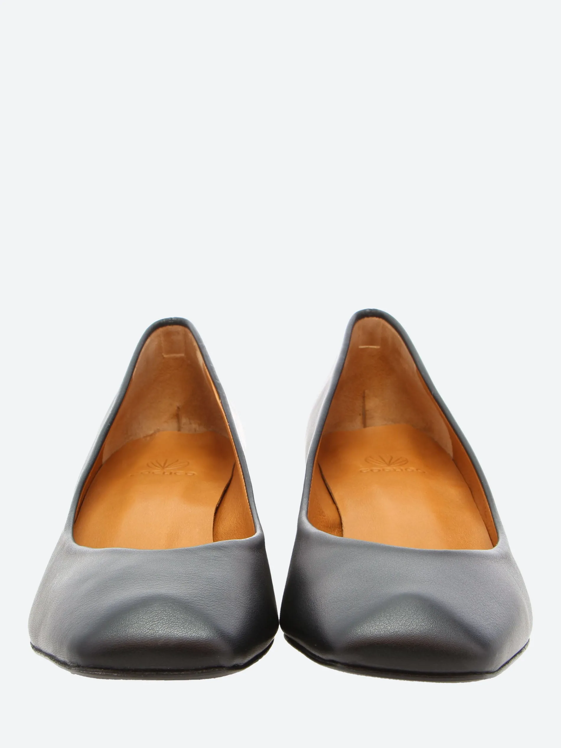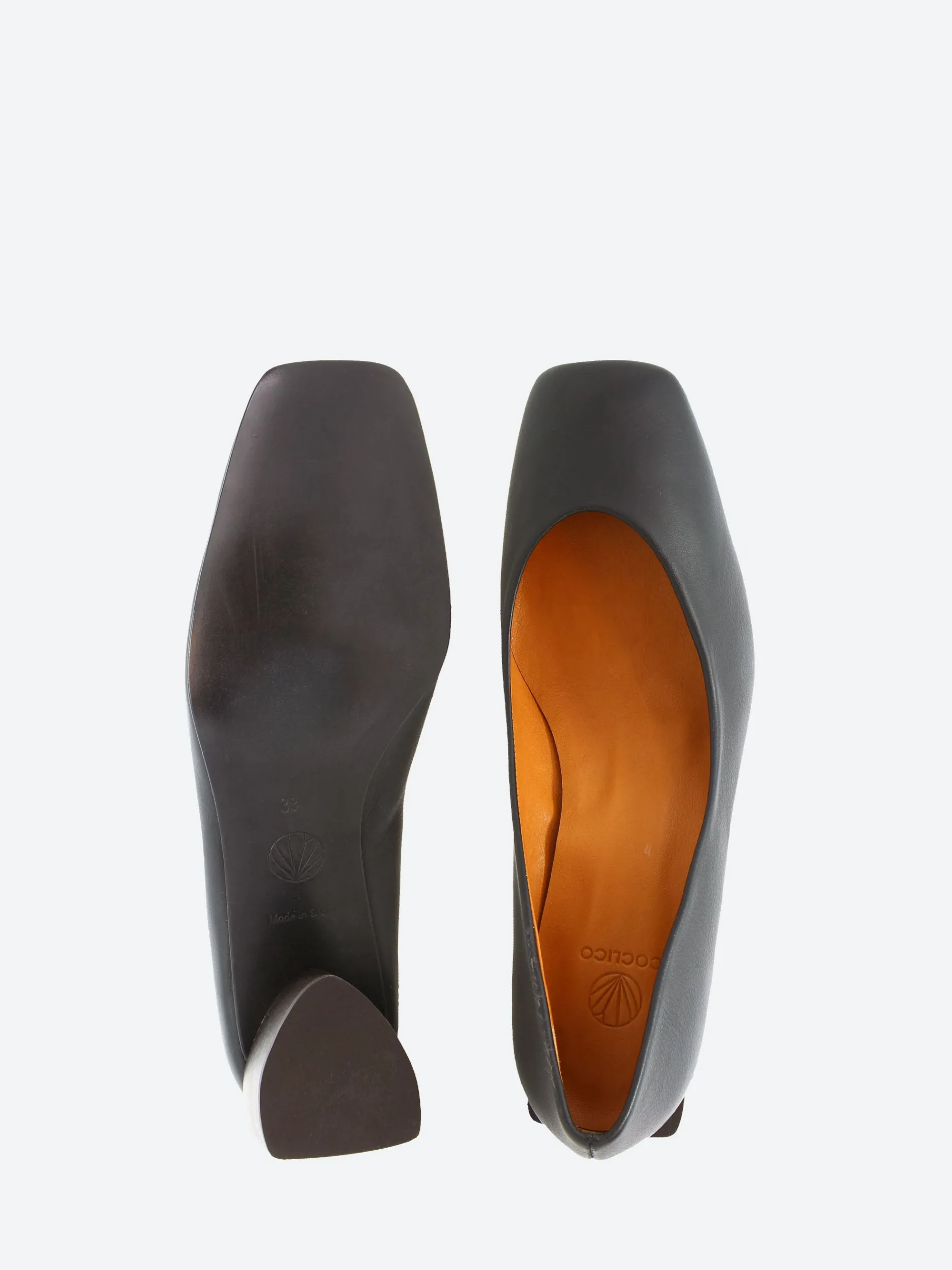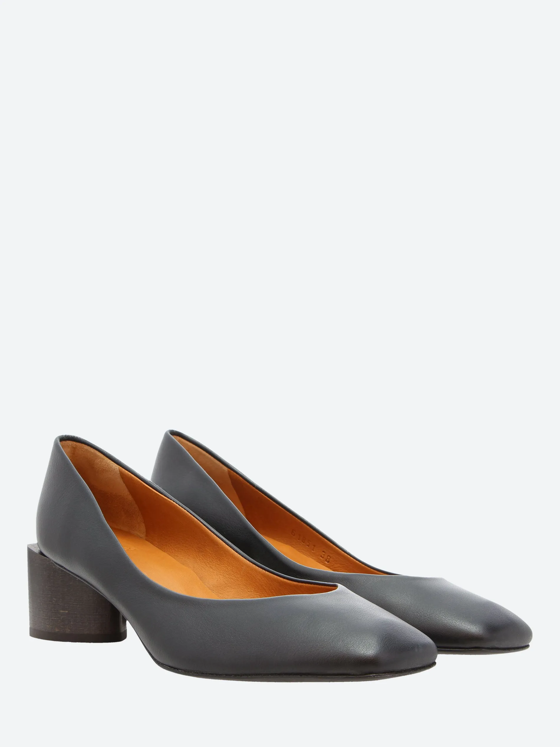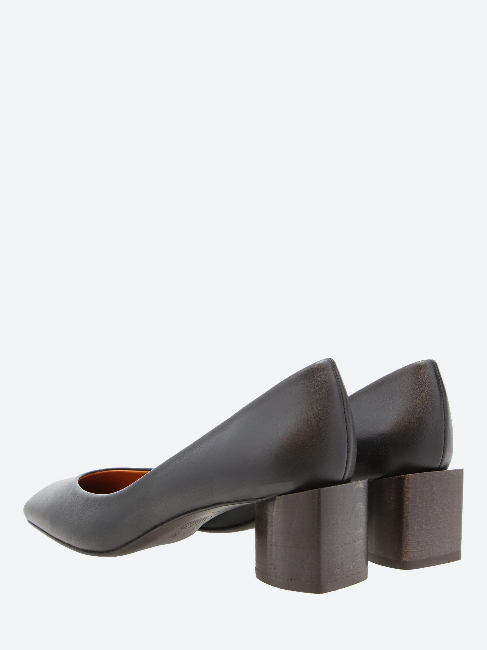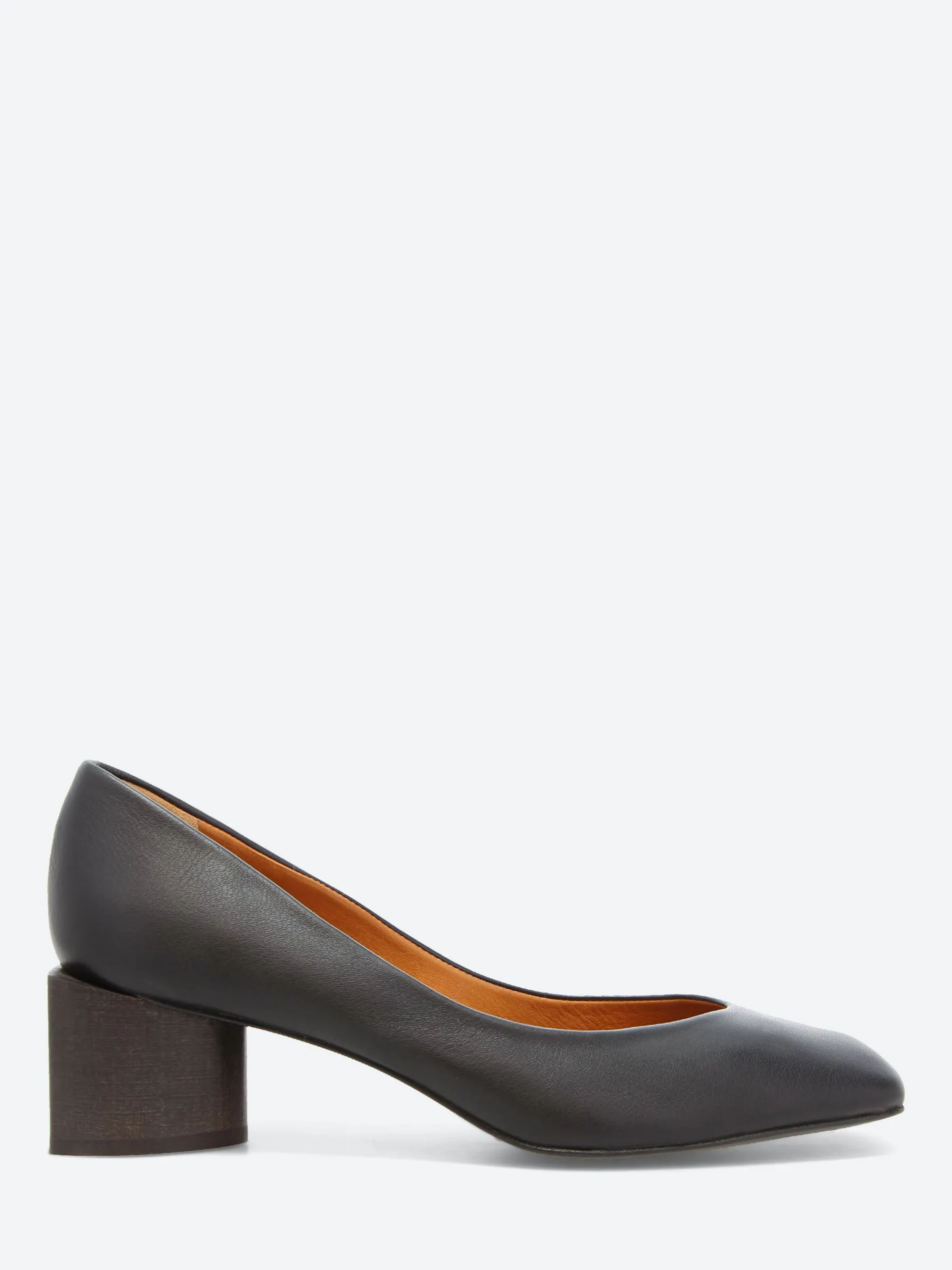 This classic and perfectly formed pump in a smooth leather is set apart from the crowd with its solid, architectural block wood heel.