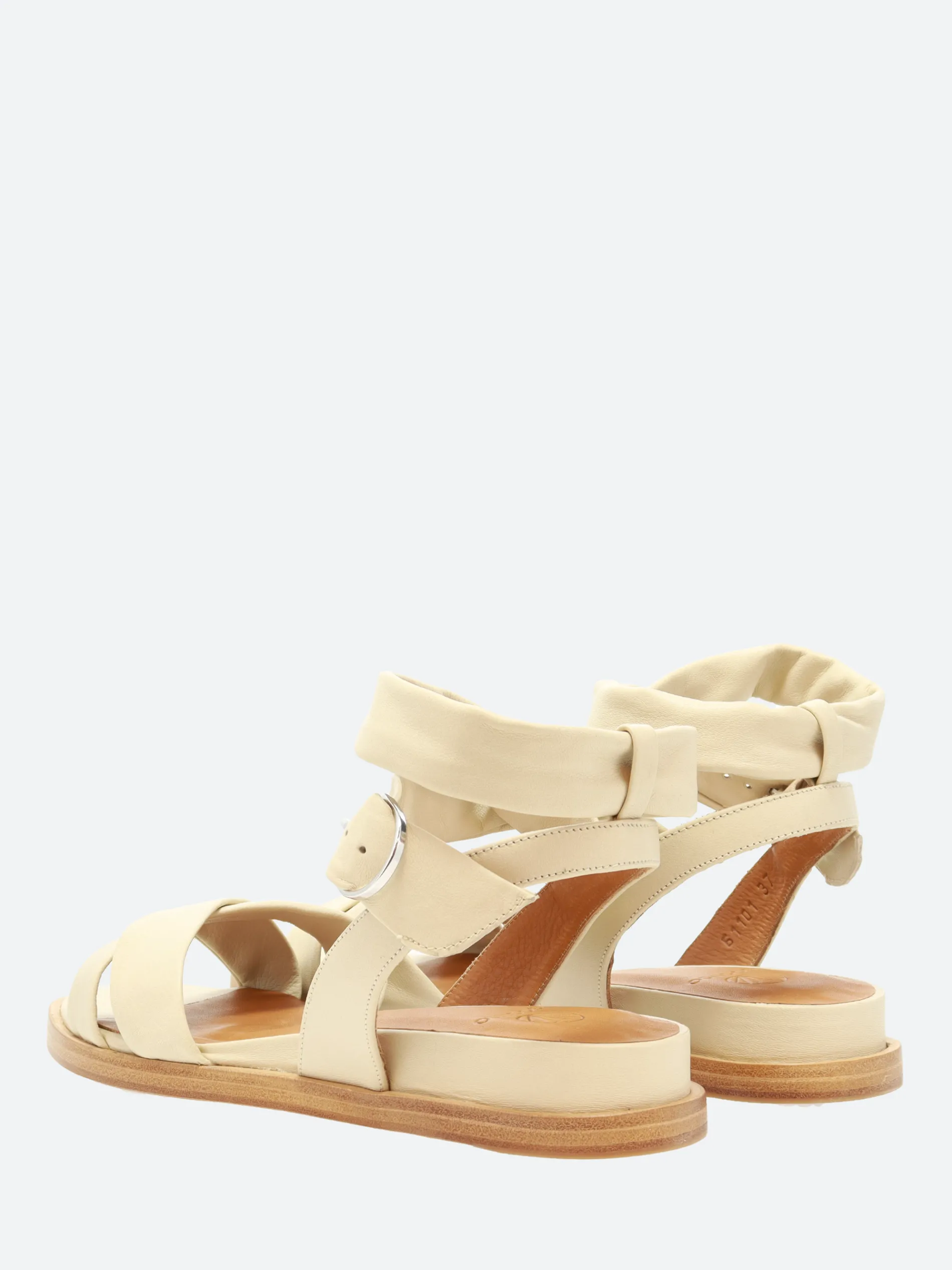 Supple tubular straps cross and support the foot and ankle. Inset leather wrapped wedge and a layered leather sole for urban style and durability.
