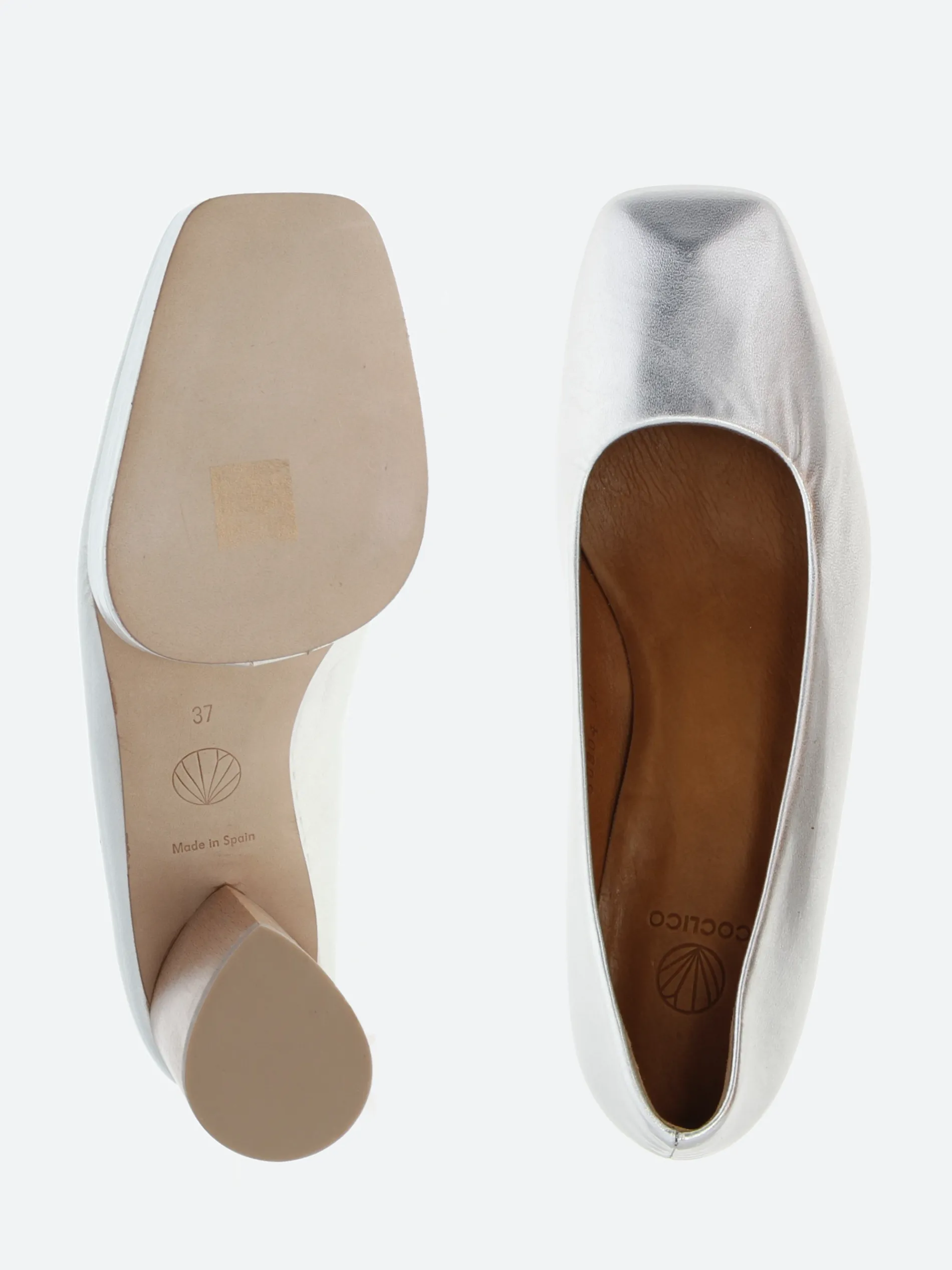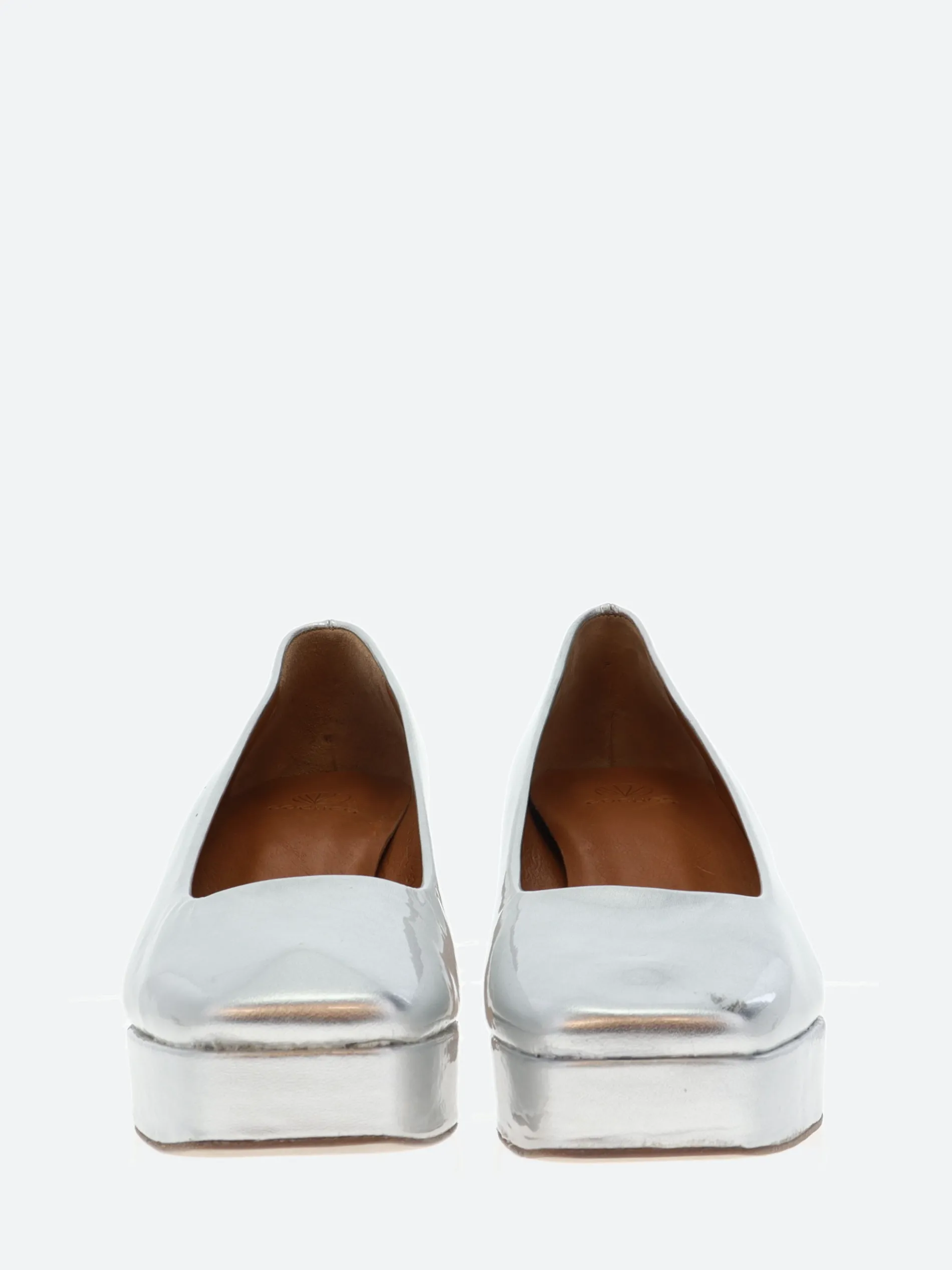 An elevated pump for an elevated look. Trinity is a classic pump silhouette with an artfully formed squared toe. The gently rounded triangular edges of the toe box are mirrored in the gently rounded wood heel. Features a leather covered wood platform. In a silvery antiqued patent leather that shines like the Milky Way.