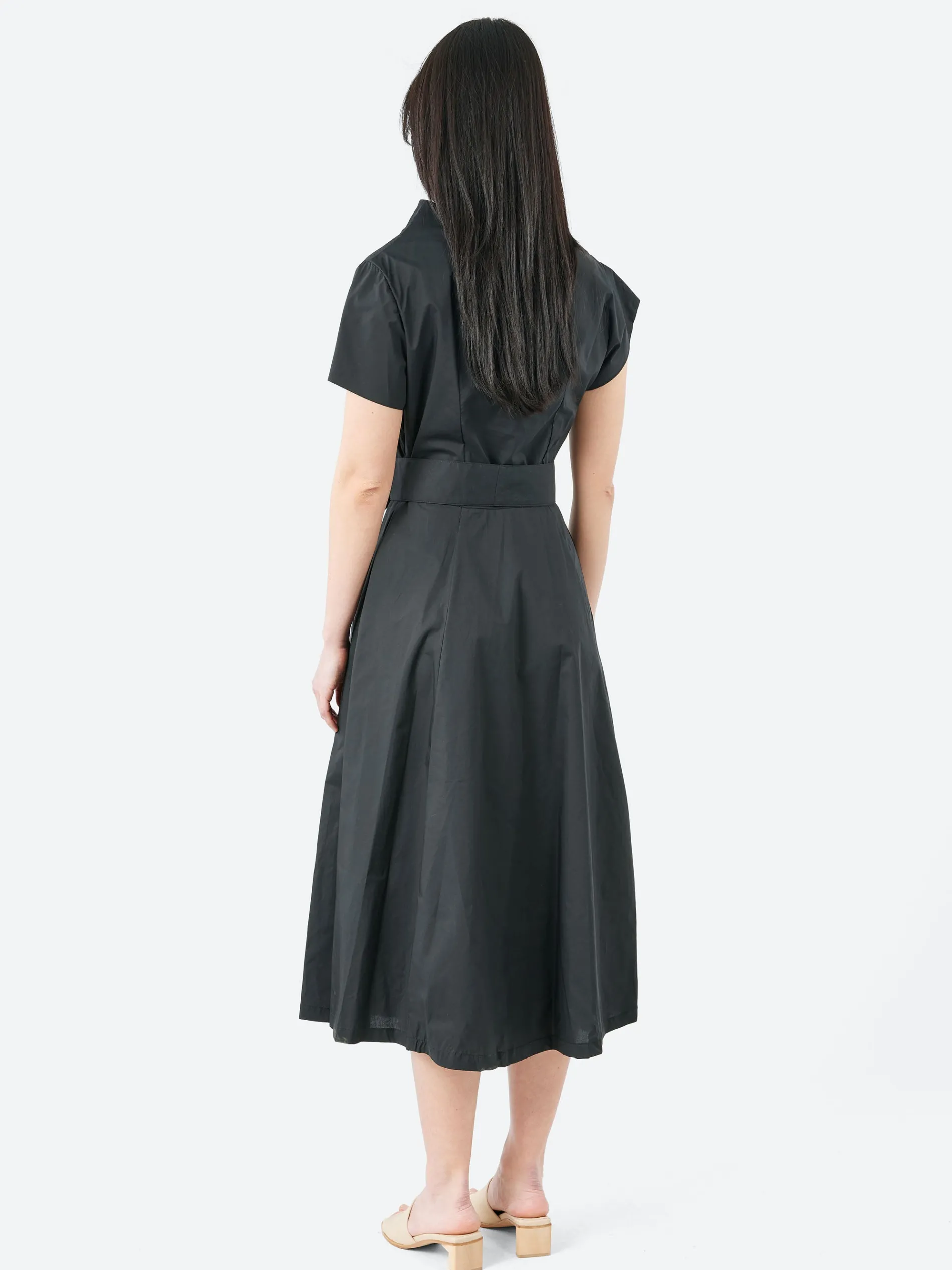 This elegant wrap-style dress features a flattering front overlay and a belt detail that accentuates the waist for a structured silhouette. With its short sleeves and timeless color, it’s a versatile piece suited for both day and evening occasions. Effortlessly chic, this dress is a go-to option for everything from work events to formal gatherings.