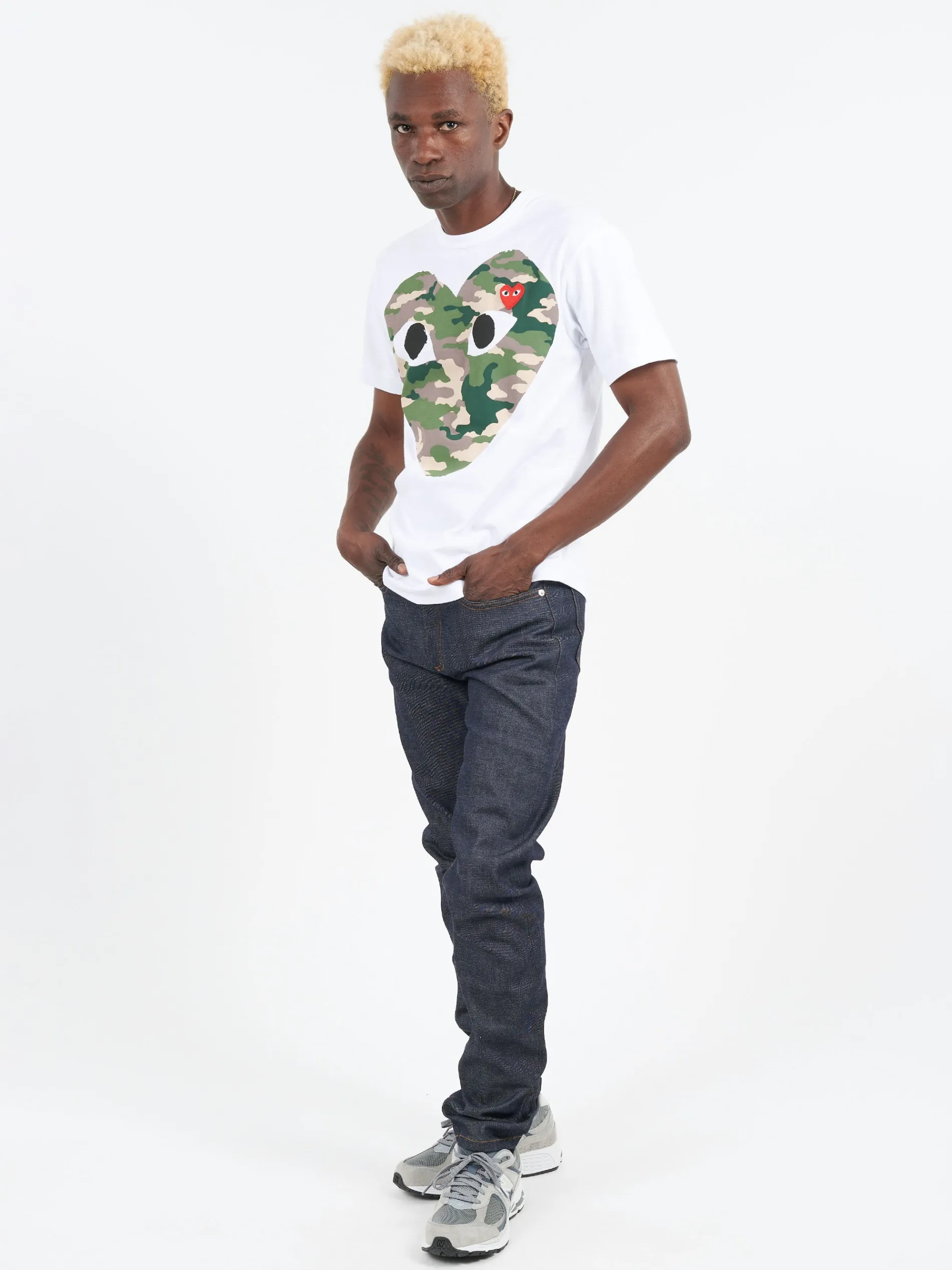 - Large signature camo heart print at chest