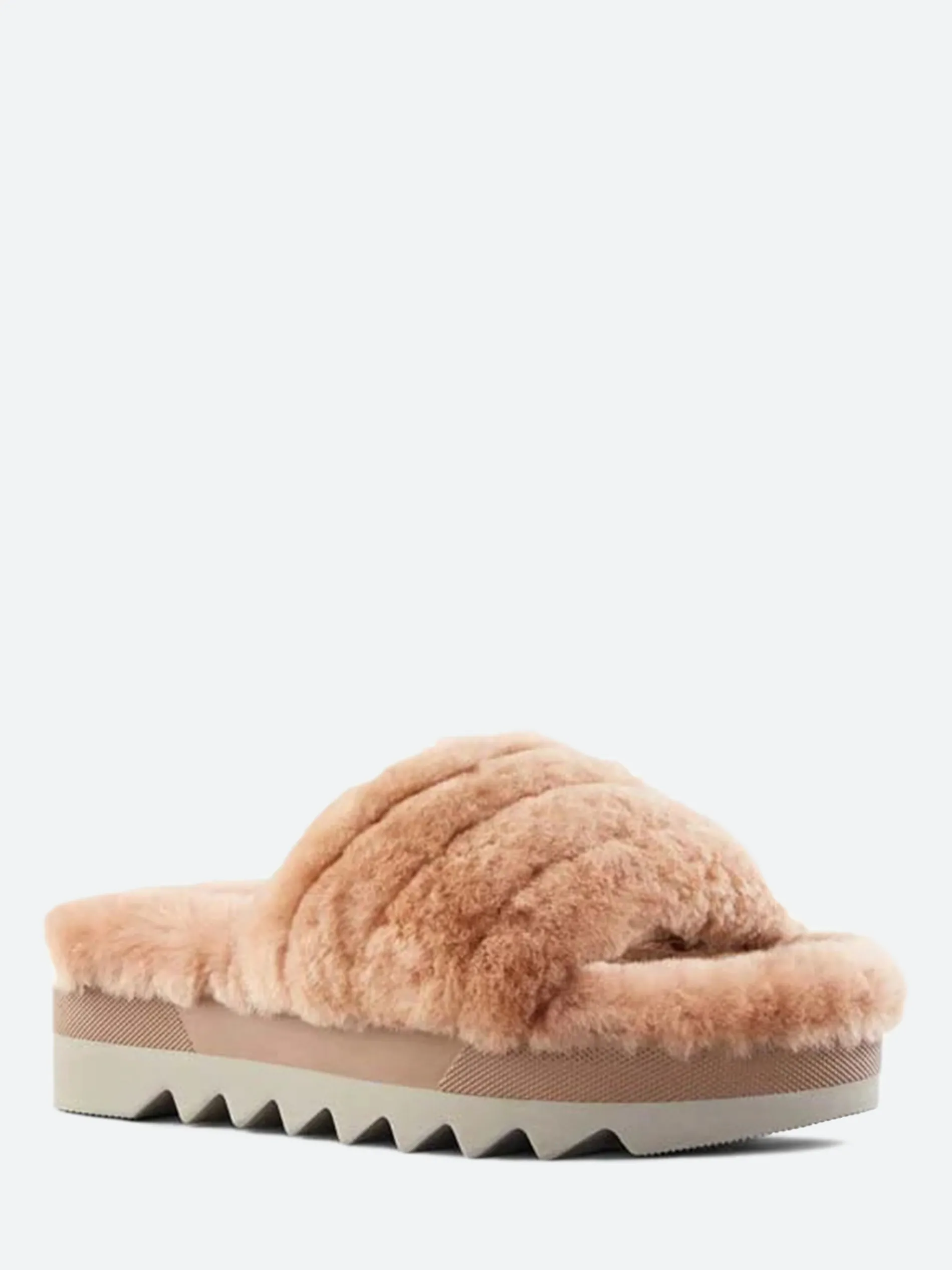 Luxury open toe slide sandal with soft padded genuine Lambswool strap and lining.