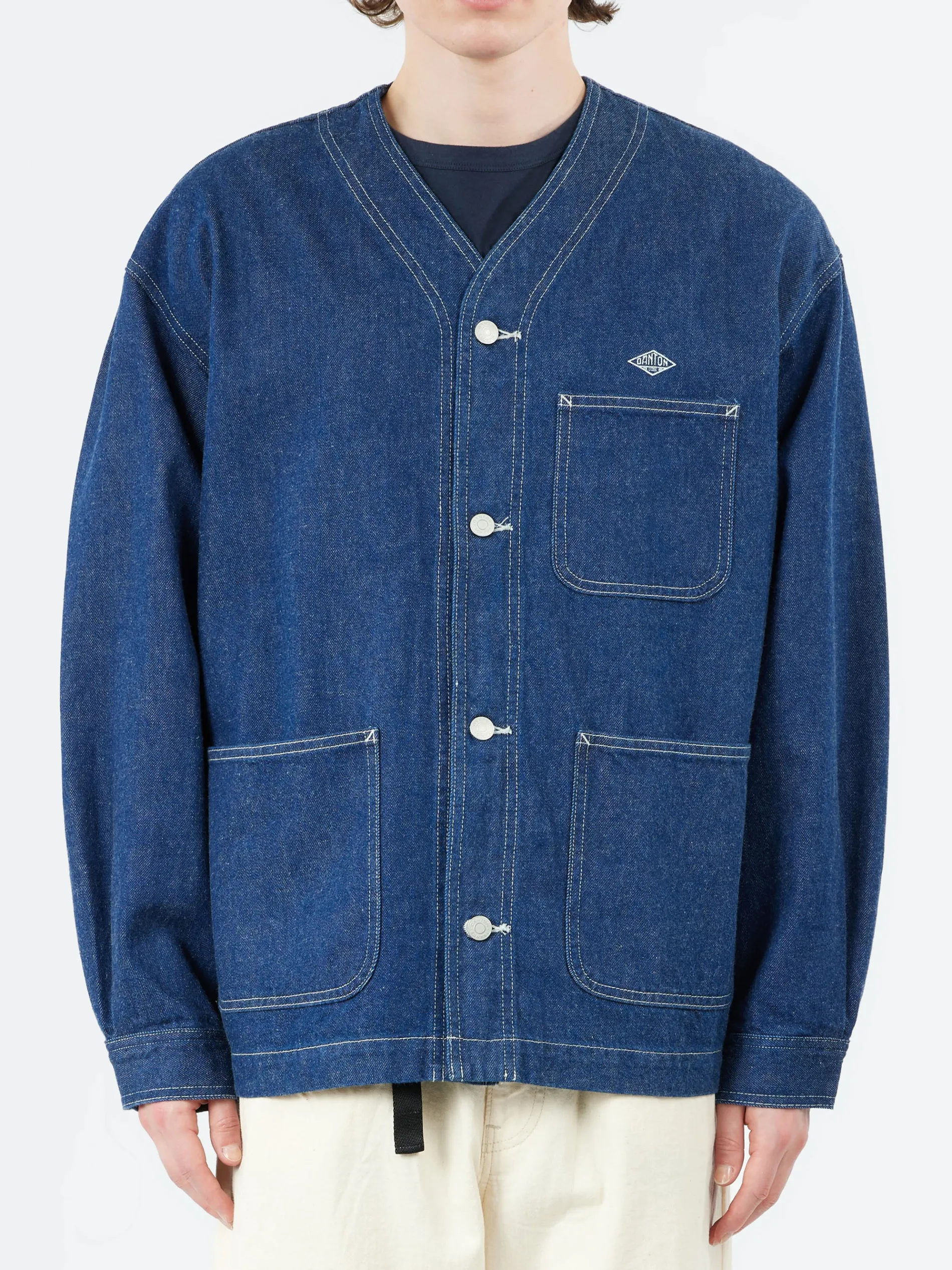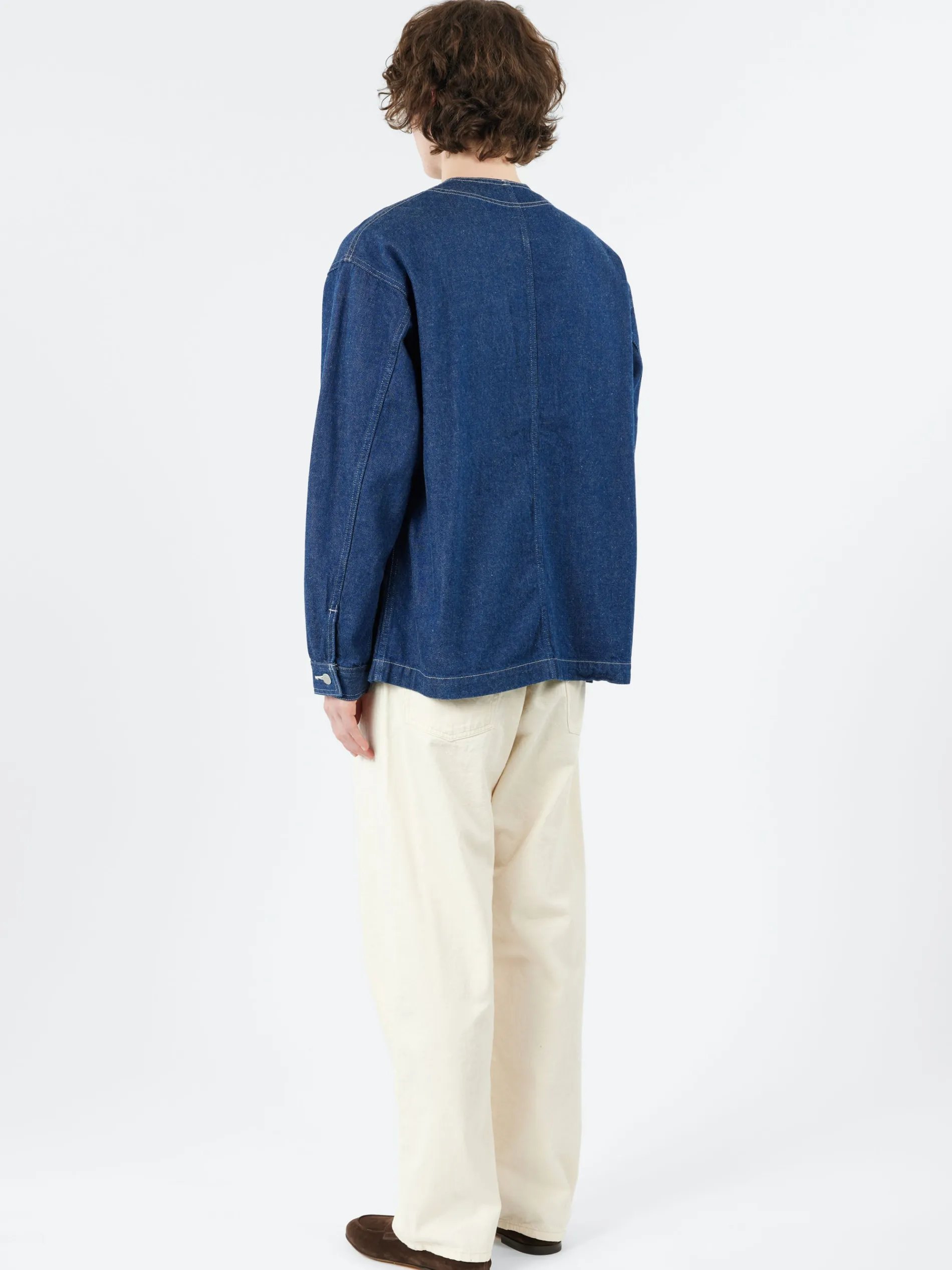 The Danton denim collarless jacket is made from 11-oz denim fabric, offering a soft, vintage-like texture woven with slub yarn. This classic coverall is reimagined with a modern touch, combining timeless style with contemporary design. The jacket is finished with buttons engraved with the Danton logo, adding a subtle yet refined detail.