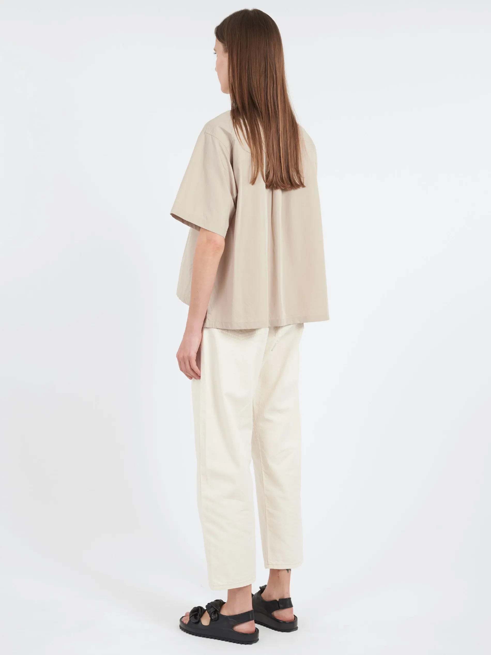 Half-sleeved shirt with loose boxy silhouette made from a cotton poplin fabric made from Supima cotton.