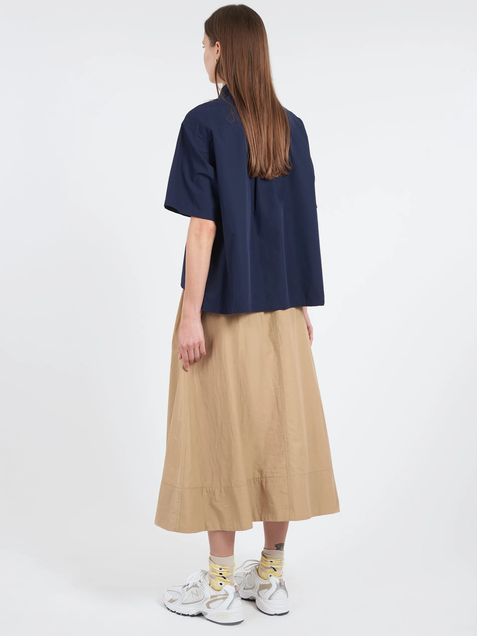 Half-sleeved shirt with loose boxy silhouette made from a cotton poplin fabric made from Supima cotton.