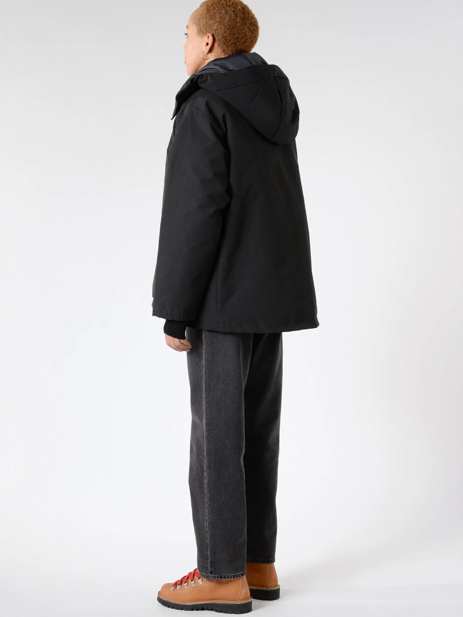 Danton hooded down jacket with an A-line silhouette. Made from a polyester-cotton blended tussah fabric.