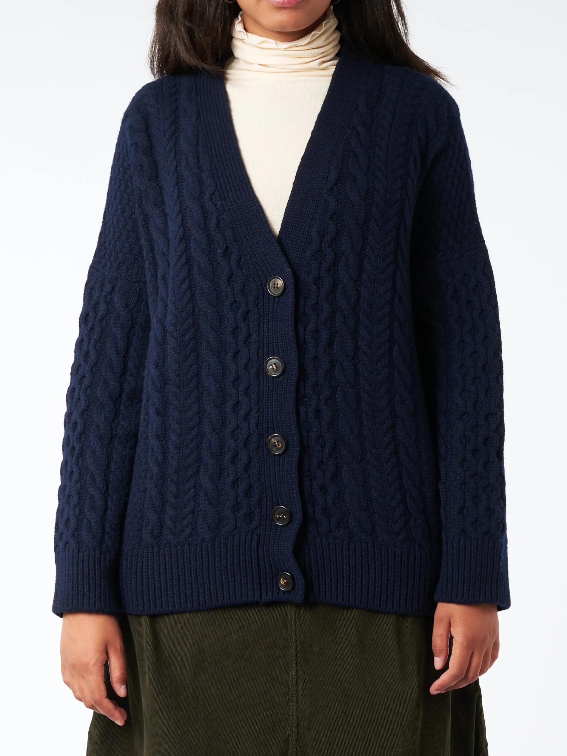 u0026amp;Daughter cardigan is an easy to wear aran knit that is subtly oversized and effortless. Cut from a lofty 6 ply British spun geelong lambswool resulting in a super soft tactile touch.
