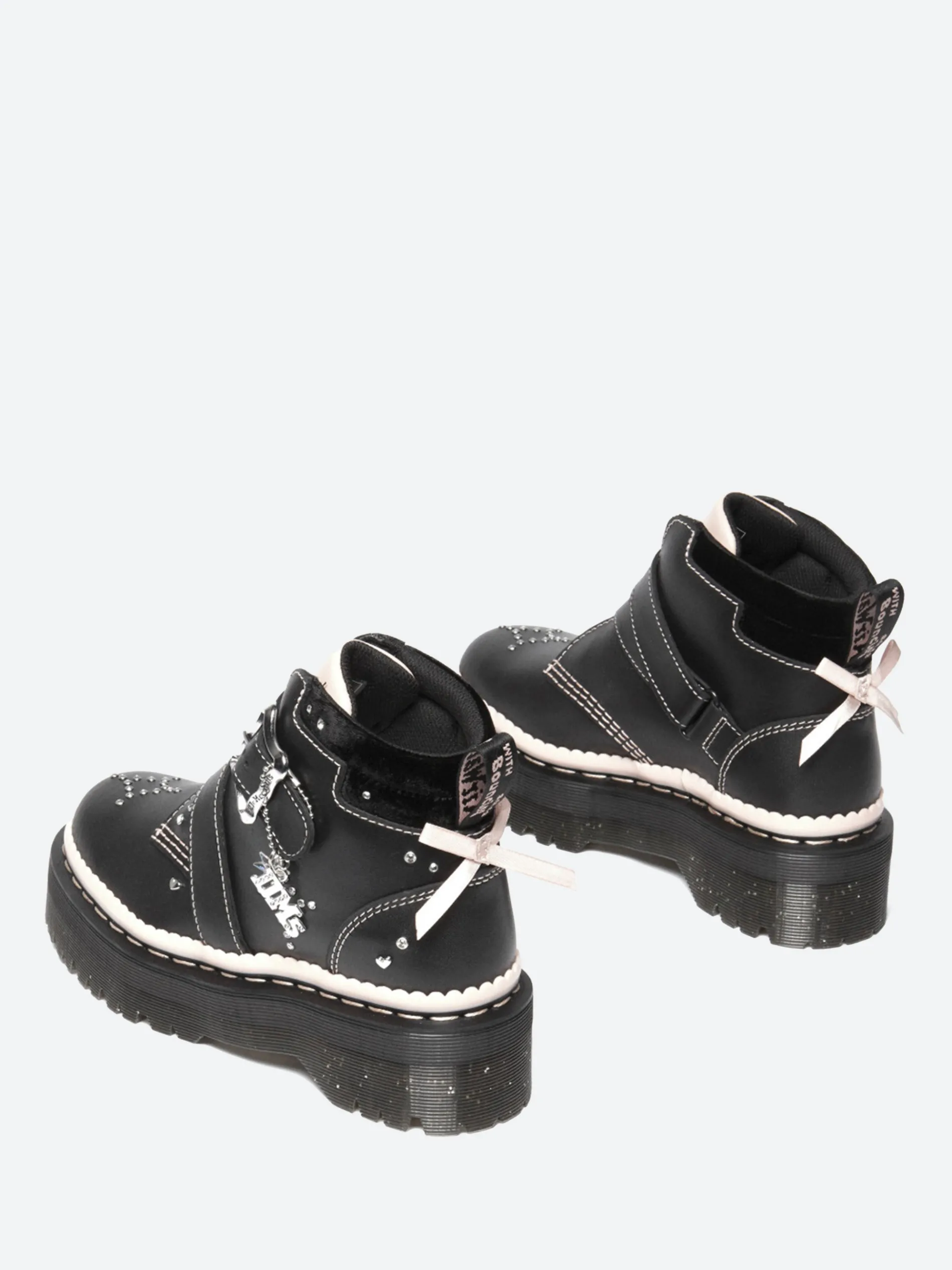 The new Caitie boot is covered heel to toe with playful details and bursts of color. A shiny silver buckle, DM’s branded charm, velvet ribbons, embroidery, and diamante detailing. With padding around the ankle and a statement pink tongue. The platform Quad sole is infused with glitter, secured with powder pink welt stitching, and detailed with a powder pink scalloped rand. The heel loop is also signed in powder pink script.