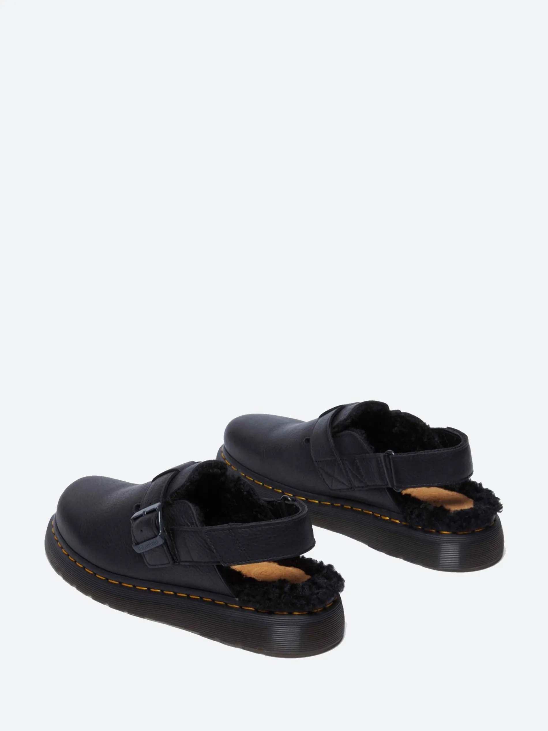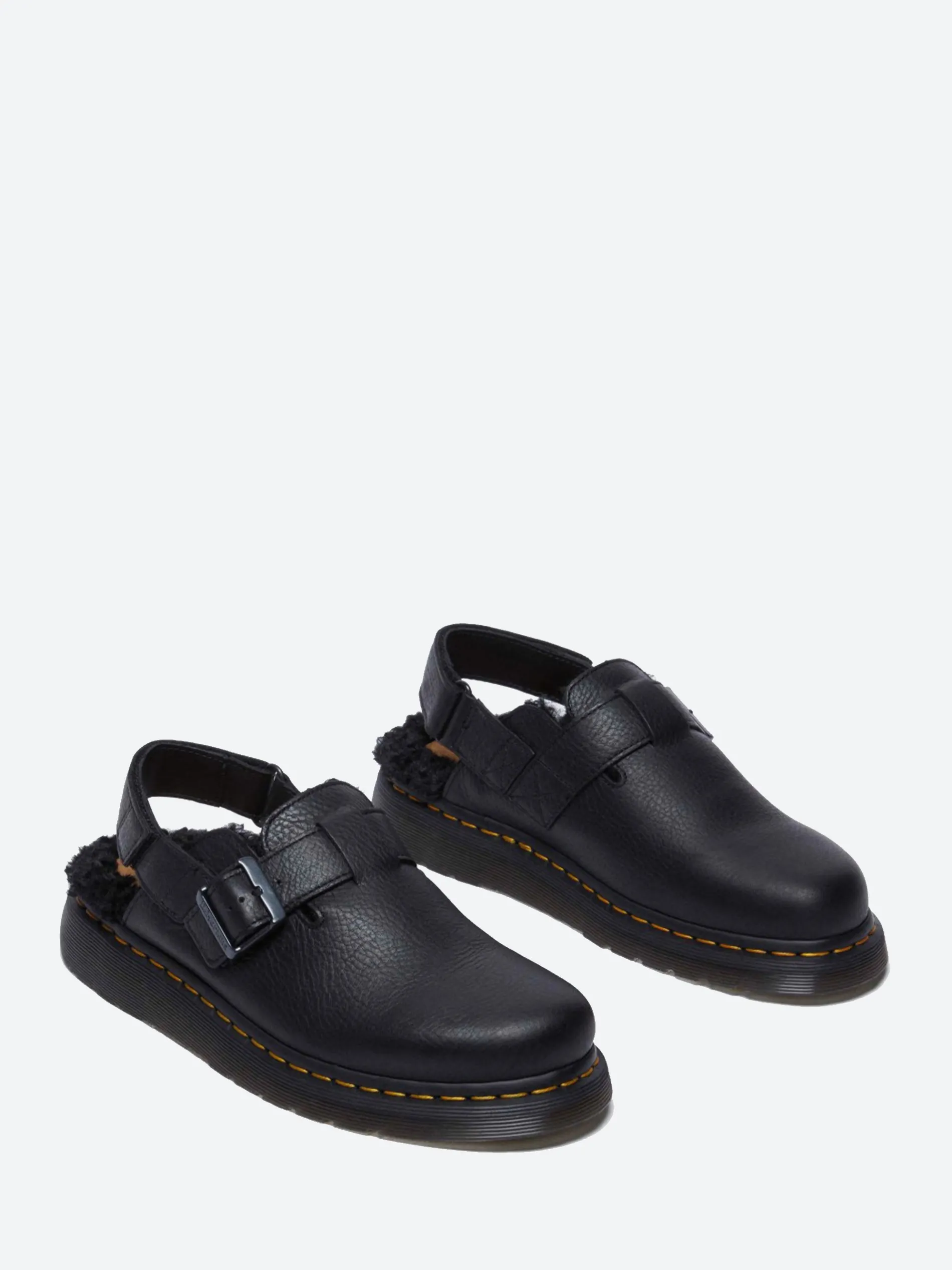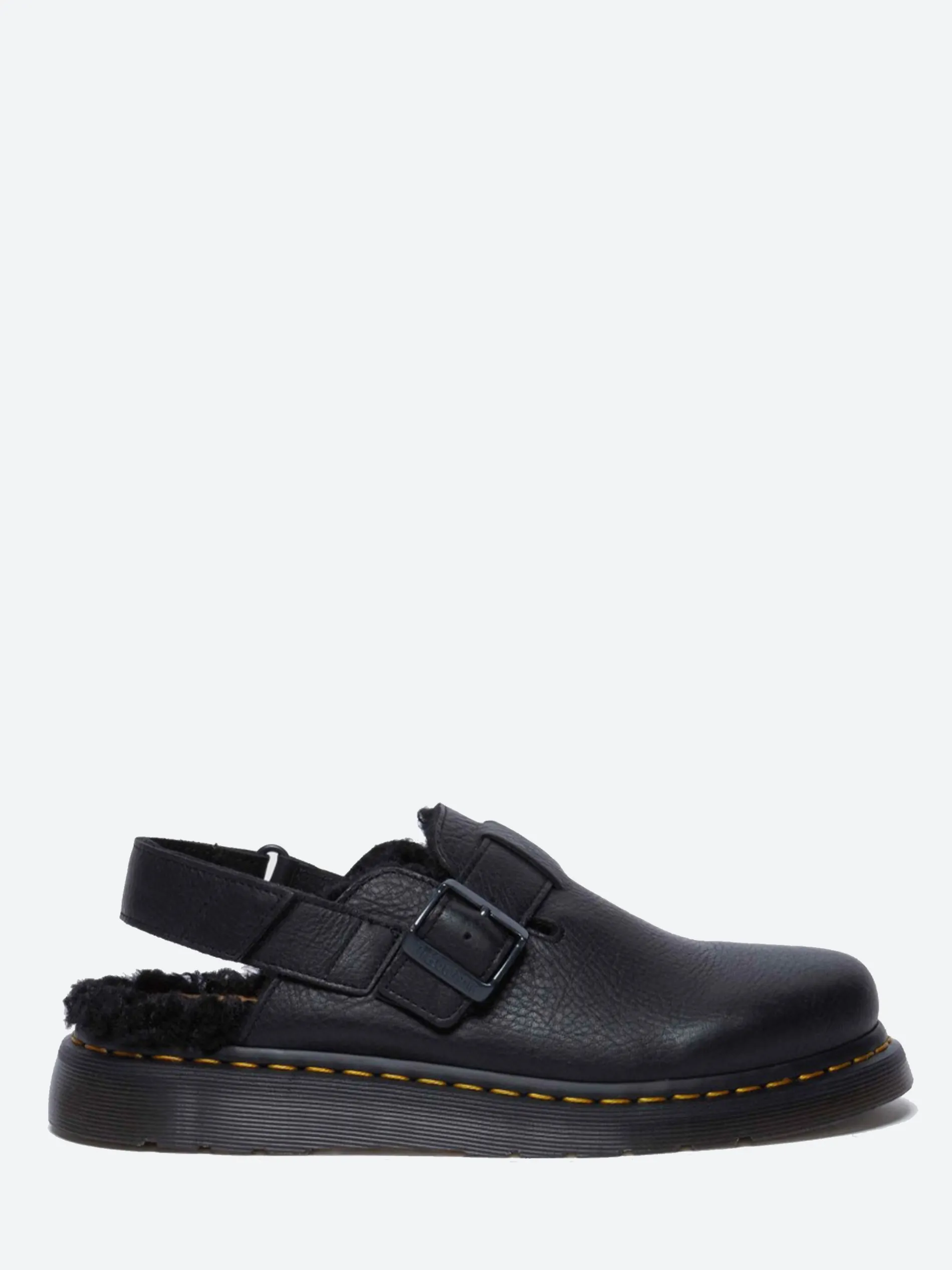 Dr. Martens Jorge II is a timeless slingback mule made with their tumbled Ambassador oiled black leather, lined with borg faux fur.