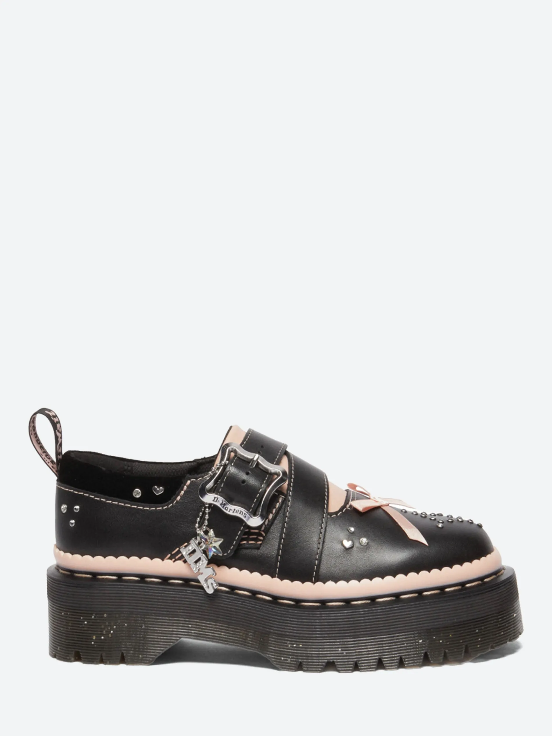 Dr. Martens new Kemsley shoe is covered heel to toe with playful details and bursts of color. A shiny silver buckle, DM’s branded charm, velvet ribbons, embroidery, and diamante detailing. With padding around the ankle and a statement pink tongue. The platform Quad sole is infused with glitter, secured with powder pink welt stitching, and detailed with a powder pink scalloped rand. The heel loop is also signed in powder pink script.