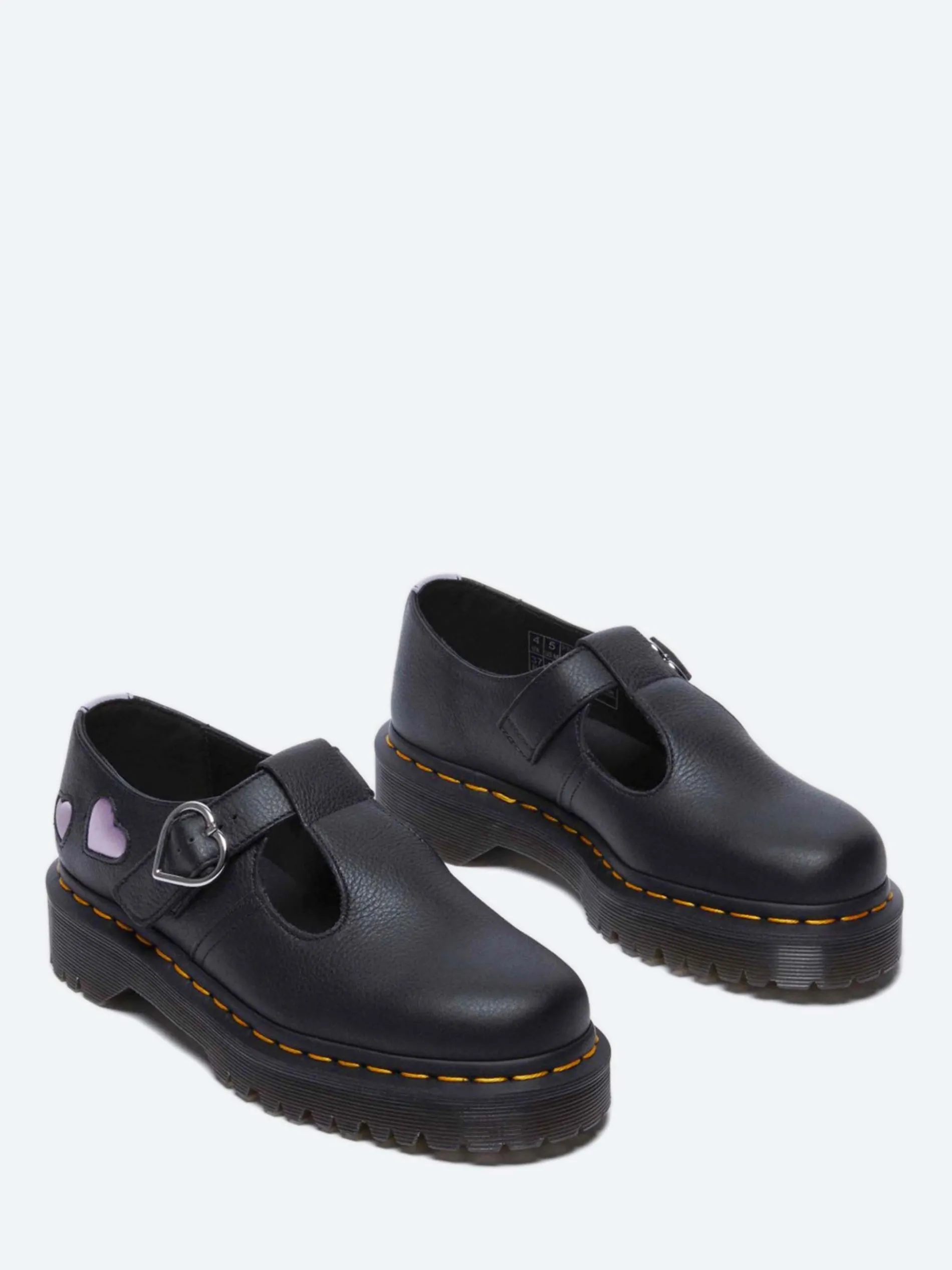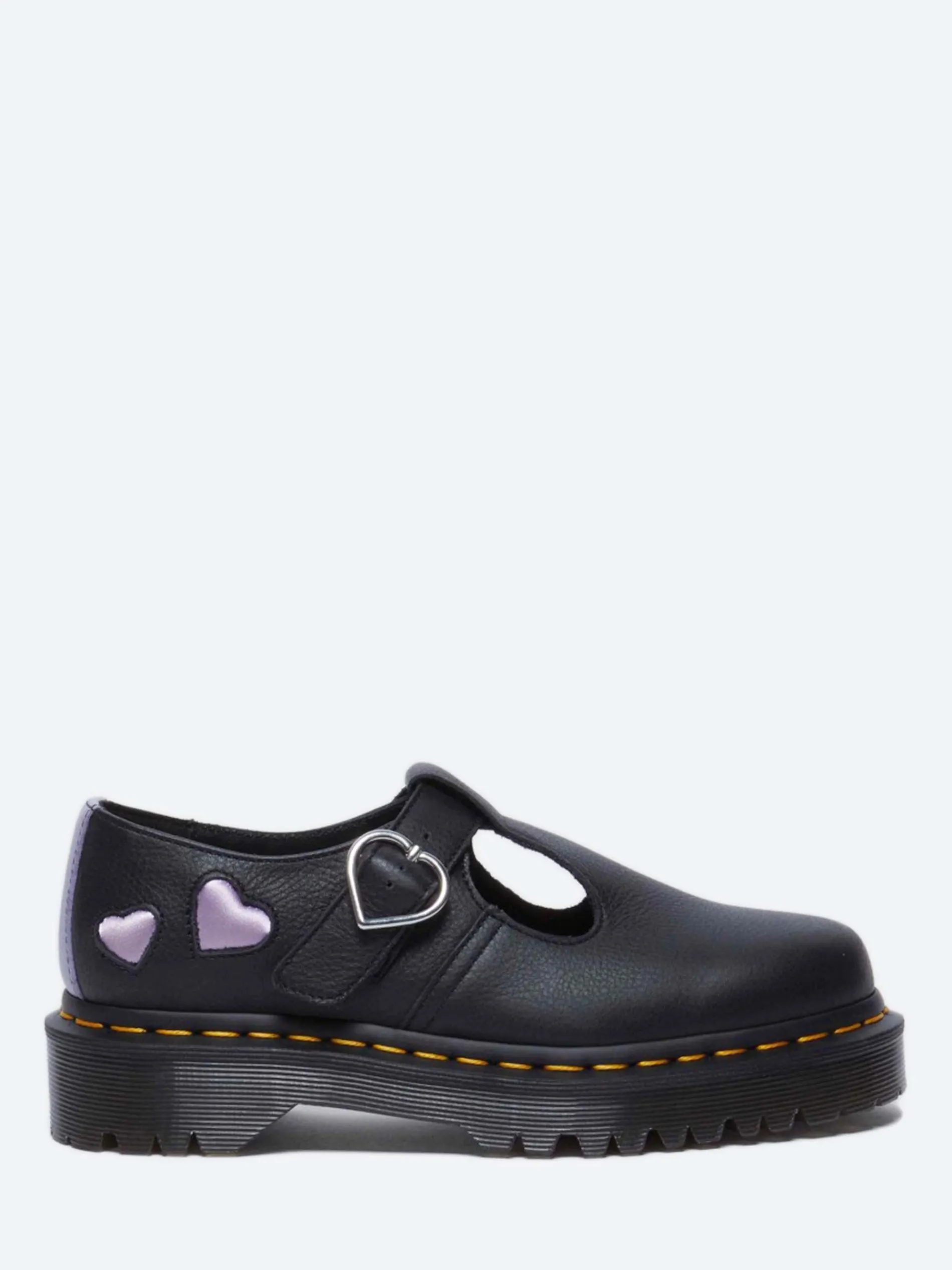 Built from grained Virginia leather that feels soft with minimal break in, the new version of Dr. Martens Polley Mary Jane shoe is welted on a smoke Bex sole punched with our yellow welt stitching.