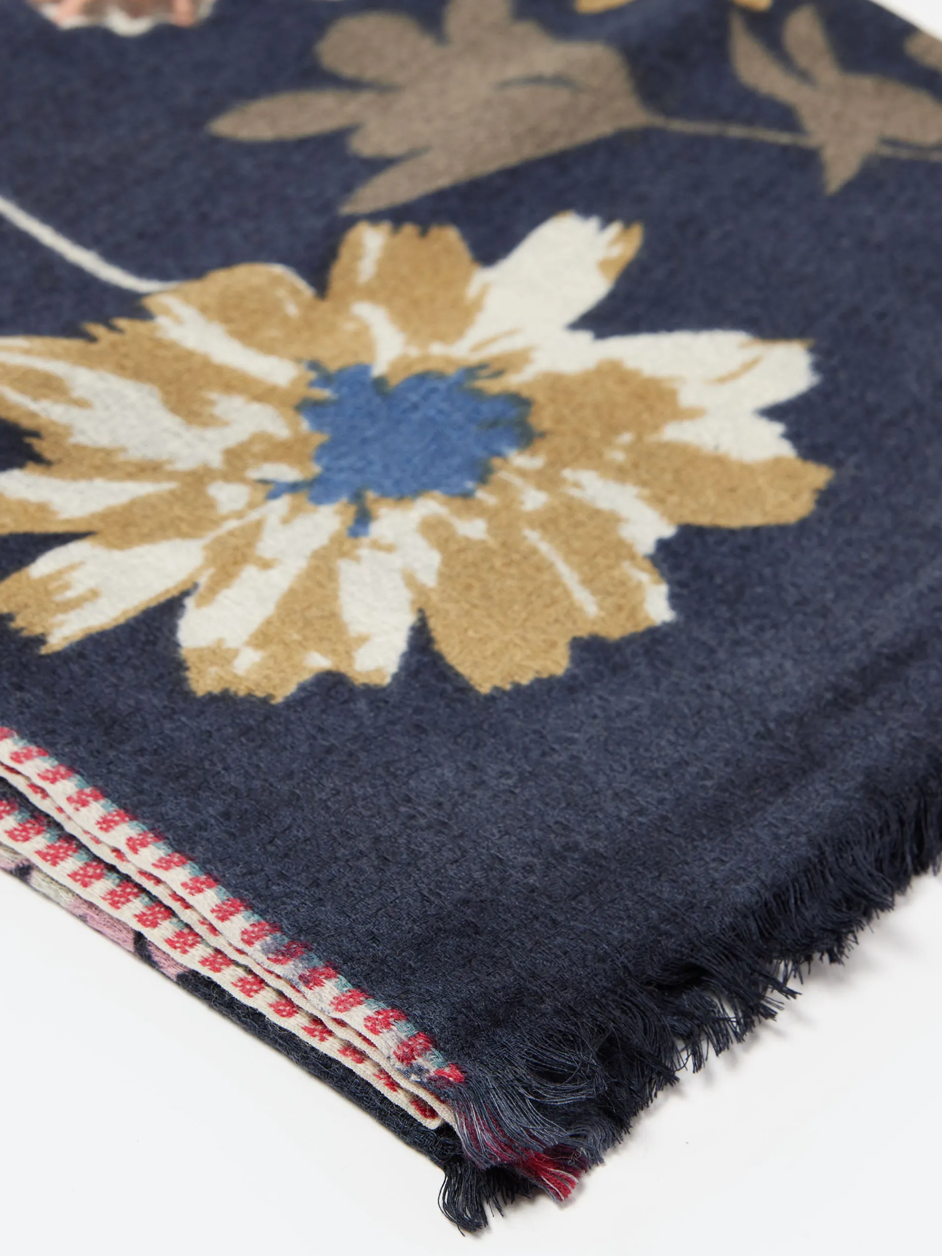 Large stole woven in a diamond pattern, soft and lightly textured. This new composition, Bed of Flowers, is arranged in a colorful herbarium full of Geraniums, Quaking Grass, Common Toadflax, Cosmos, Marigolds, Rudbeckias, Scabiosas, Lathyrus Vernus. Stunning floral medley combining 11 colors, perfect for escaping the winter gloom.