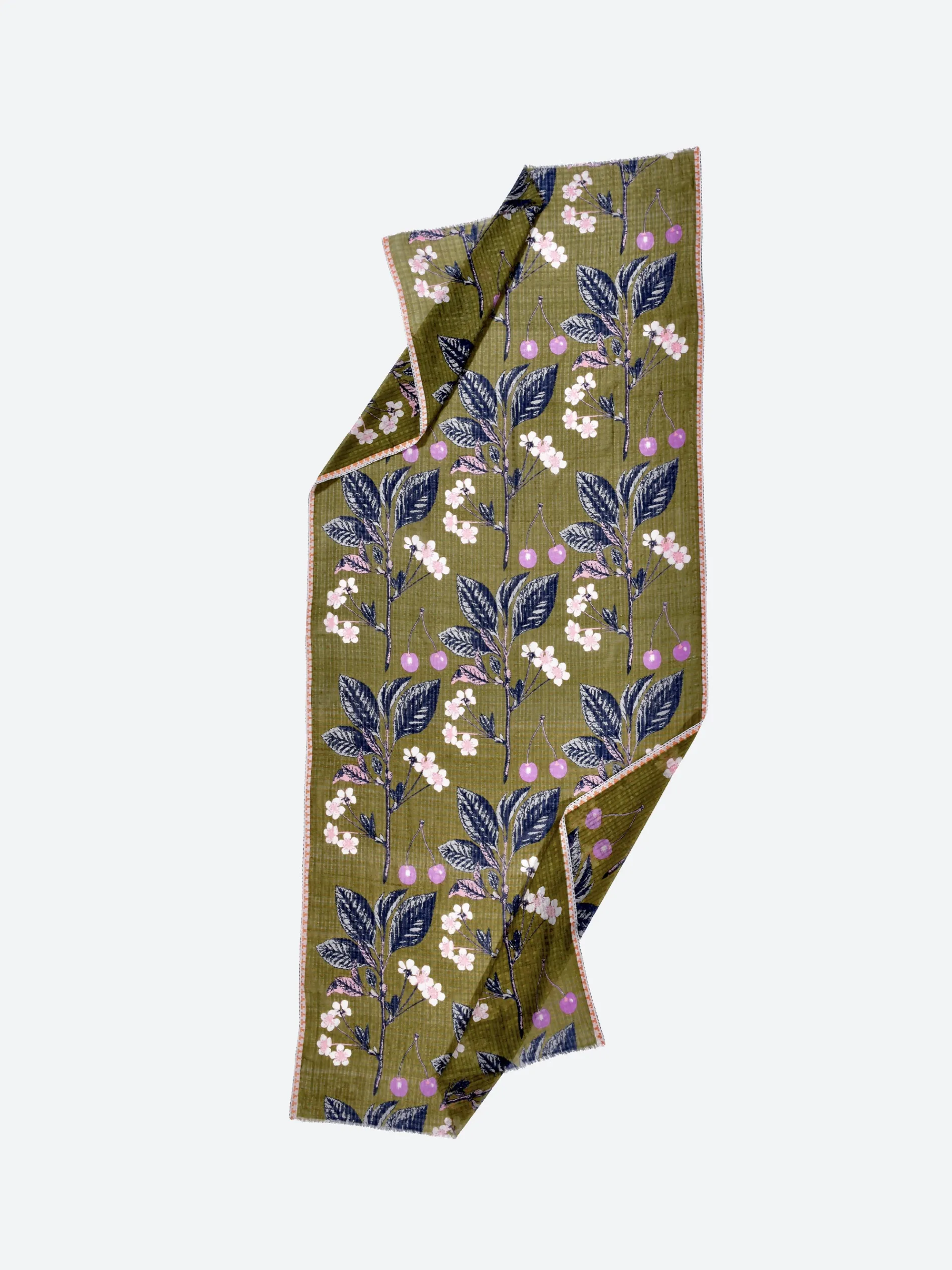 Large, airy stole, handwoven in a softly textured grid pattern. Silk brings an infinite softness and sheen to this elegant floral and fruit design printed in an exquisite soft and vibrant color palette.