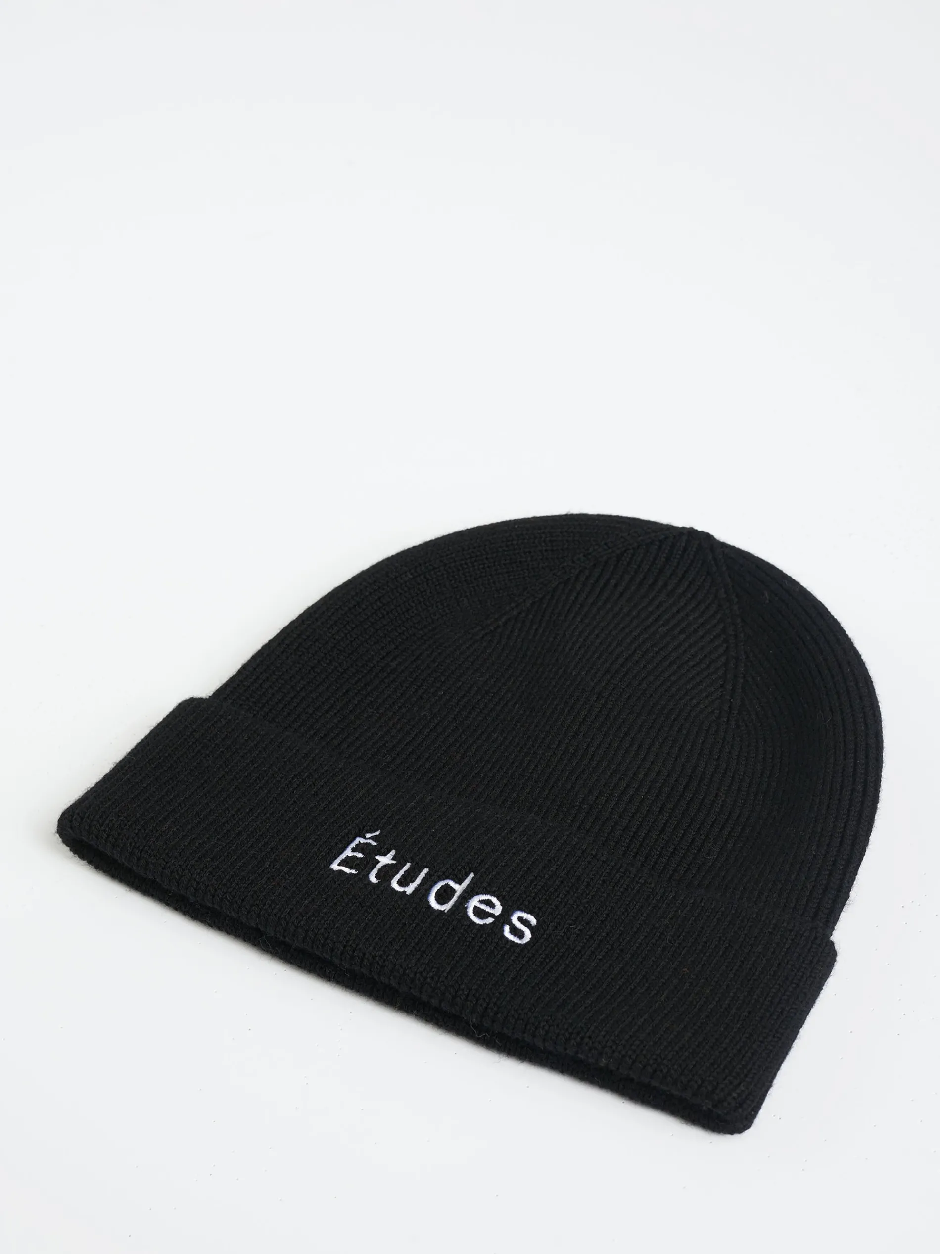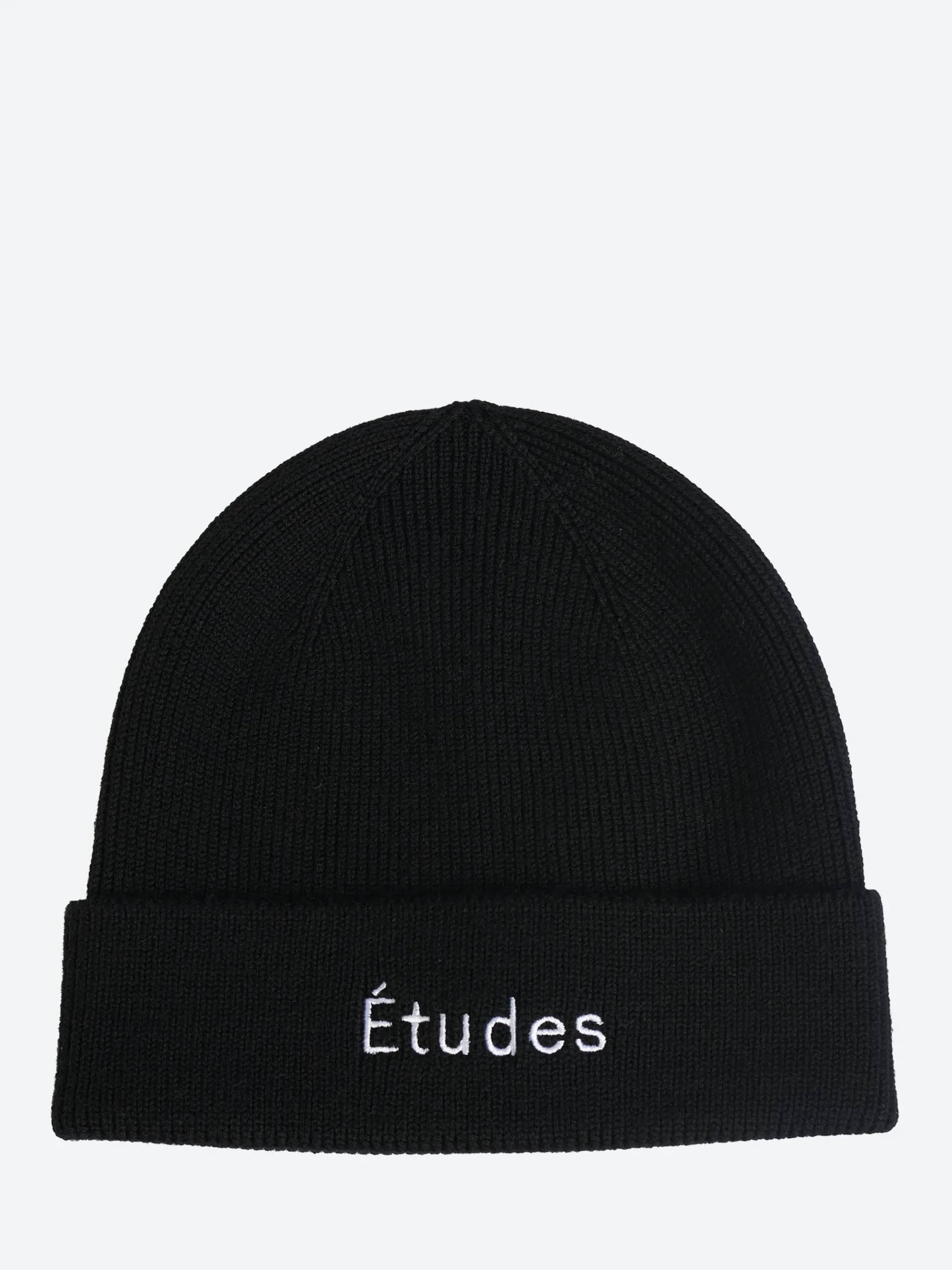 The Beanie Études is a rib knit wool beanie with an embroidery of the Études logo in white at rolled brim.
