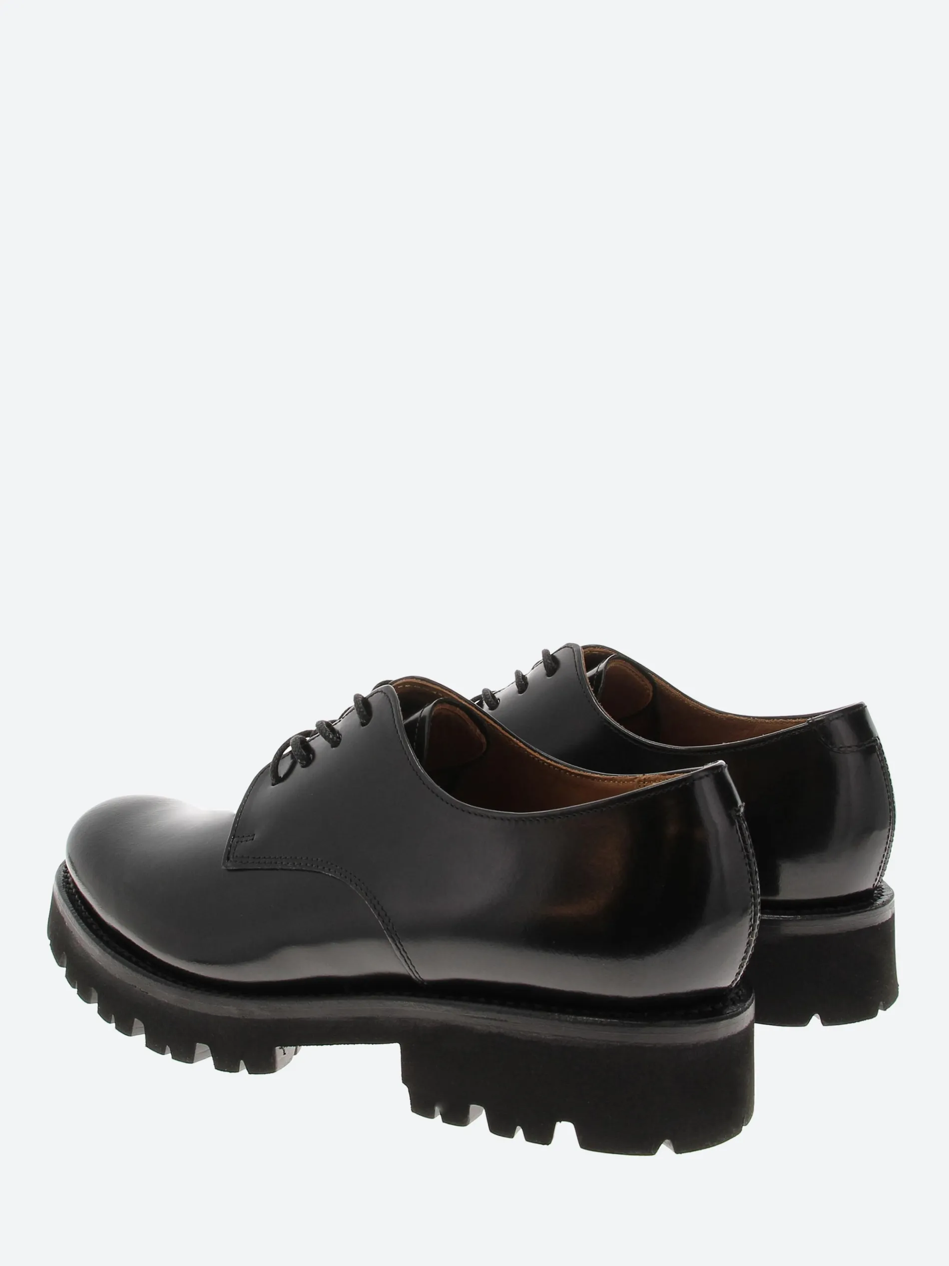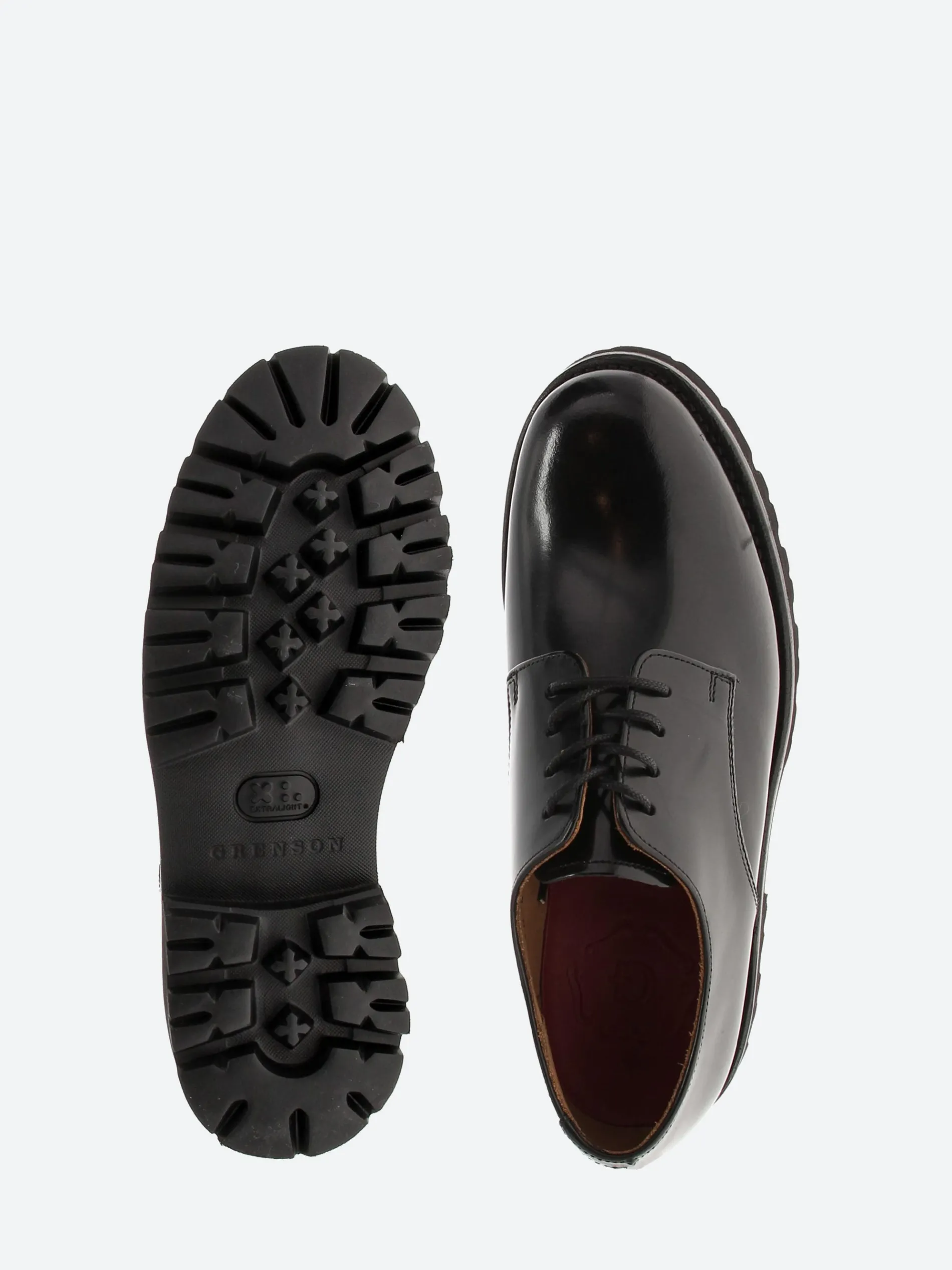 Grenson Evie is their signature women’s derby shoe. Made in polished black hi shine leather on a chunky, but lightweight commando sole.