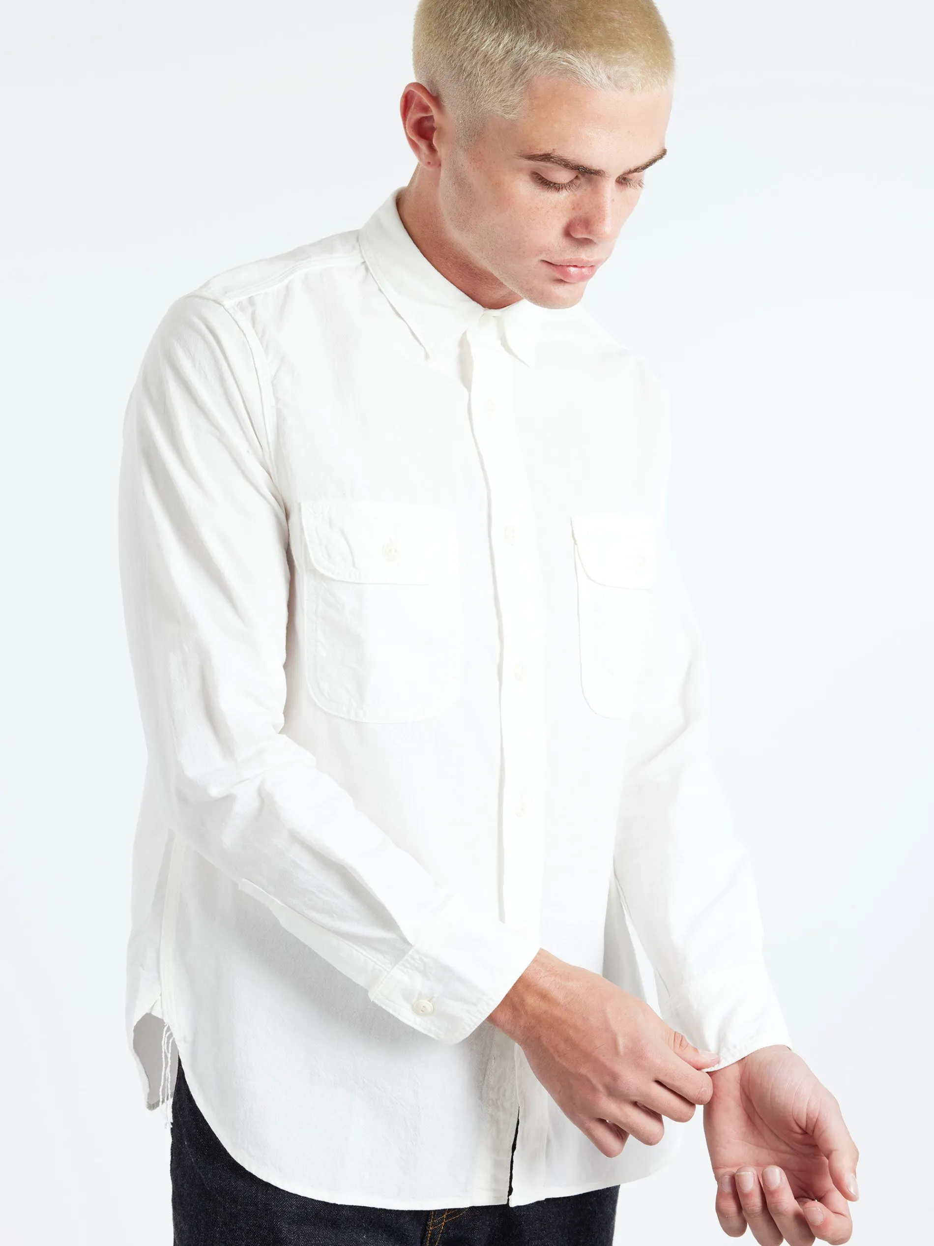 A classic work shirt made from high-twist oxford material. The fit has been modernized with slightly looser armholes, chest and sleeves.