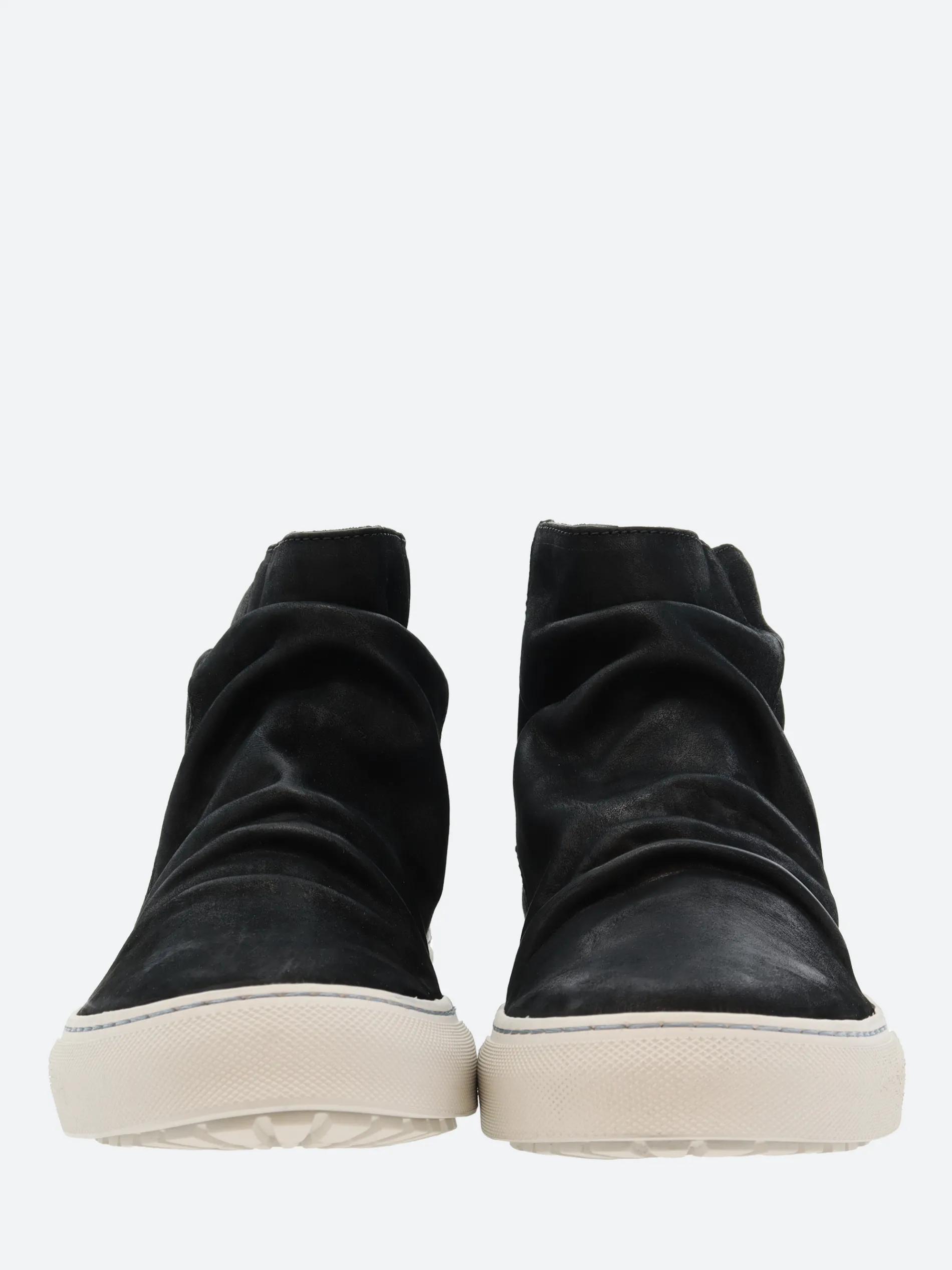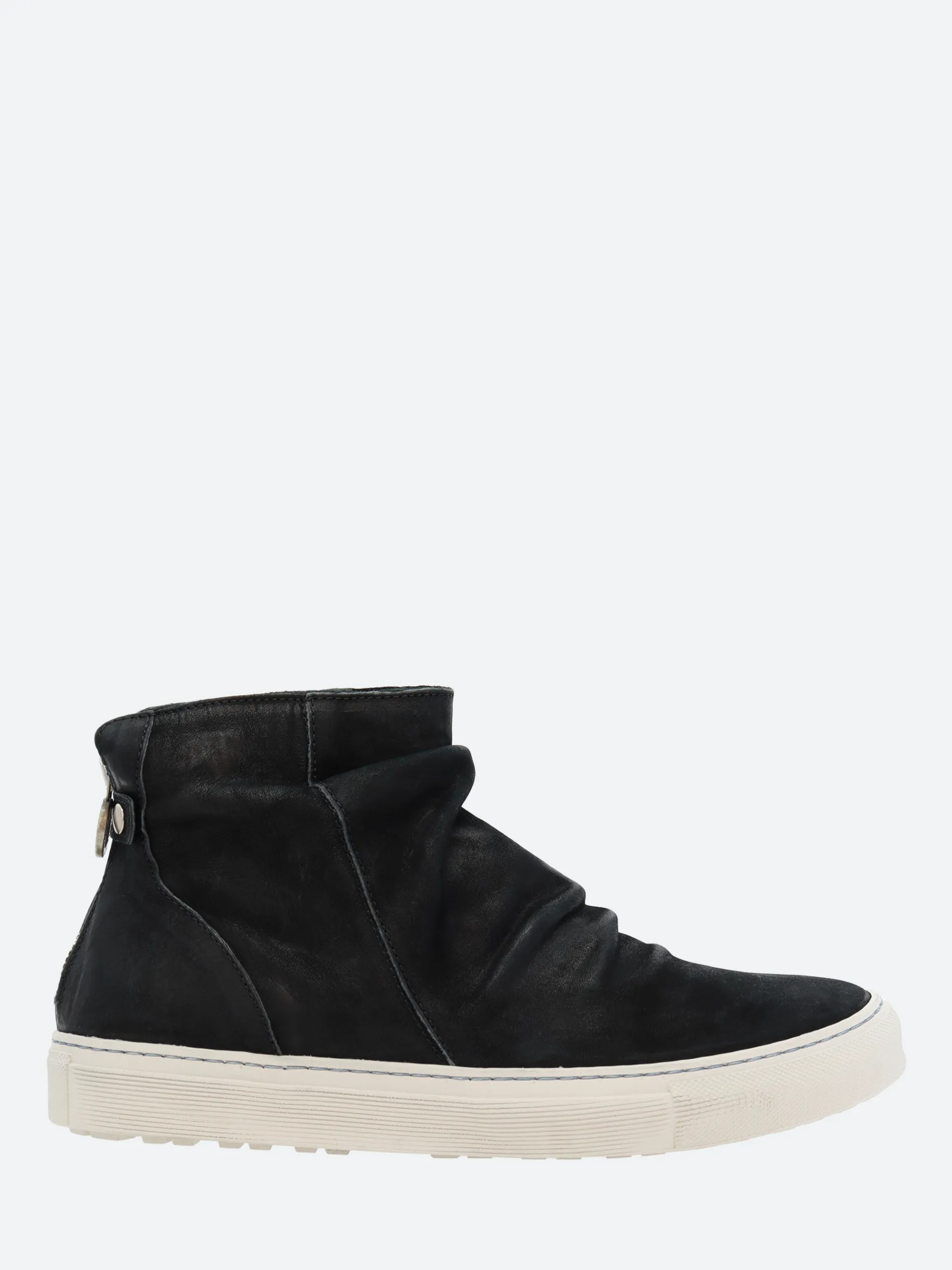 A sleek slip-on ankle sneaker boot in black leather, complete with a zip closure on the back.