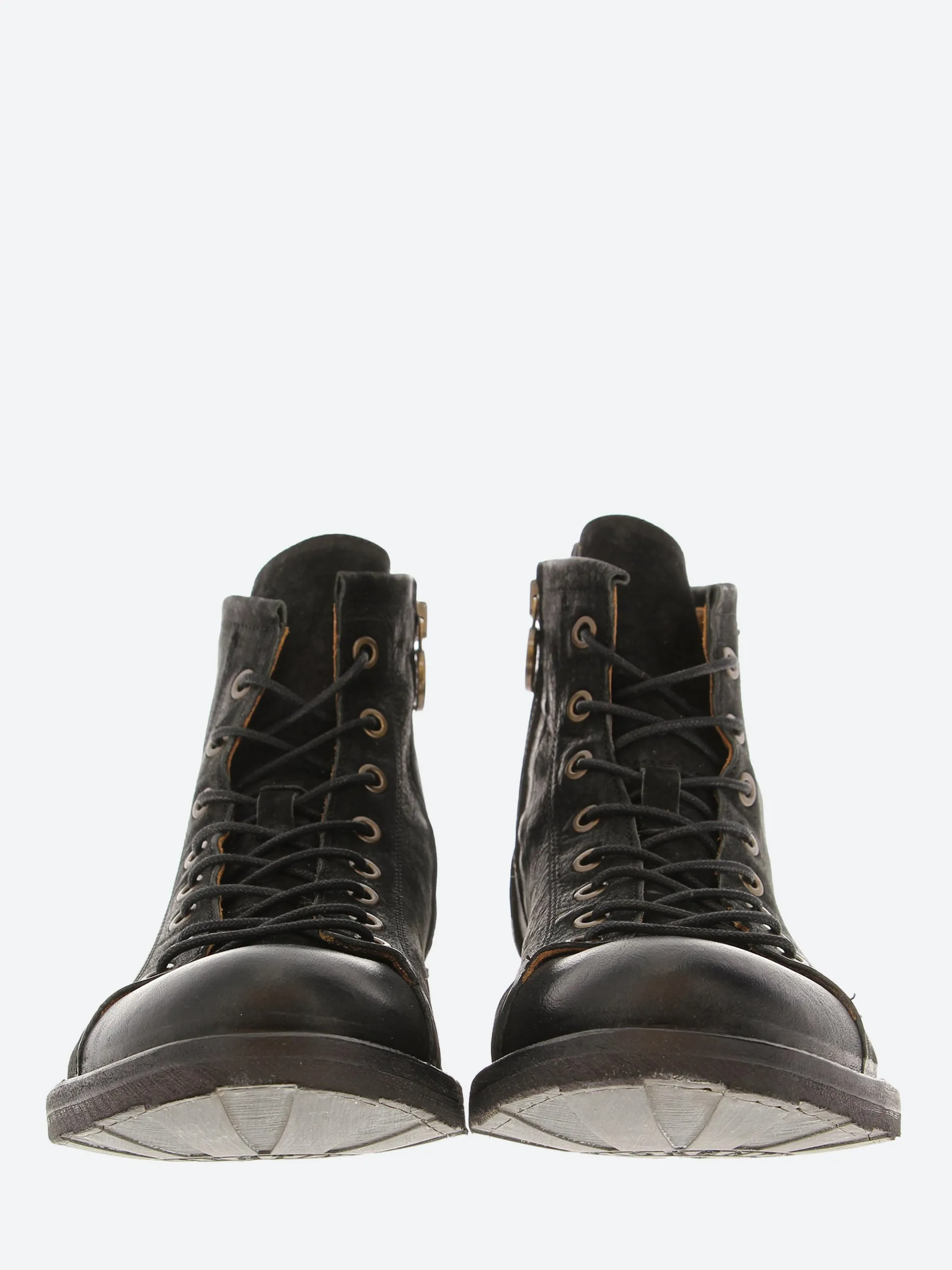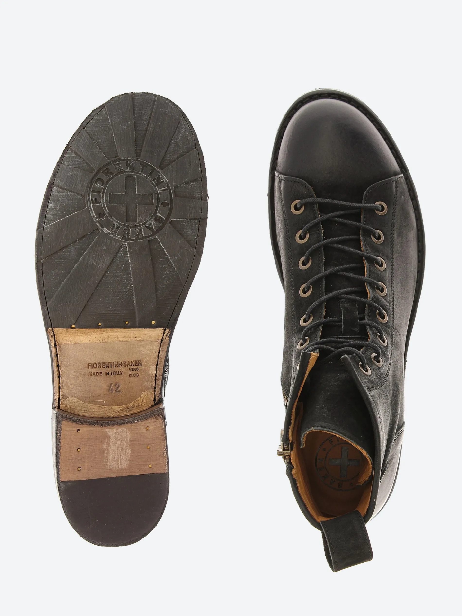 Fiorentini+Baker leather lace-up ankle boot with rear pull tab and inside zip. Sits on a leather and rubber stitched sole.