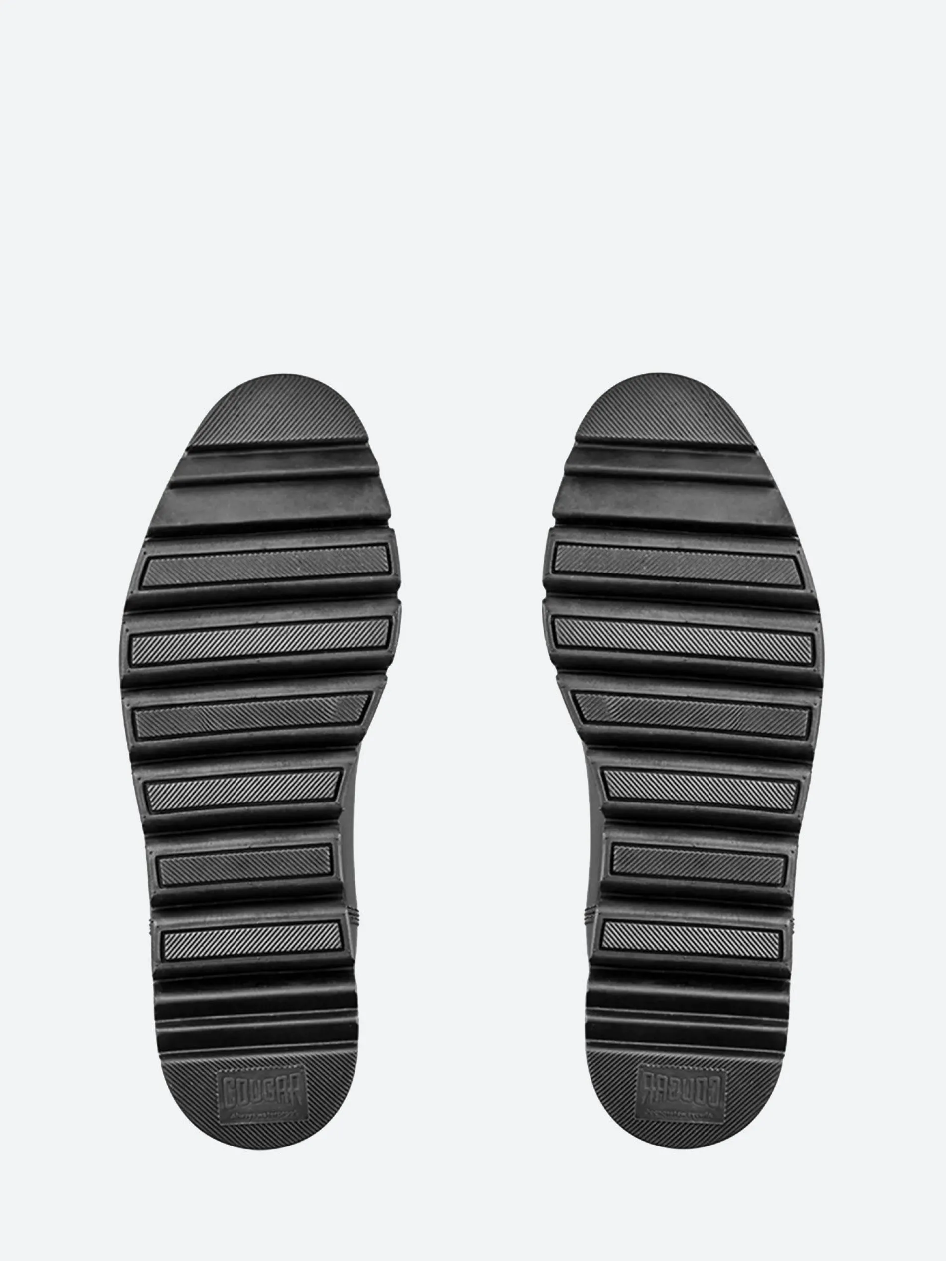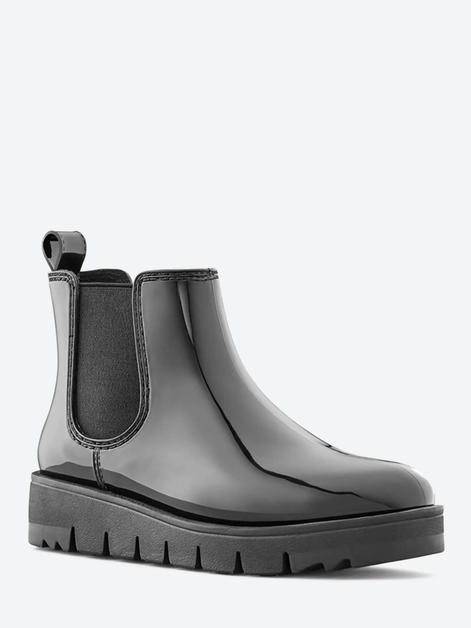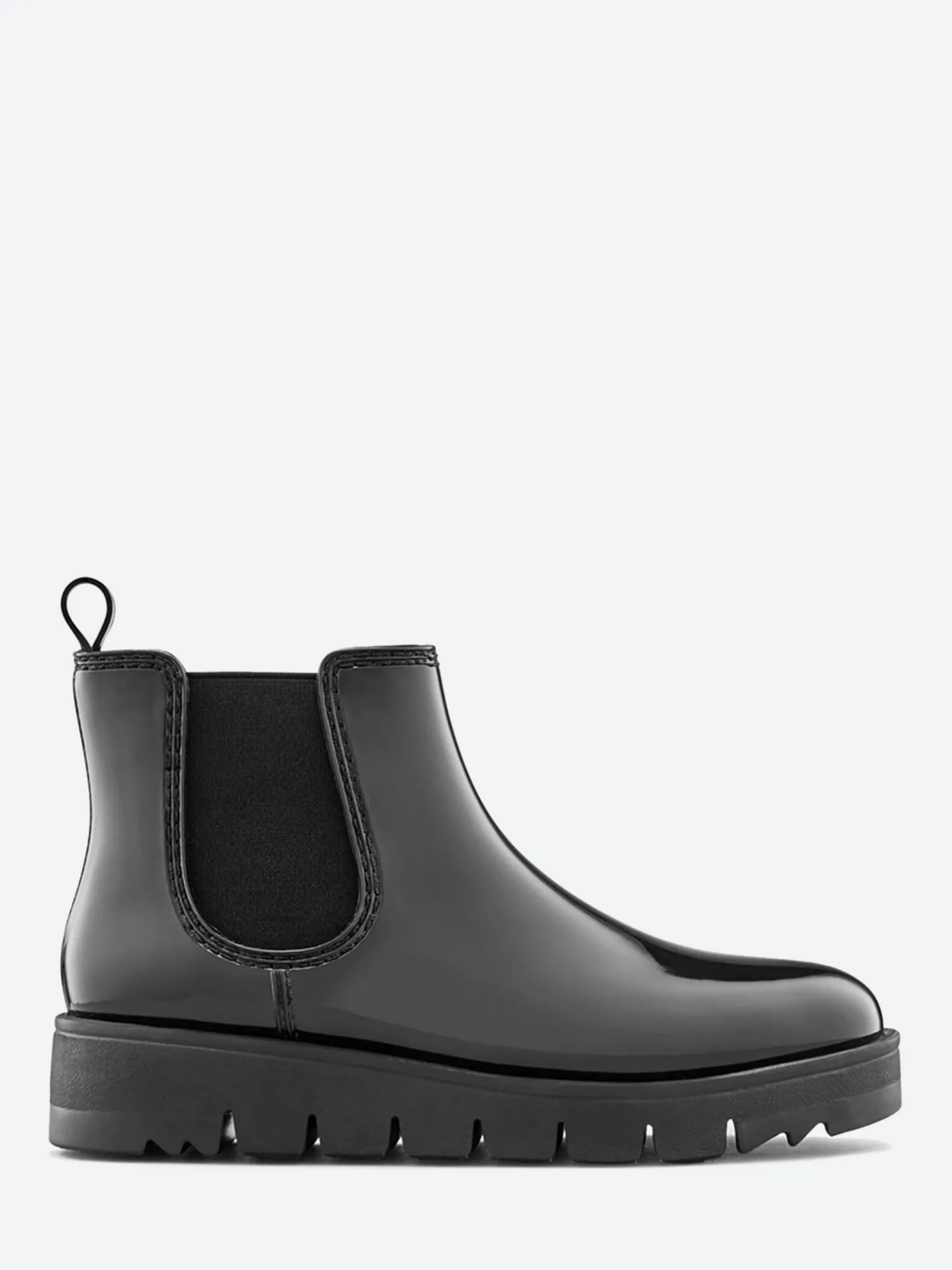 Ankle-high glossy rubber-like compound Chelsea rain boot. Lightweight EVA cushion outsole with colour pop inserts.