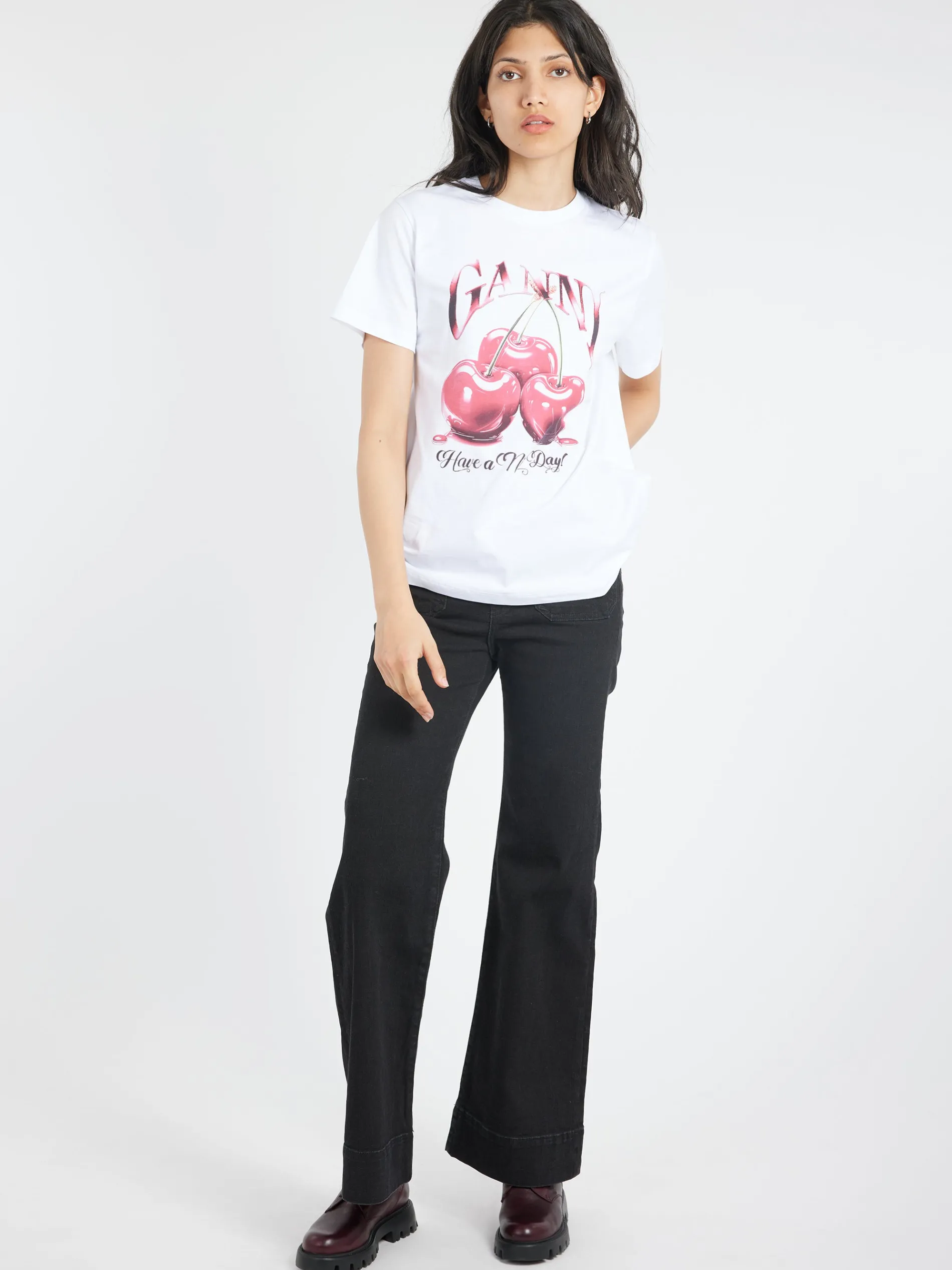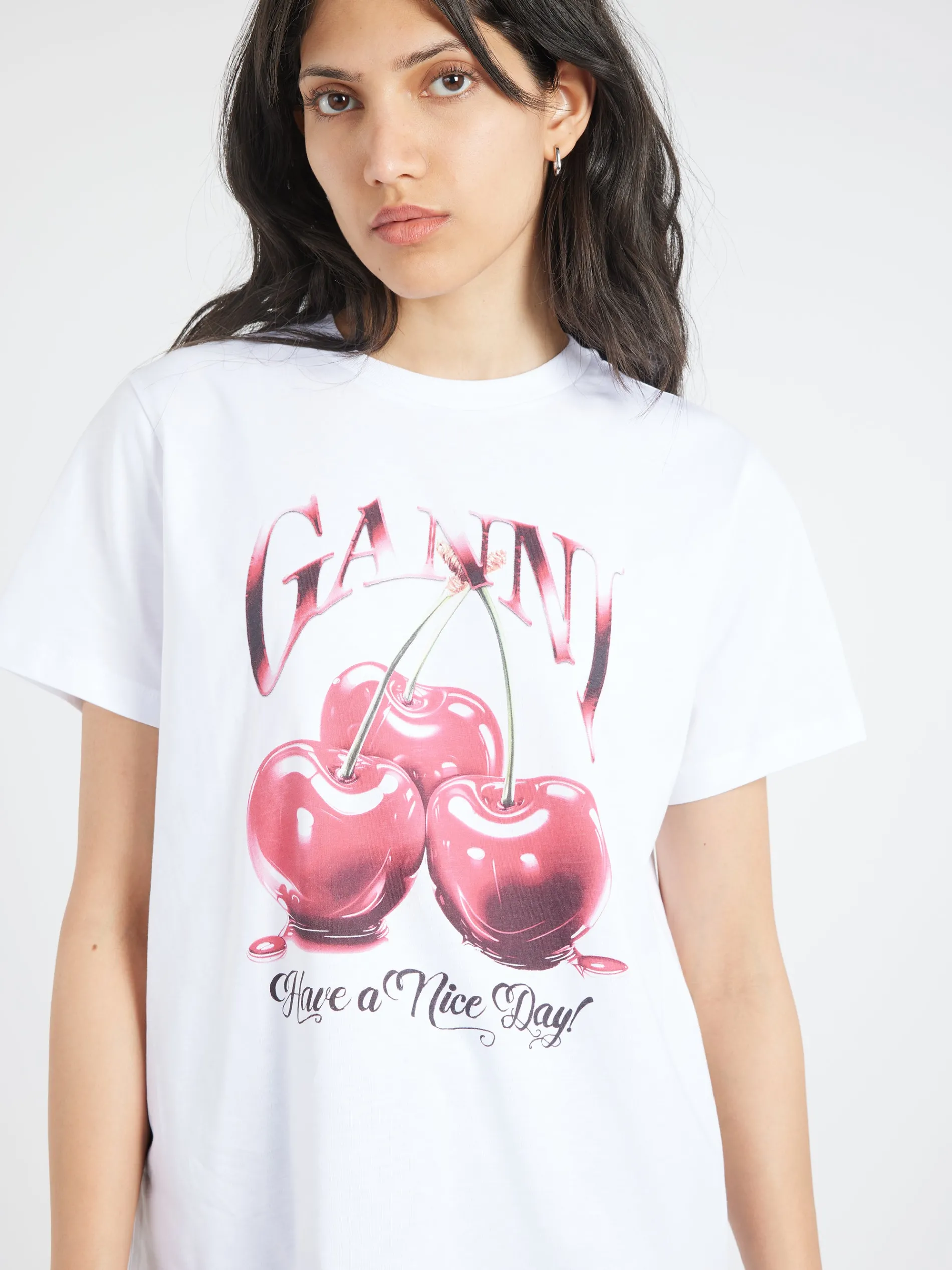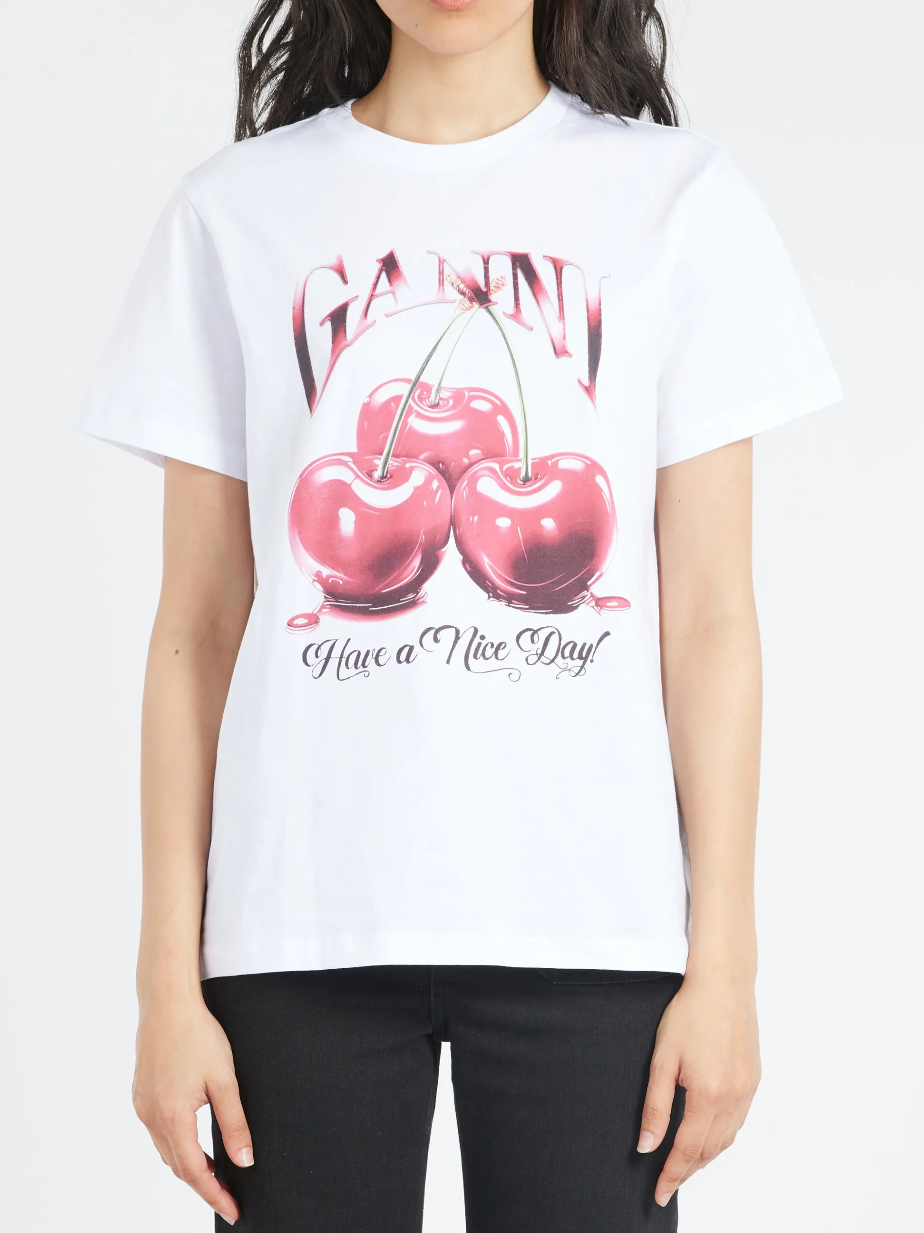 This White Basic Jersey Cherry Relaxed T-shirt features a round neckline, short sleeves and a graphic GANNI print.