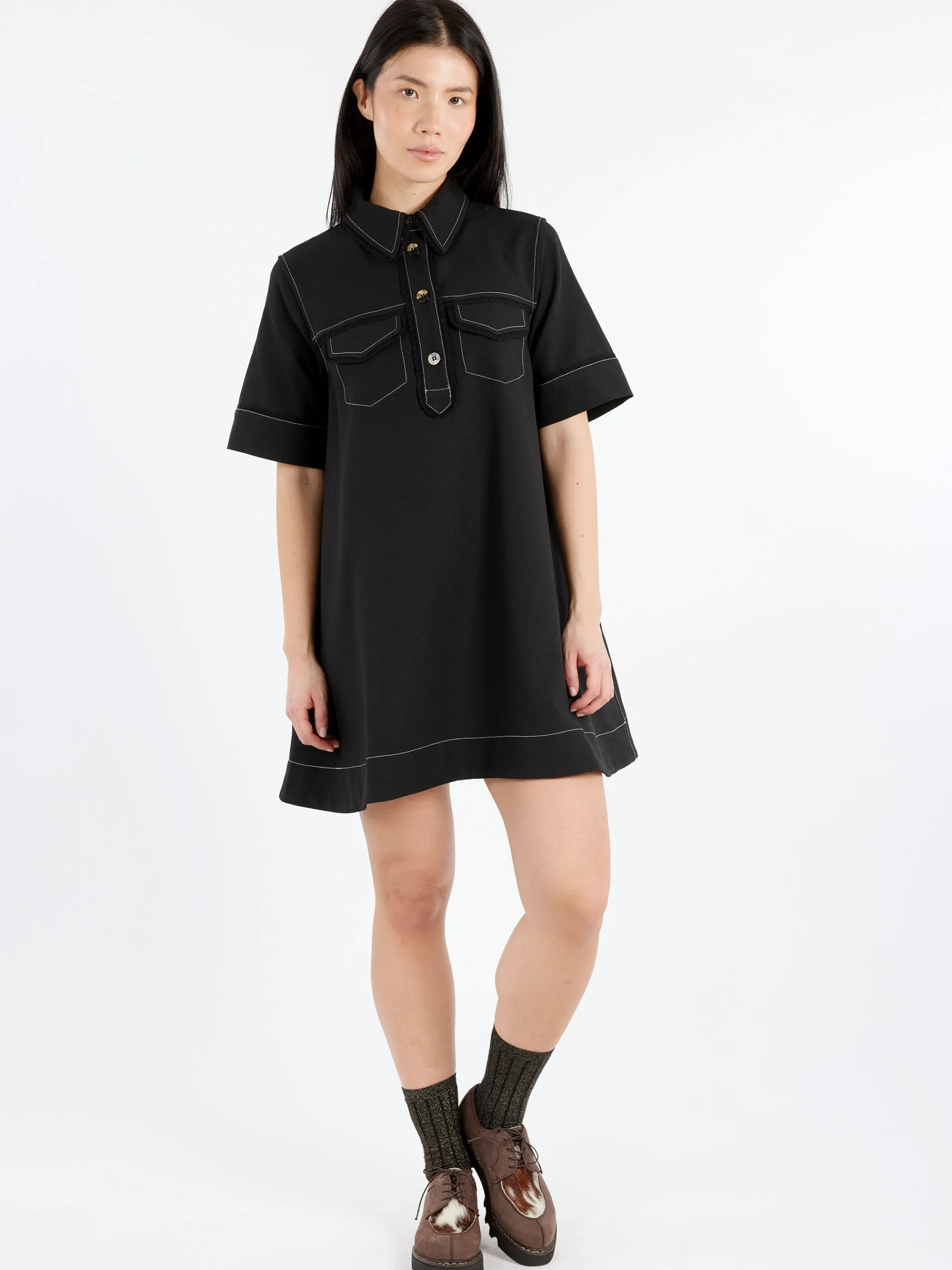 This GANNI Crepe Mini Dress features a collar and a button closure at the front. The dress has short sleeves and pockets at the front and side.