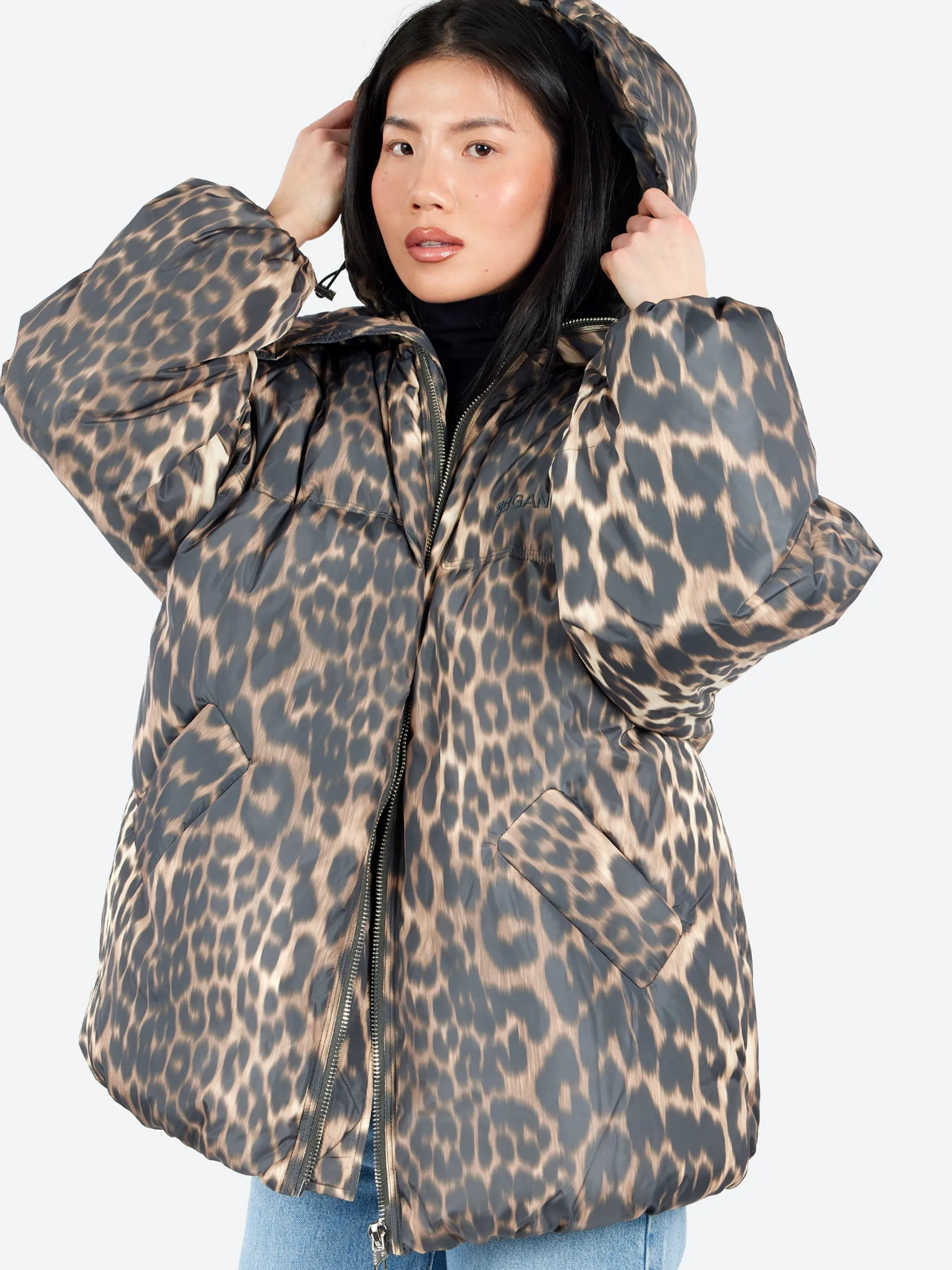 The GANNI Down Jacket blends style and practicality effortlessly. Featuring a distinctive leopard-inspired spotted pattern, it’s crafted from shiny, waterproof material, making it perfect for unpredictable weather. The oversized, boxy silhouette provides a trendy, modern fit, while the wide sleeves and spacious hood ensure comfort and freedom of movement. With a front zipper for added functionality, this jacket combines both fashion and utility, making it a standout piece for colder days.