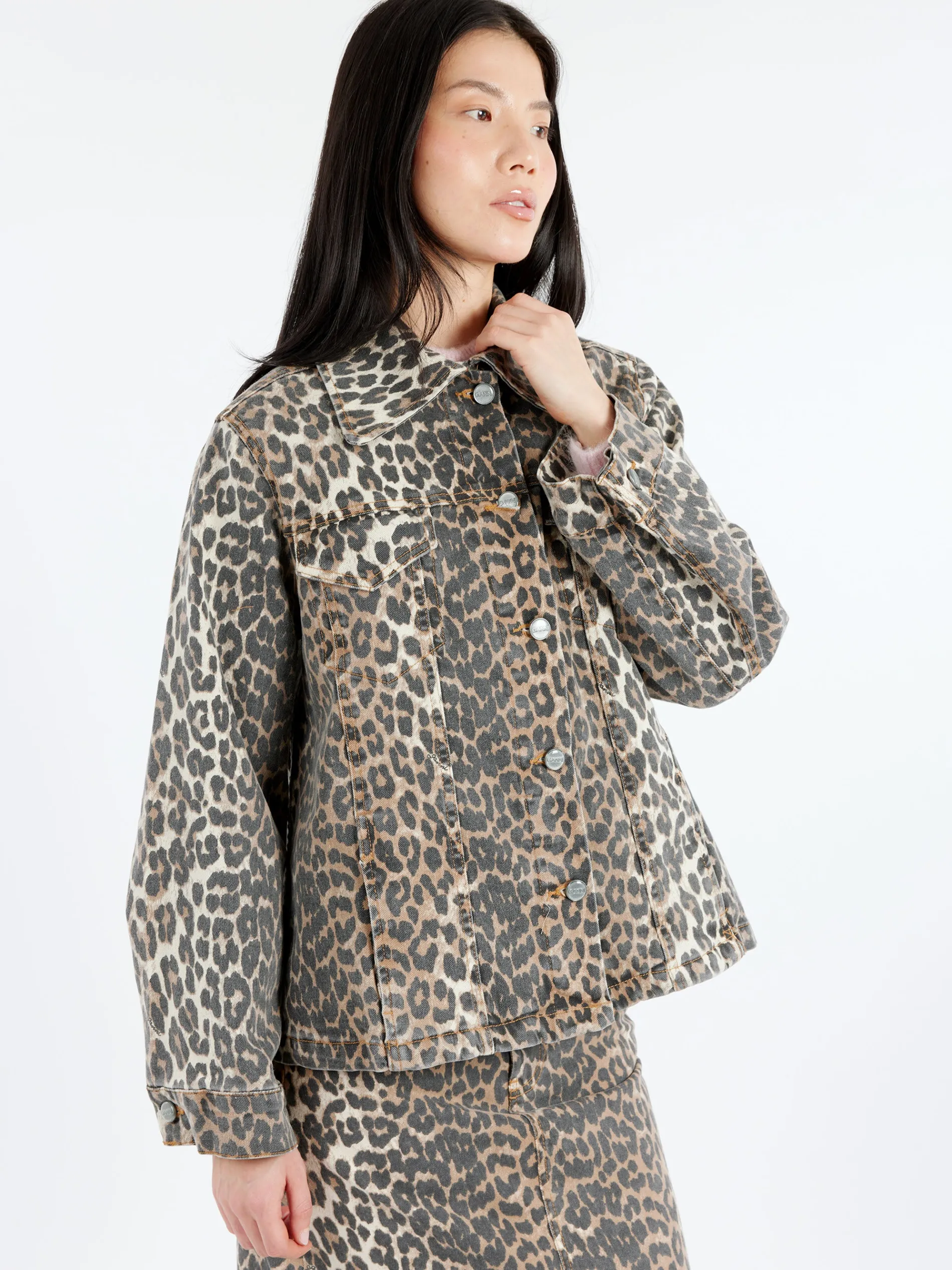 This Leopard Printed Denim Jacket features a collar, button closure, two front pockets and side pockets.