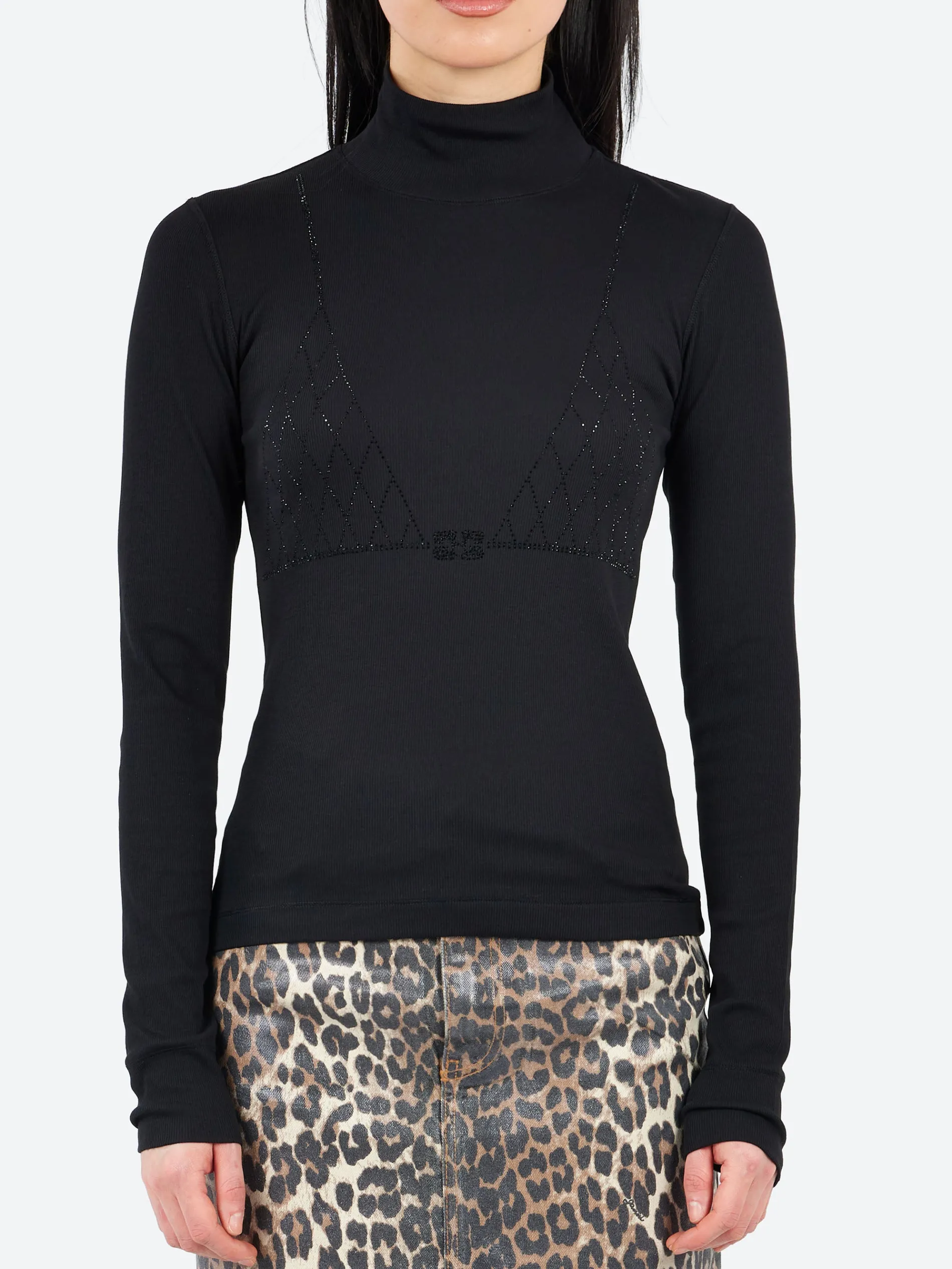 The GANNI Black Soft Cotton Rib Rhinestone Top featuring a high neck and long sleeves for a sleek, flattering fit. The top is enhanced with a panel of sparkling rhinestone detailing, adding a touch of glamour to the soft cotton rib fabric. Perfect for elevating your wardrobe, this top combines comfort with a stylish, eye-catching design.