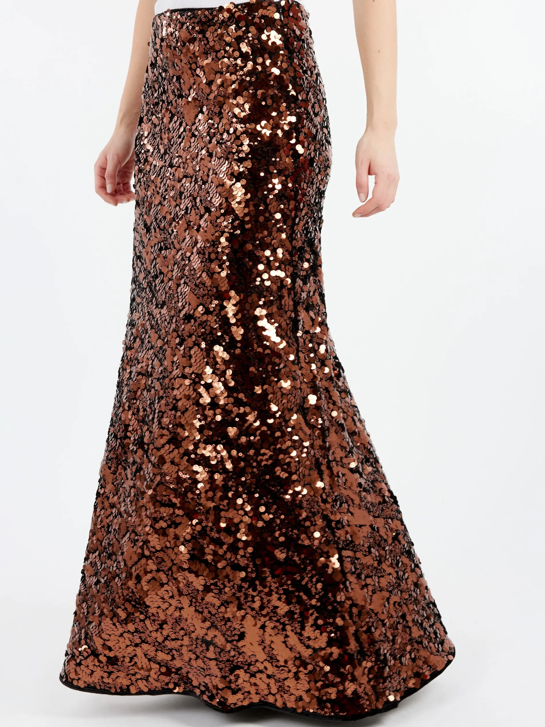 This Sequins Maxi Skirt features a zip closure at the side and all-over brown sequins.