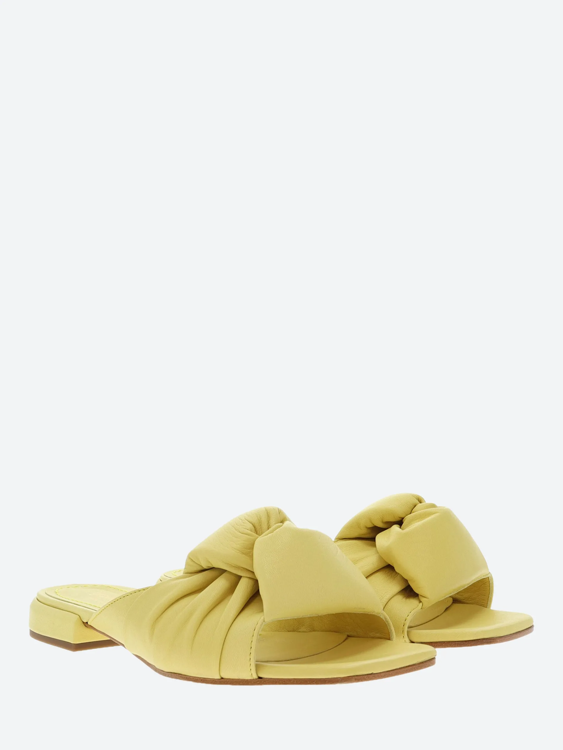 Luxe gravitypope leather slide sandals with a playful knot motif at the wide strap. A supportive, contoured footbed sitting on a very slight heel.
