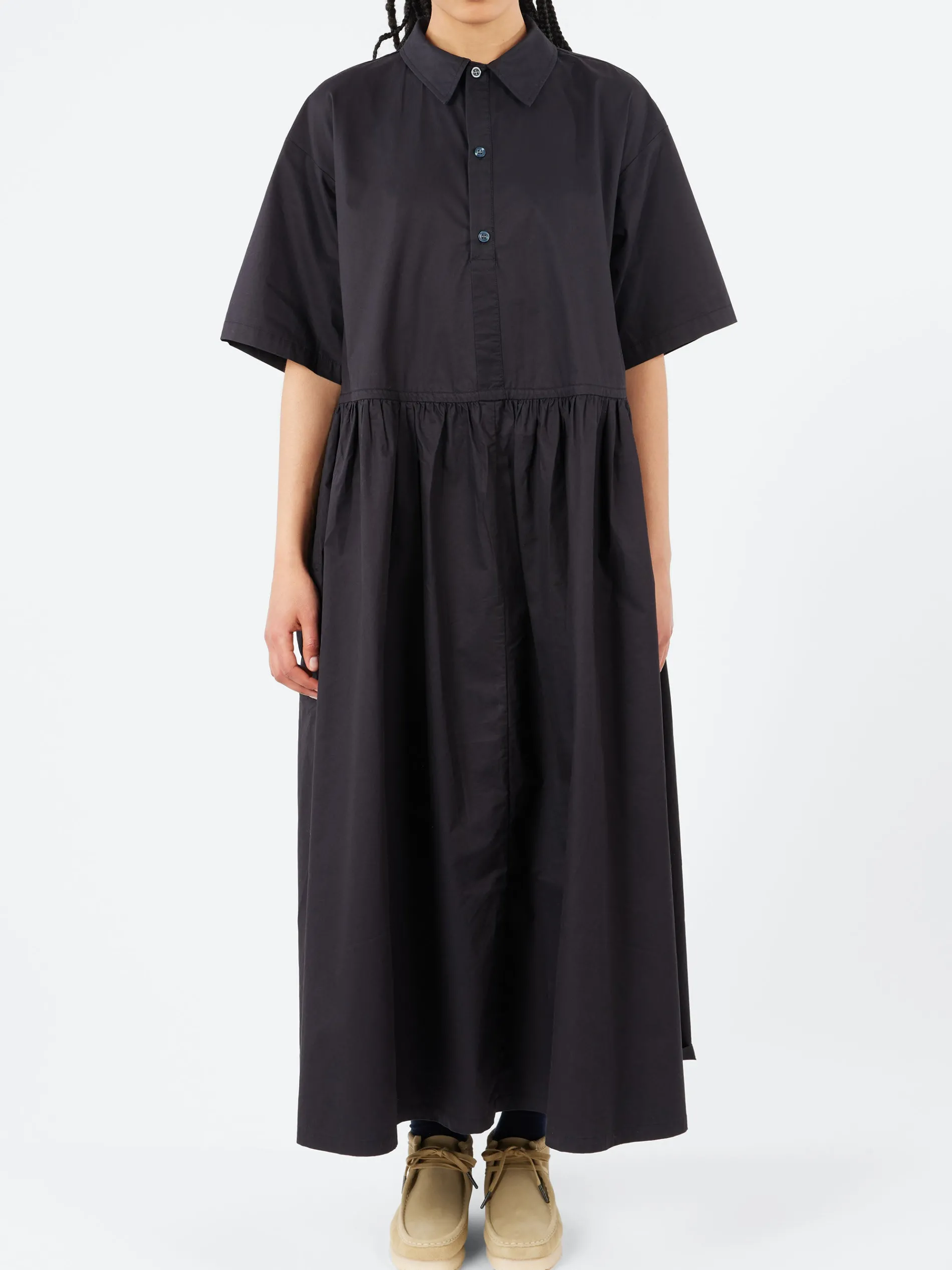 This button-up dress features an oversized silhouette that offers a relaxed and comfortable fit. The design gently narrows at the waist creating a flattering shape. The pleated detailing adds texture and movement. With short sleeves, it’s perfect for warmer days while keeping a breezy look.