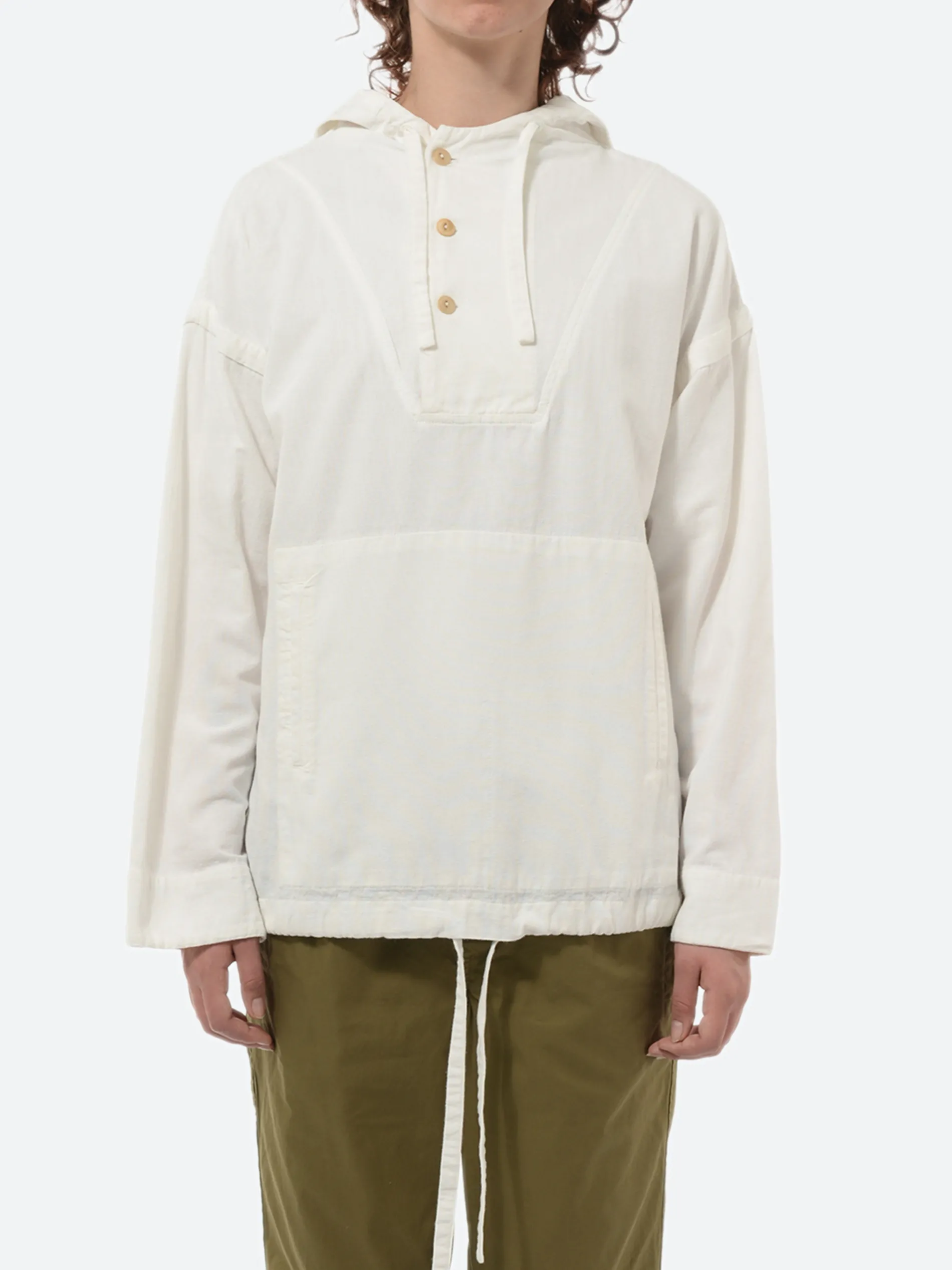 A hooded pull-on smock shirt that fits rather loose and comfy. Made from a premium raw cotton.