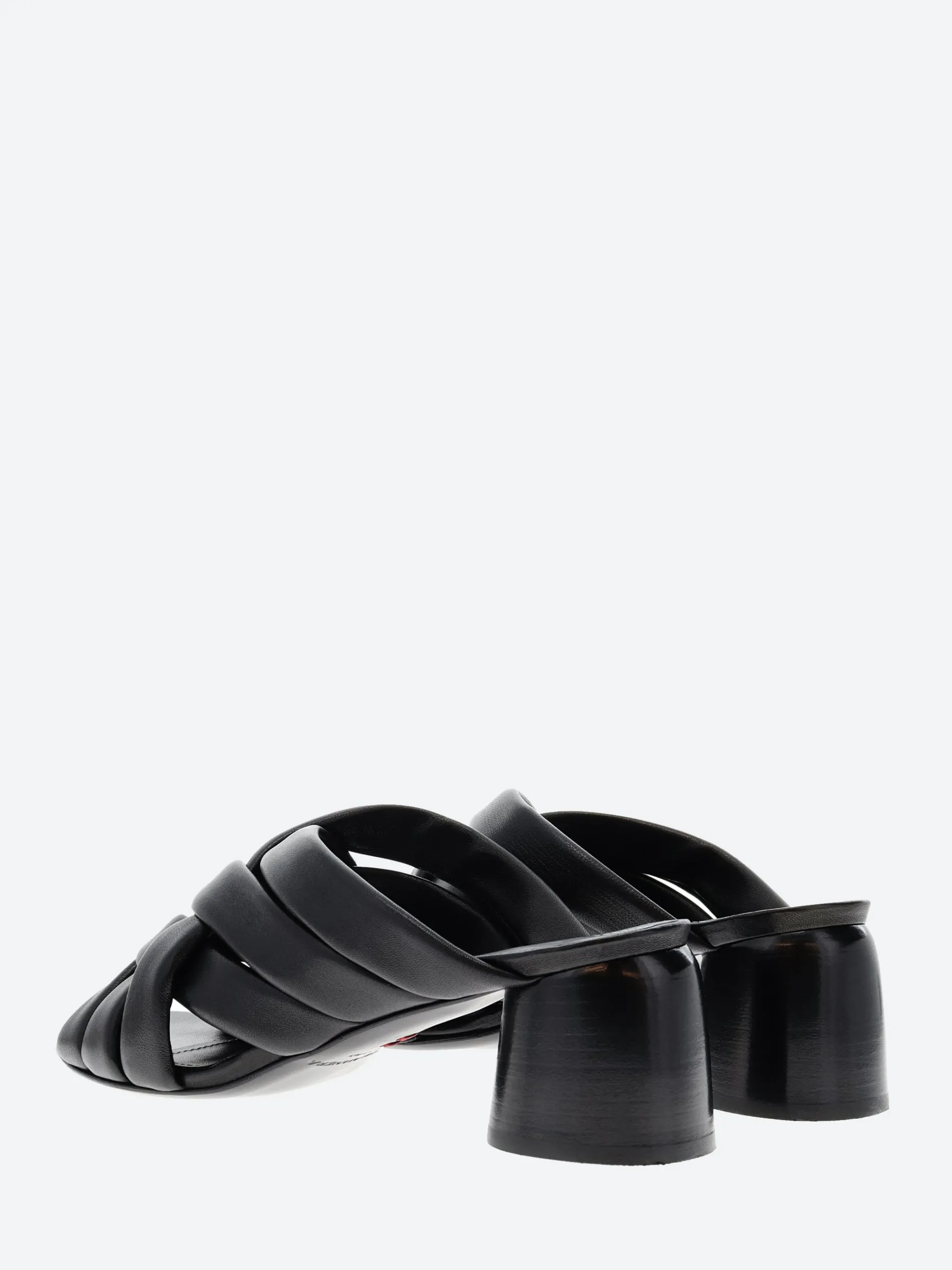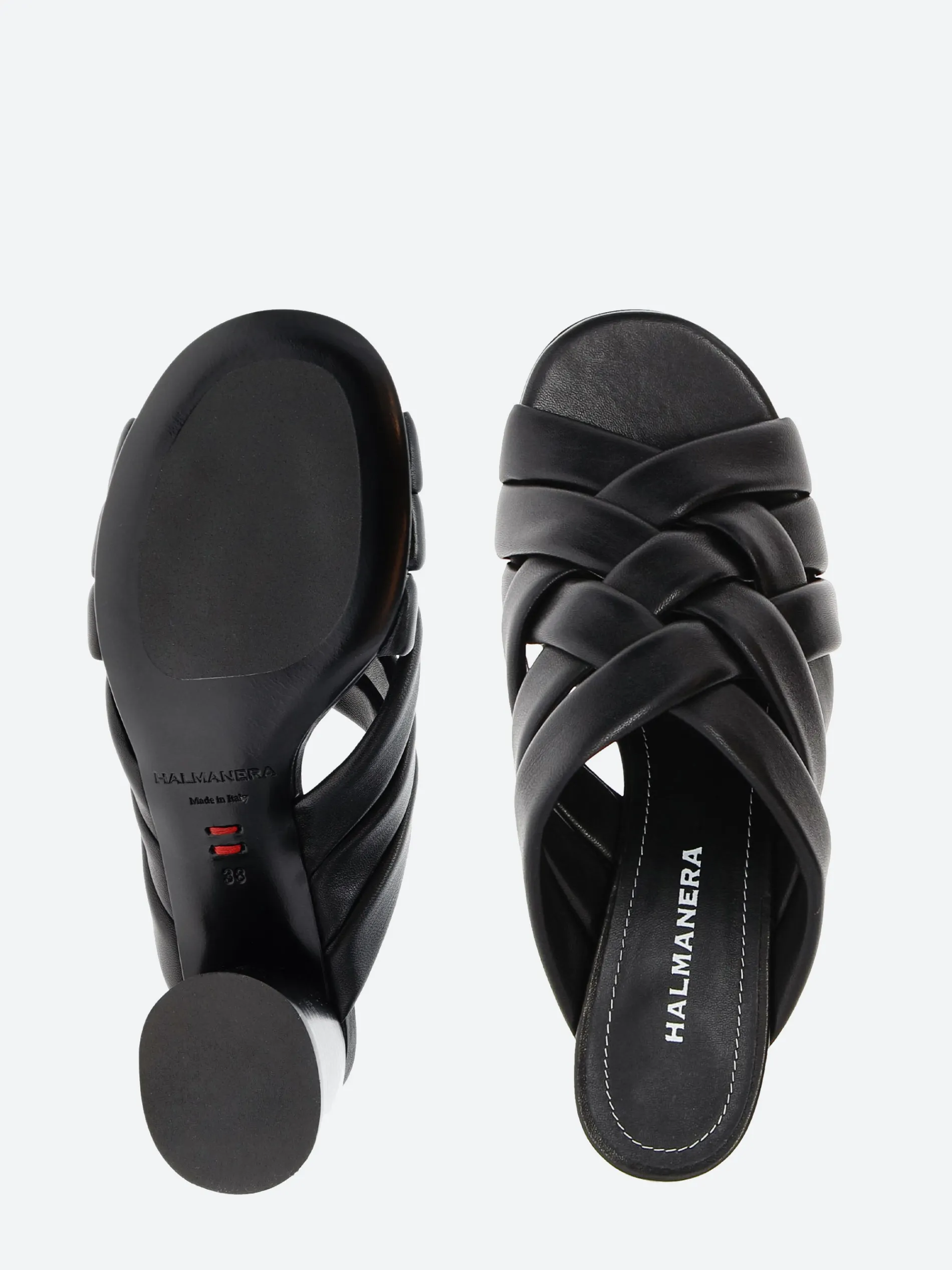 Halmanera woven sandal in soft nappa leather. A slip-in mule for easy on and off. Finished with a tonal wooden heel.
