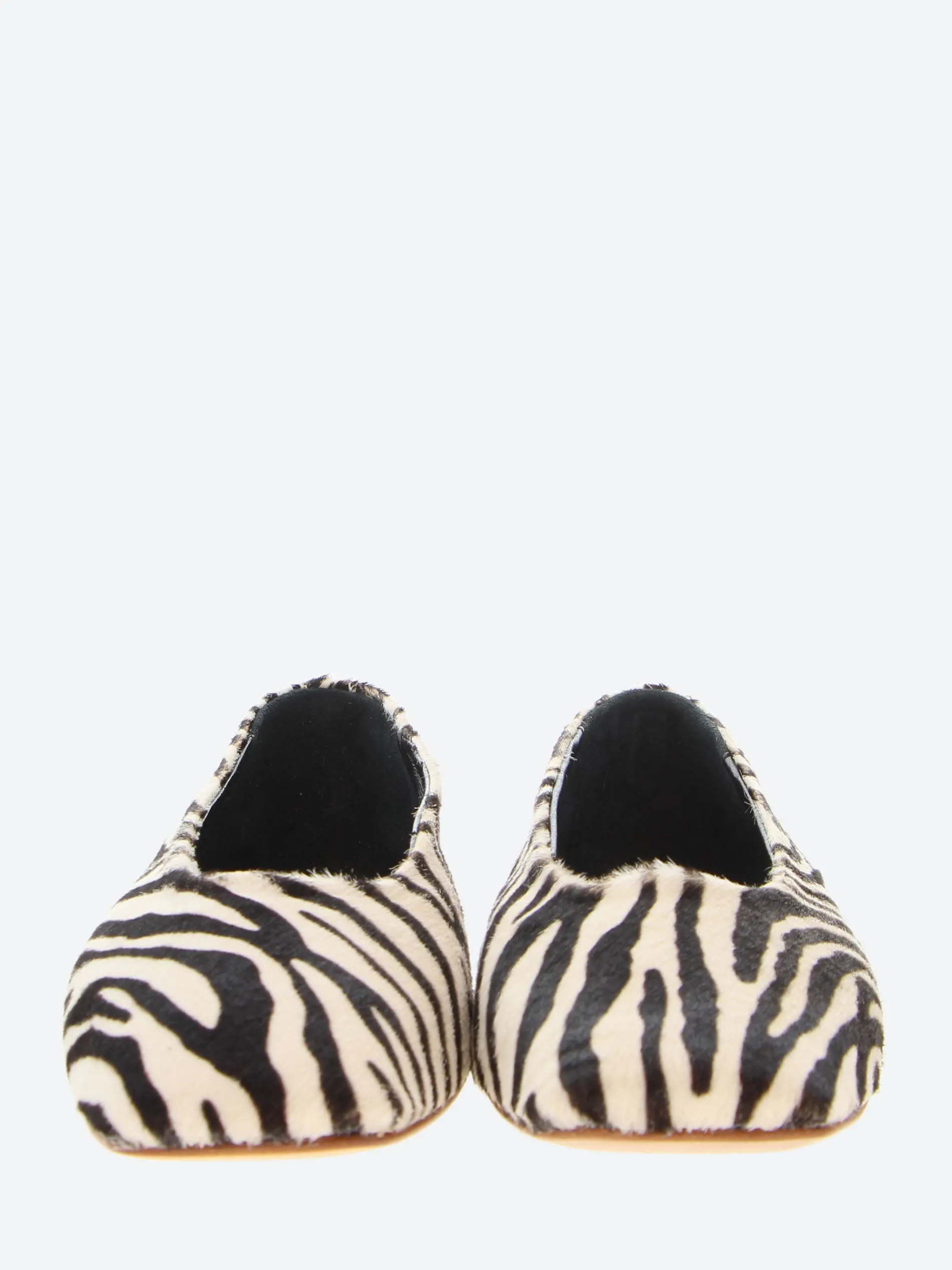 A clean, classic ballet with an on-trend square toe made with a zebra-printed pony hair.