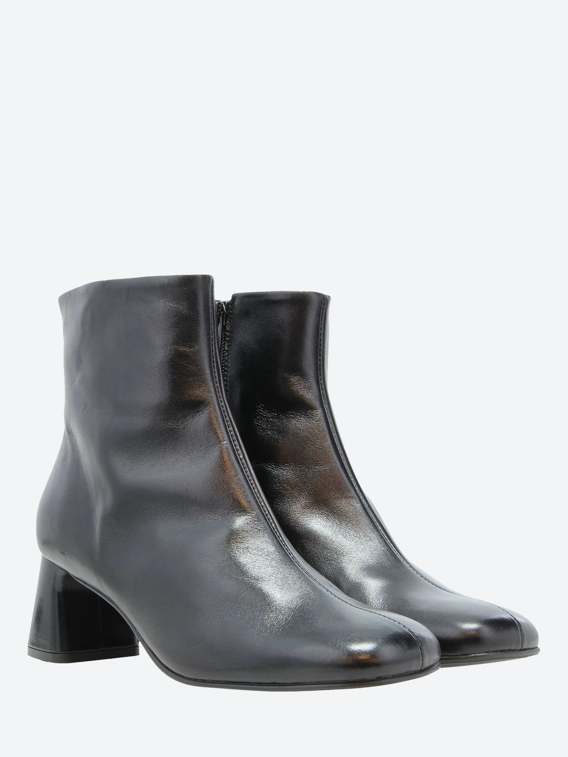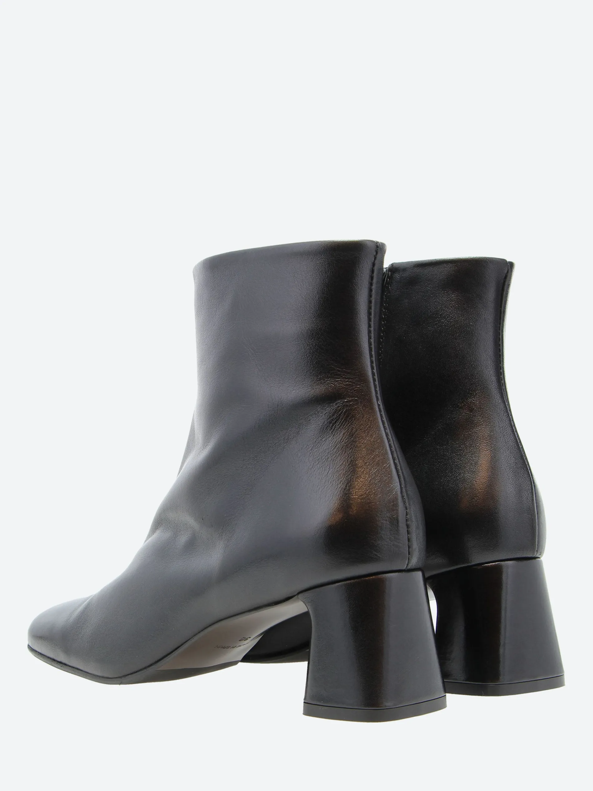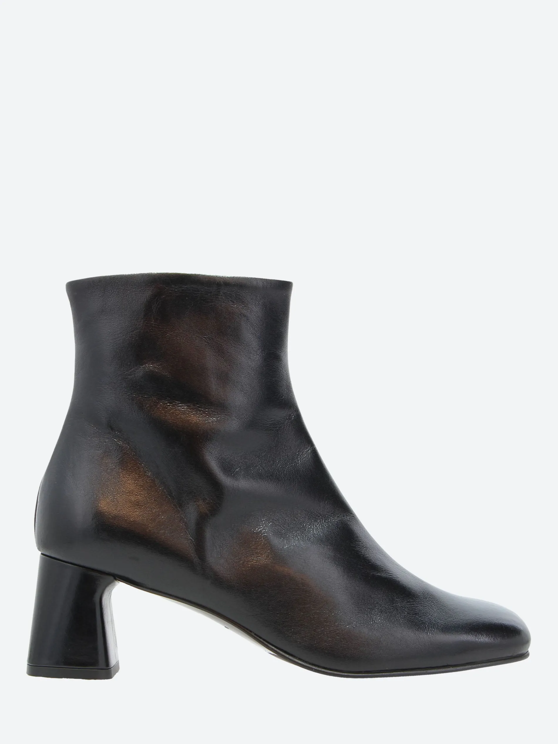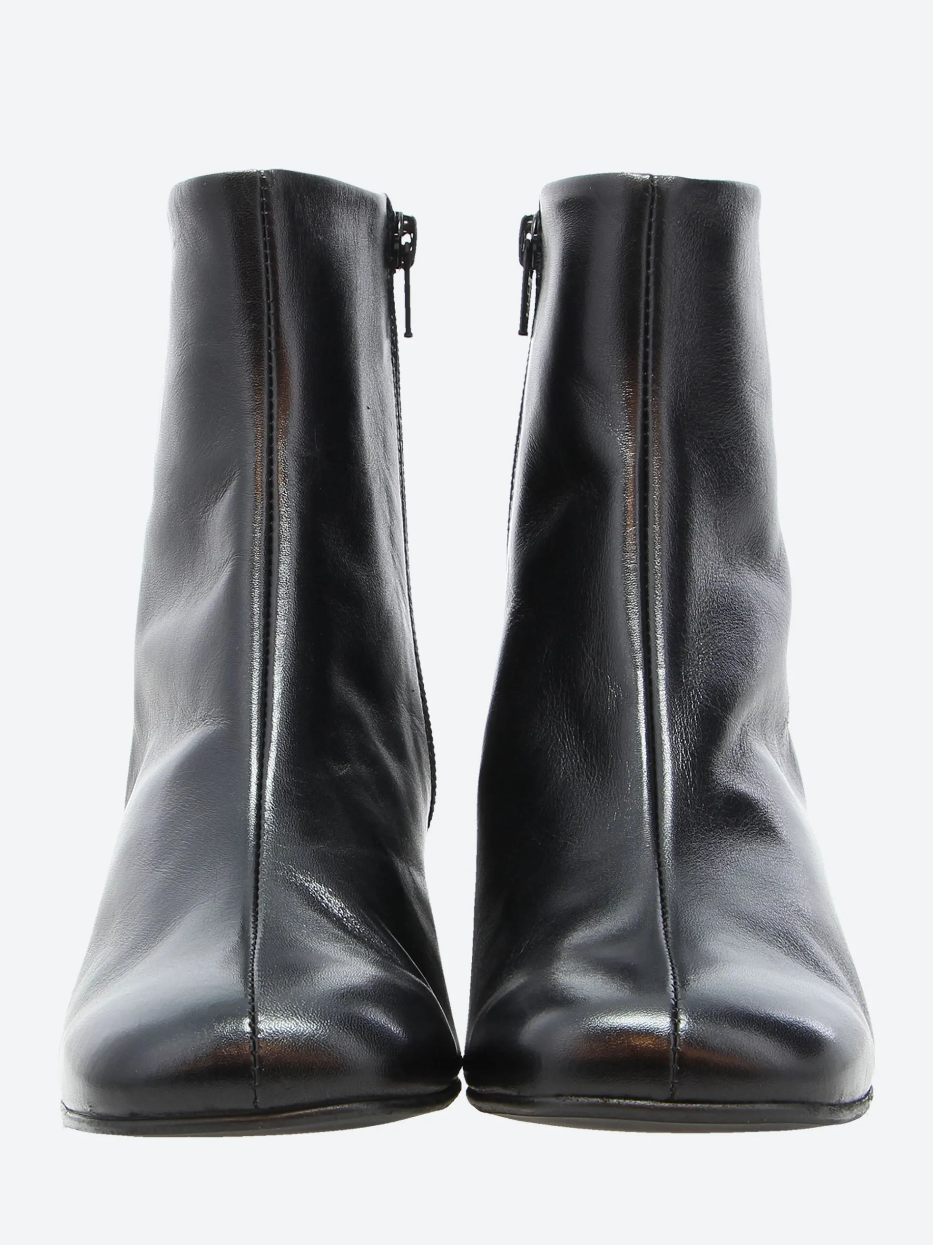 A sculptural block heel brings height and dimension to a chic bootie in a square-toe silhouette crafted from sleek leather.