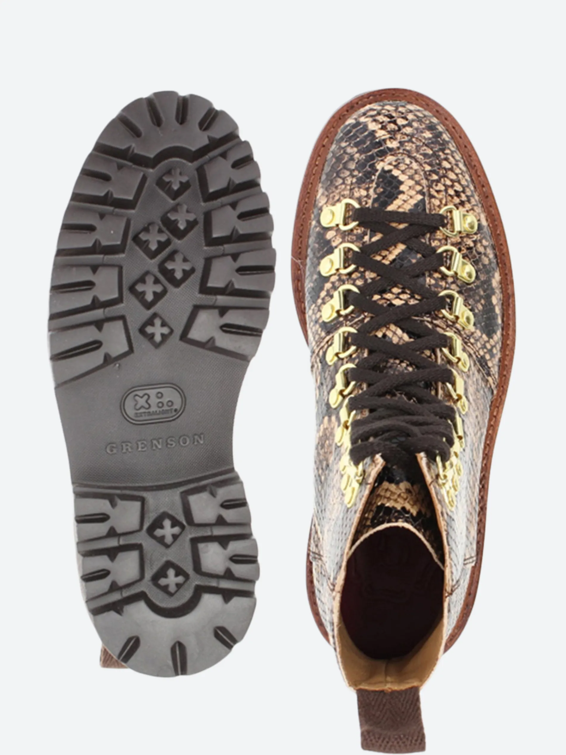 Grenson Nanette hiking boot with feature crossover lacing and a super lightweight Commando sole. Crafted from snake print leather with shiny brass eyelet loops with a natural welt and a brown sole that matches the dark tones of the snake print.