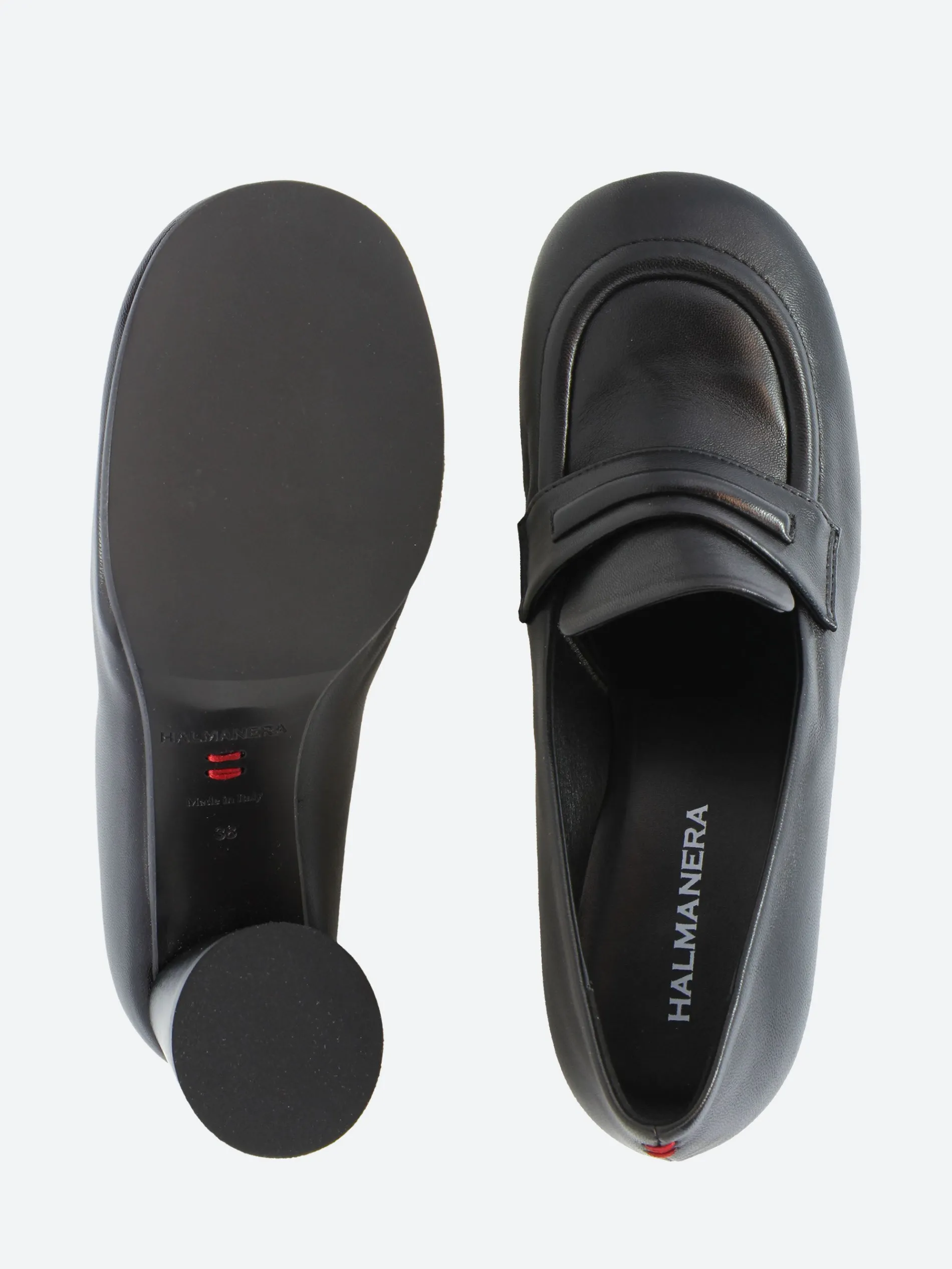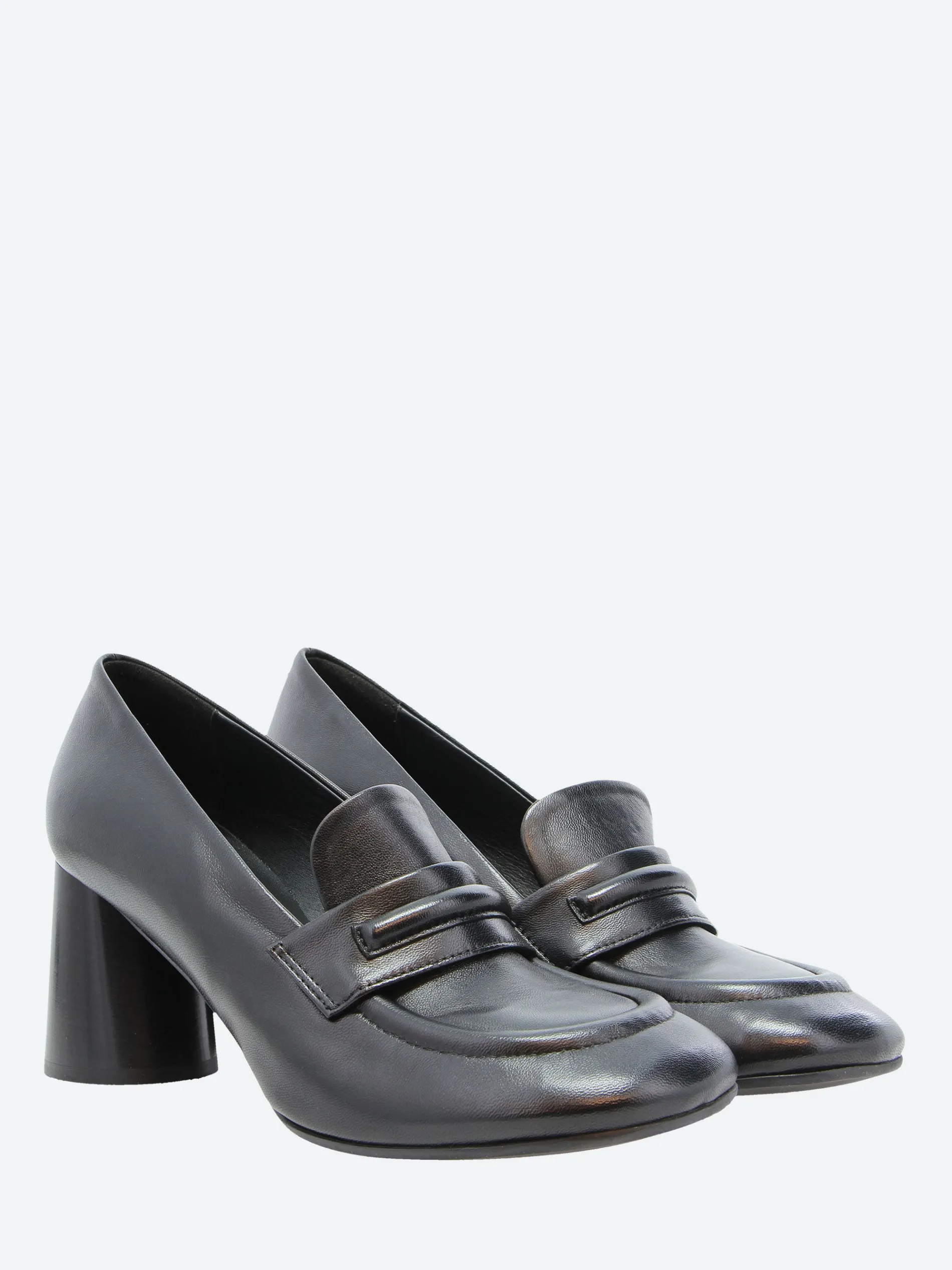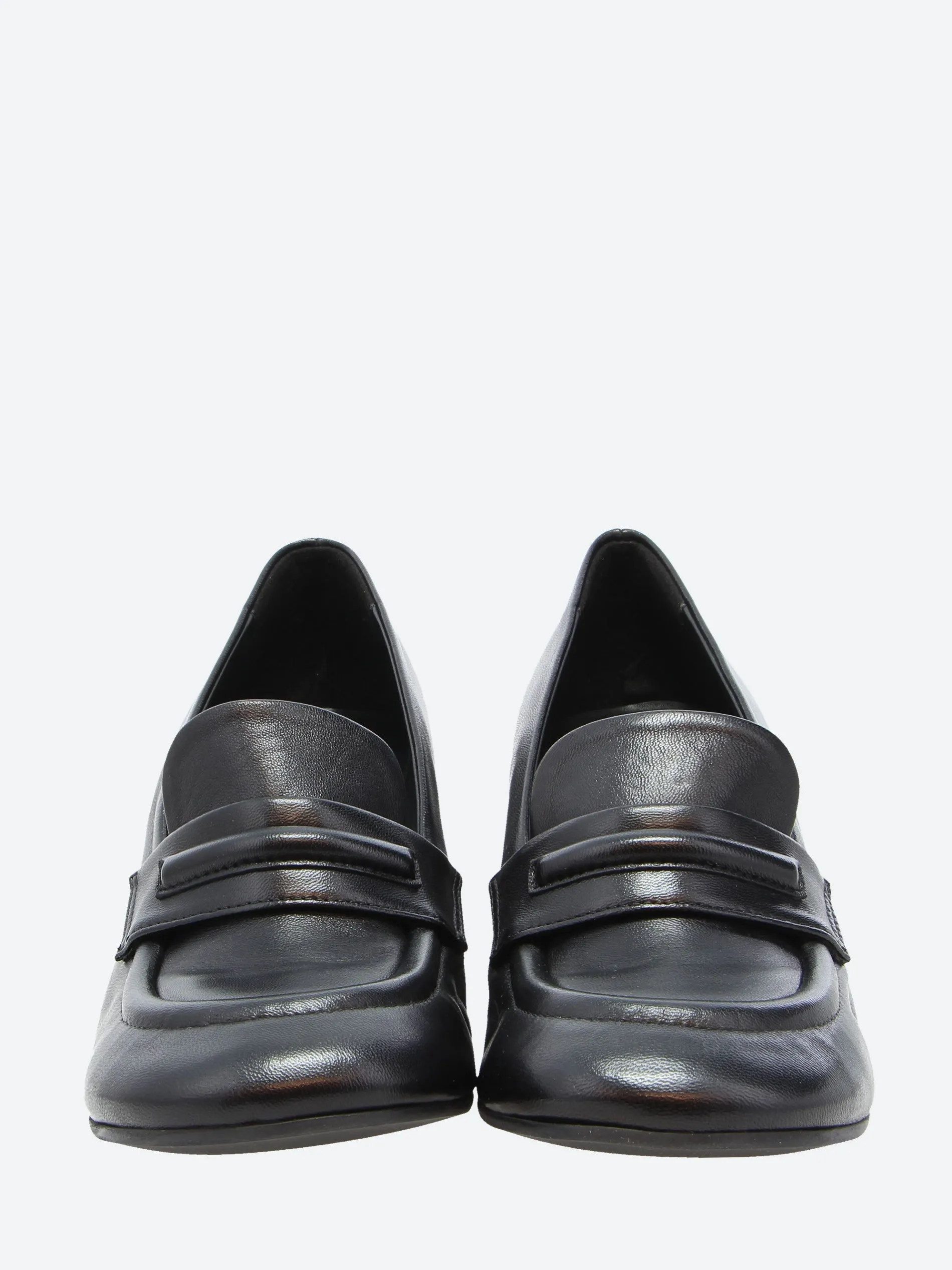 Classic penny loafer with a blocked-heel made from sleek leather with moc toe detailing.