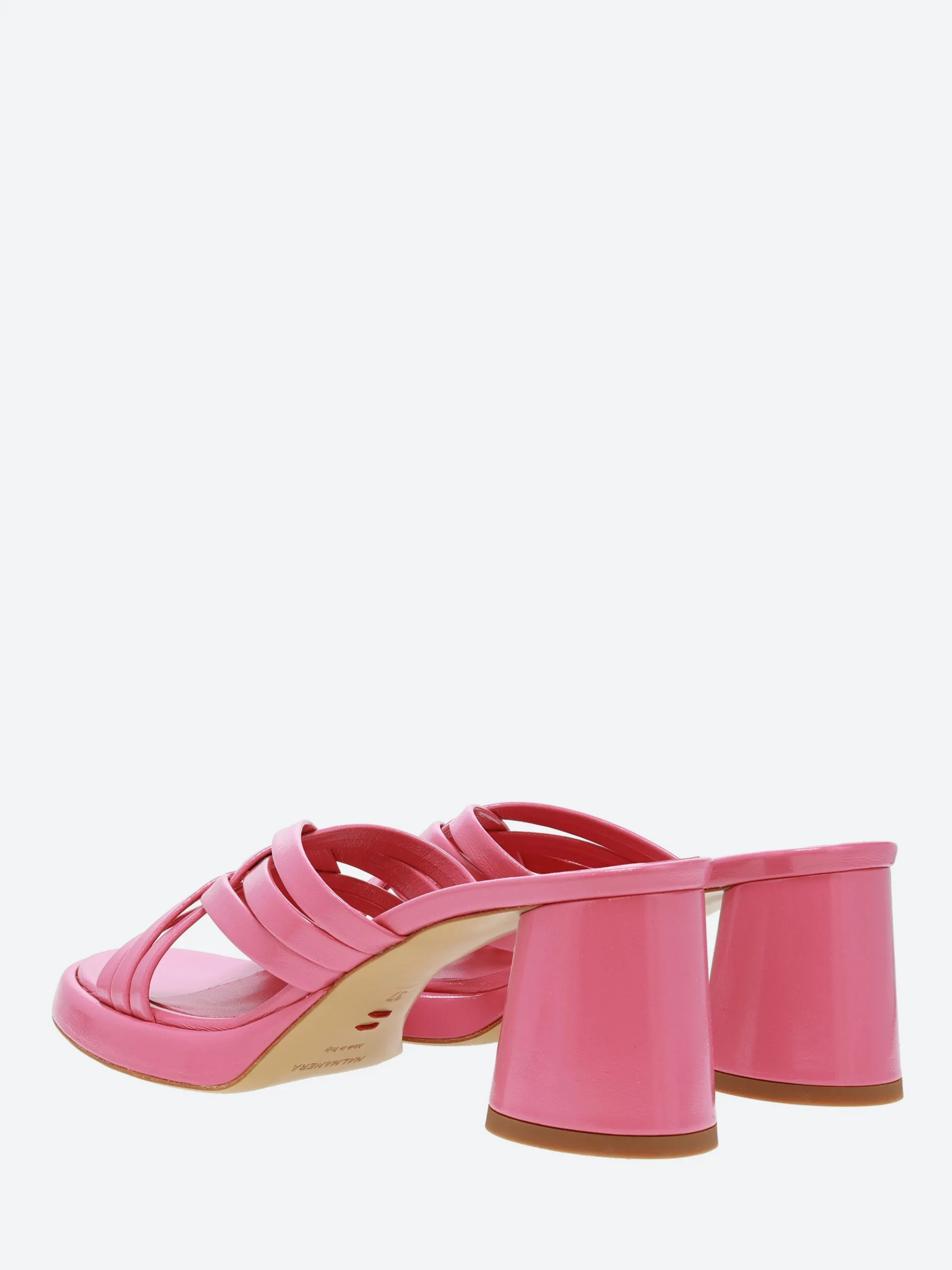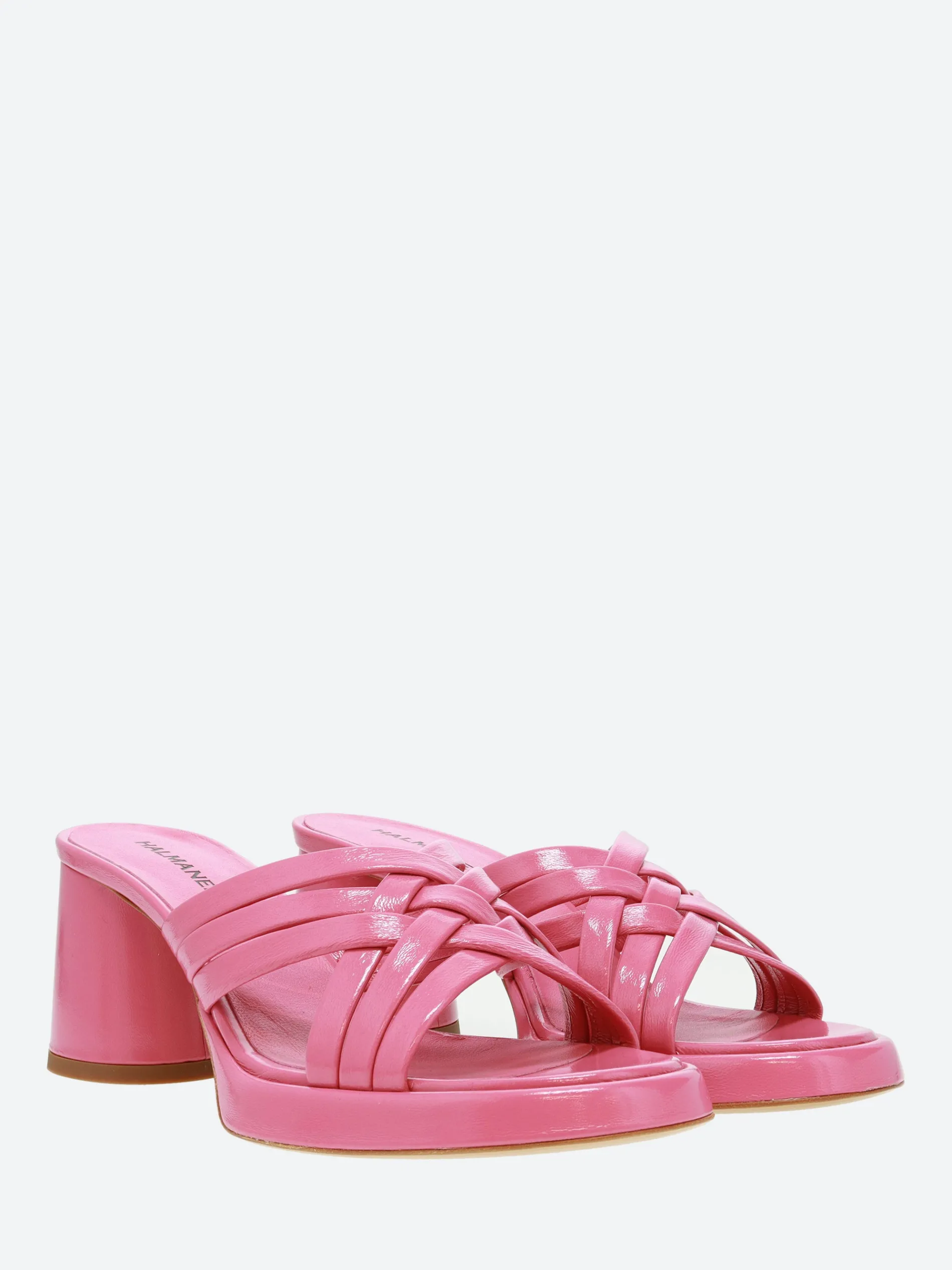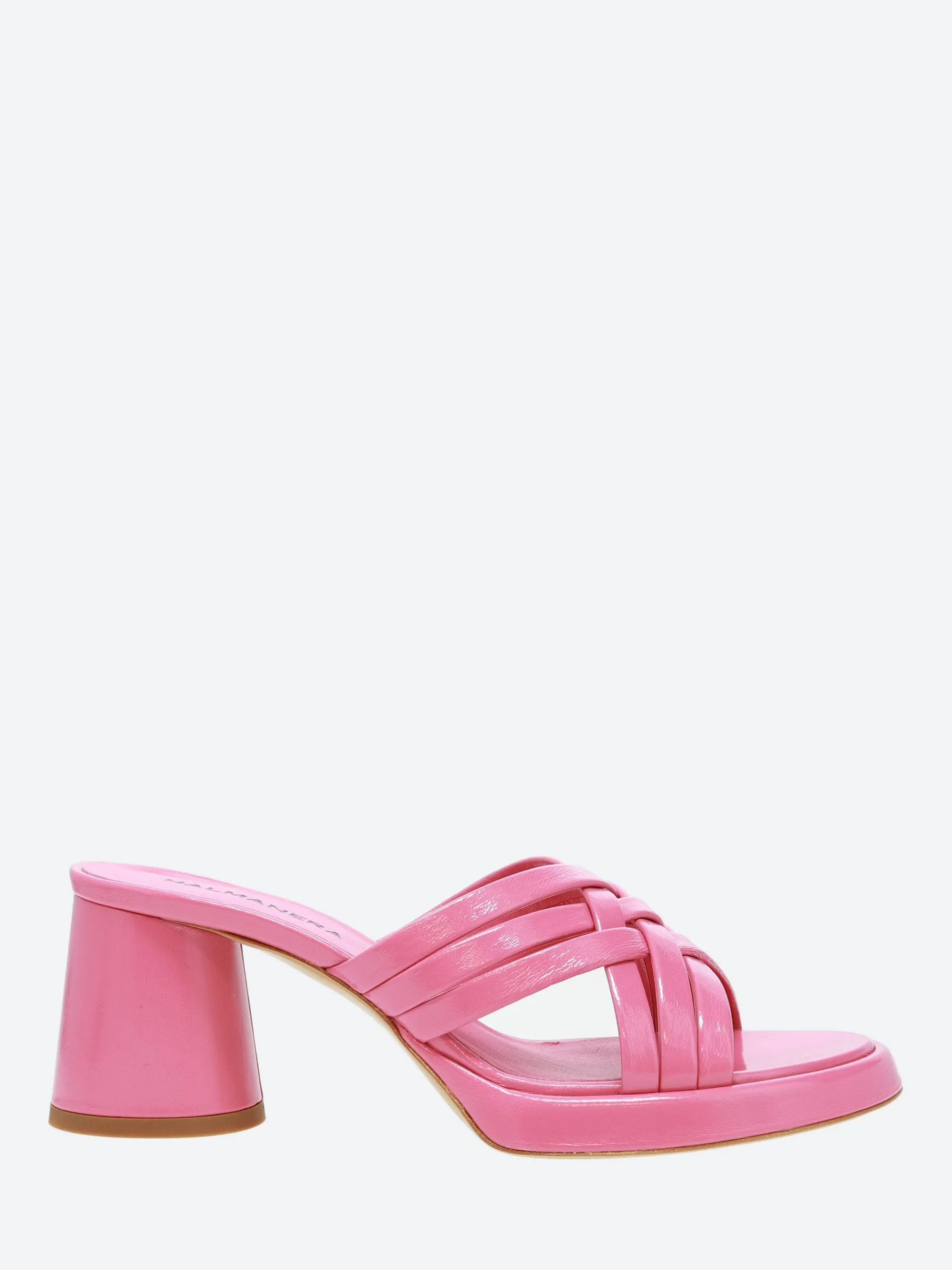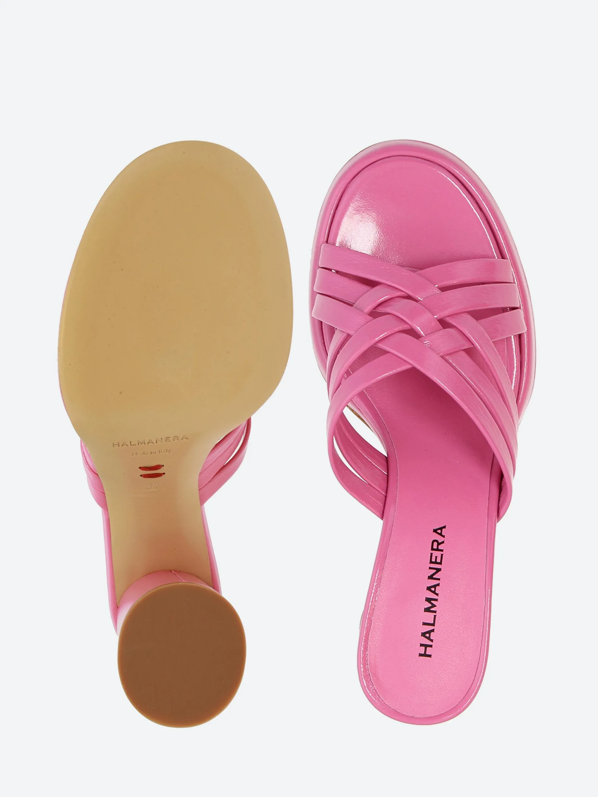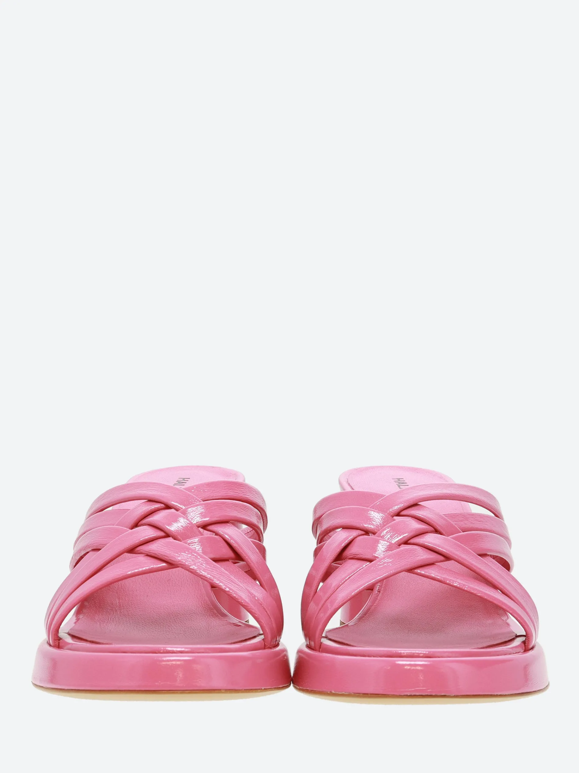 Crafted with woven leather straps, this versatile slide features a tubular wrapped heel for an elevated look.