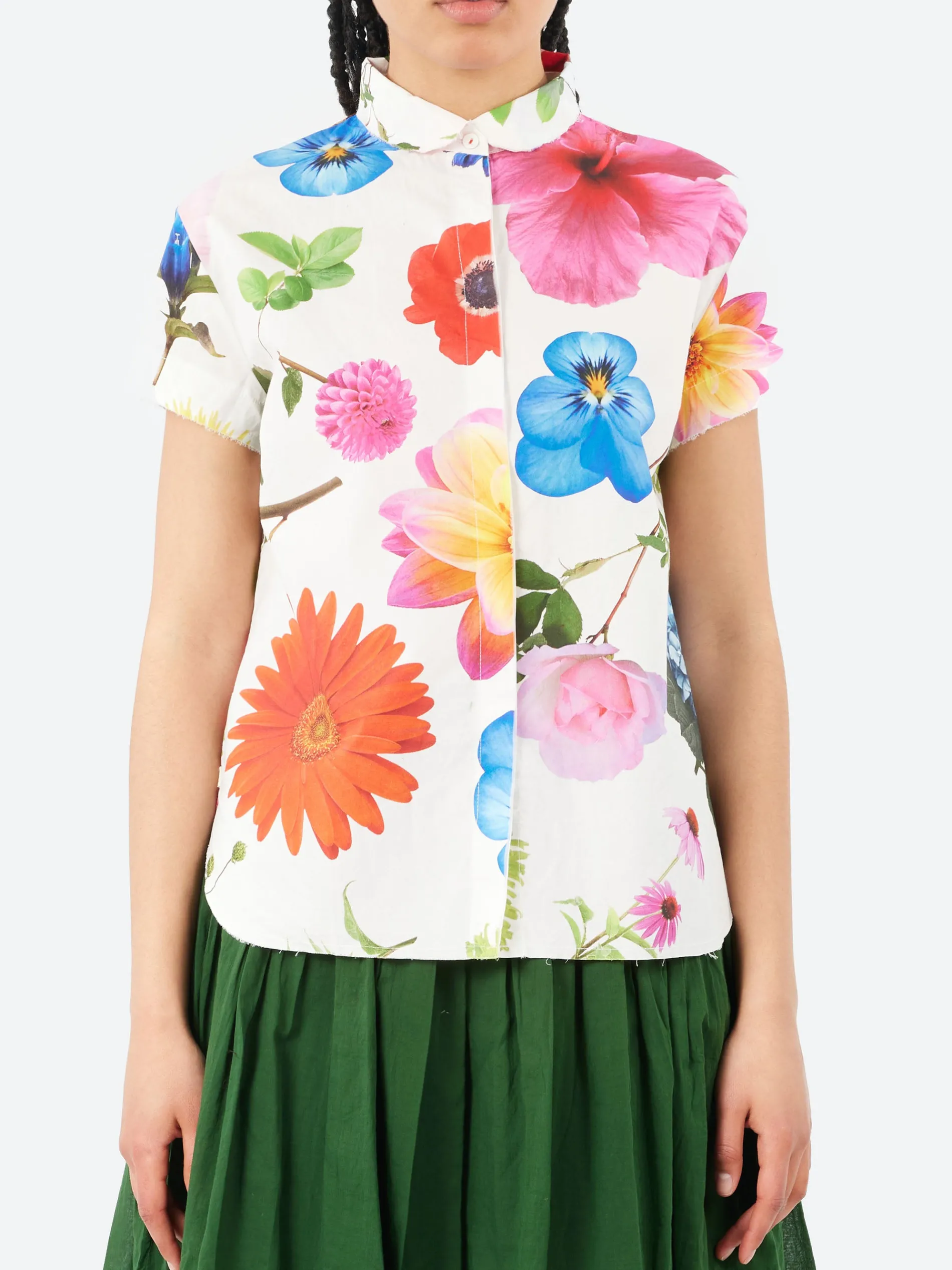 Made from crisp cotton percale, this short-sleeve shirt features raw edges and a round collar for a clean, modern look. The concealed button placket adds a sleek detail, while the curved front hem meets the back with a side slit for added style. An inverted center back pleat enhances the design, and the fit is traditionally structured but relaxed through the lower body, offering comfort with a tailored feel.