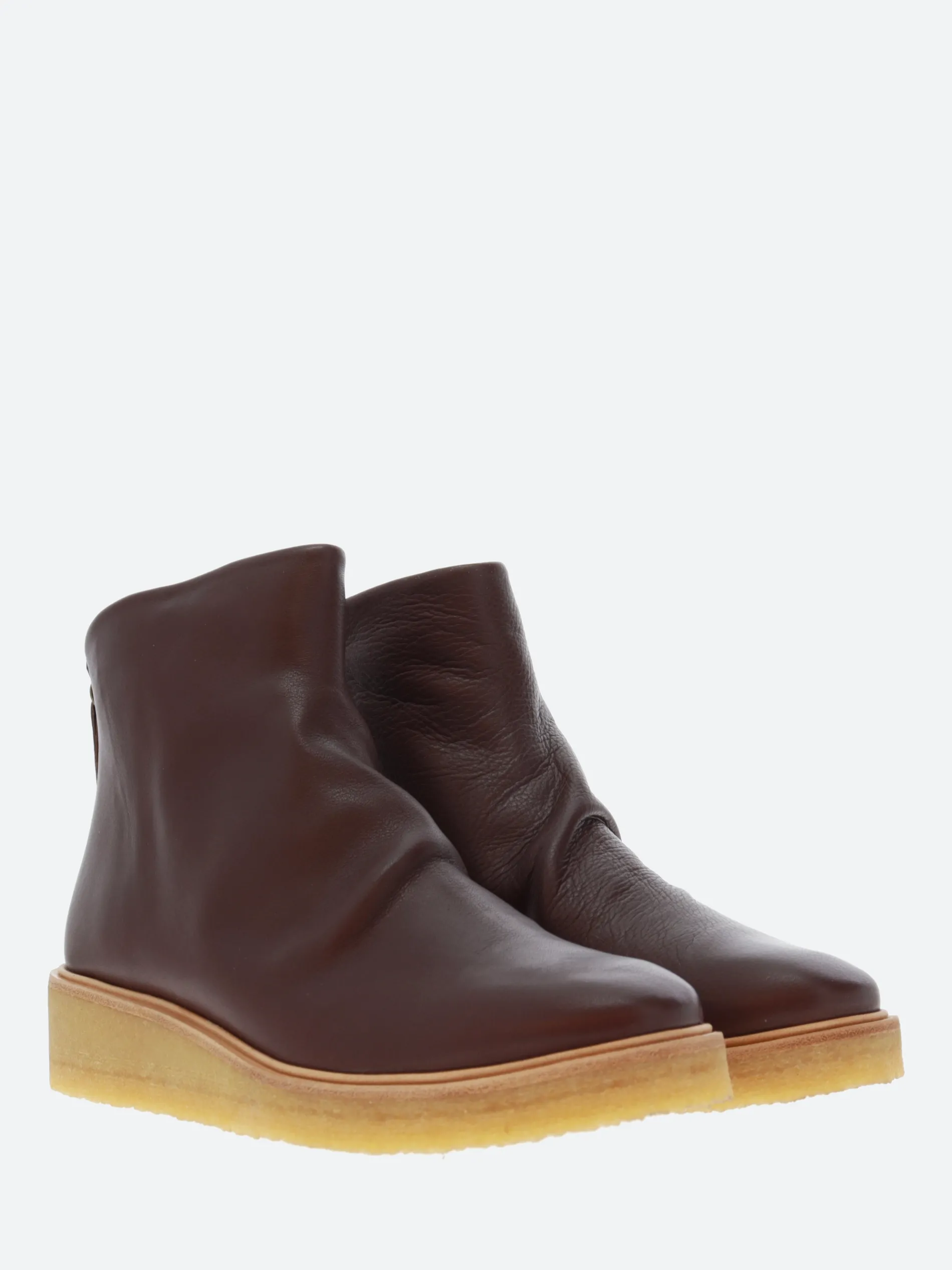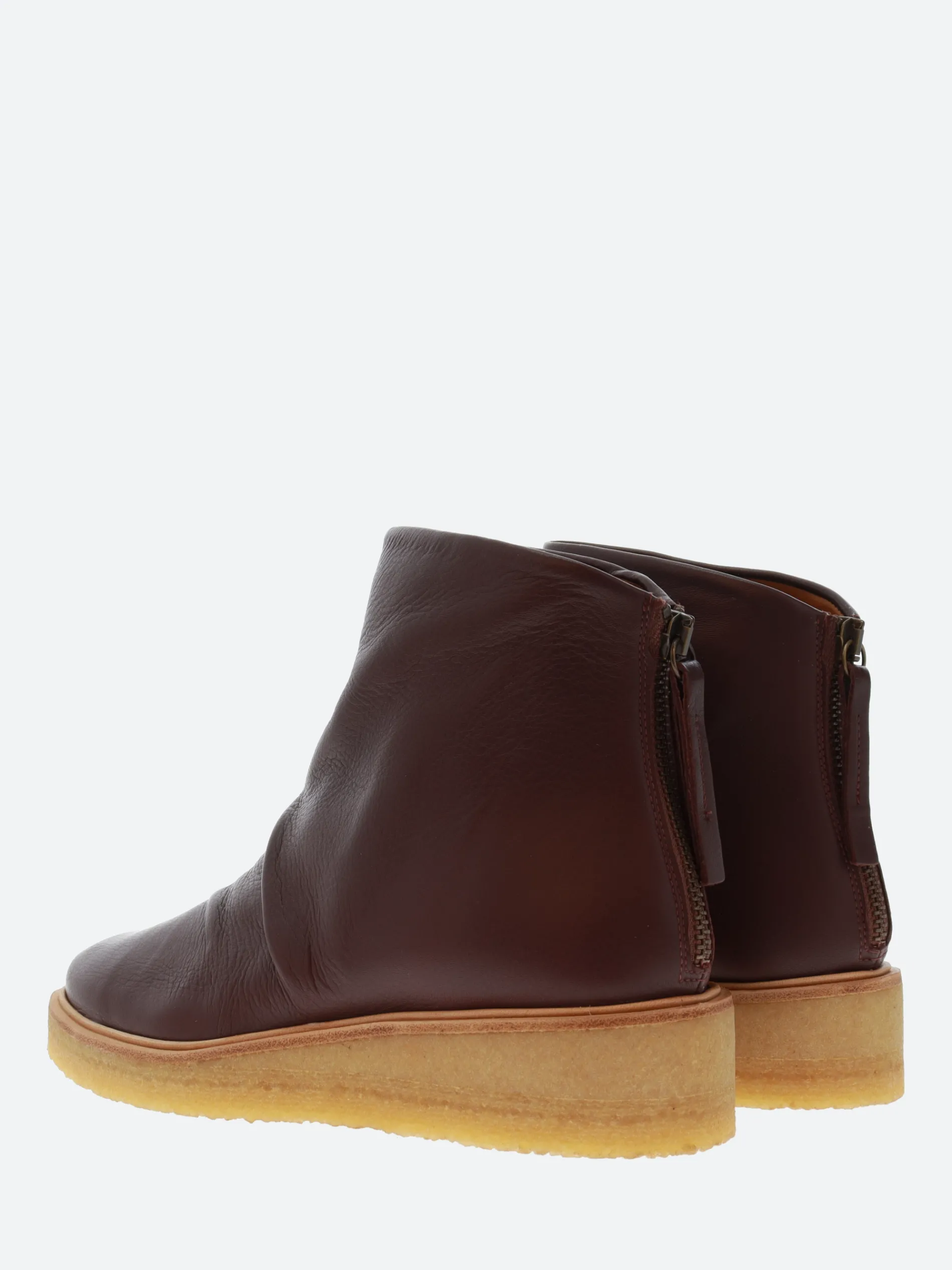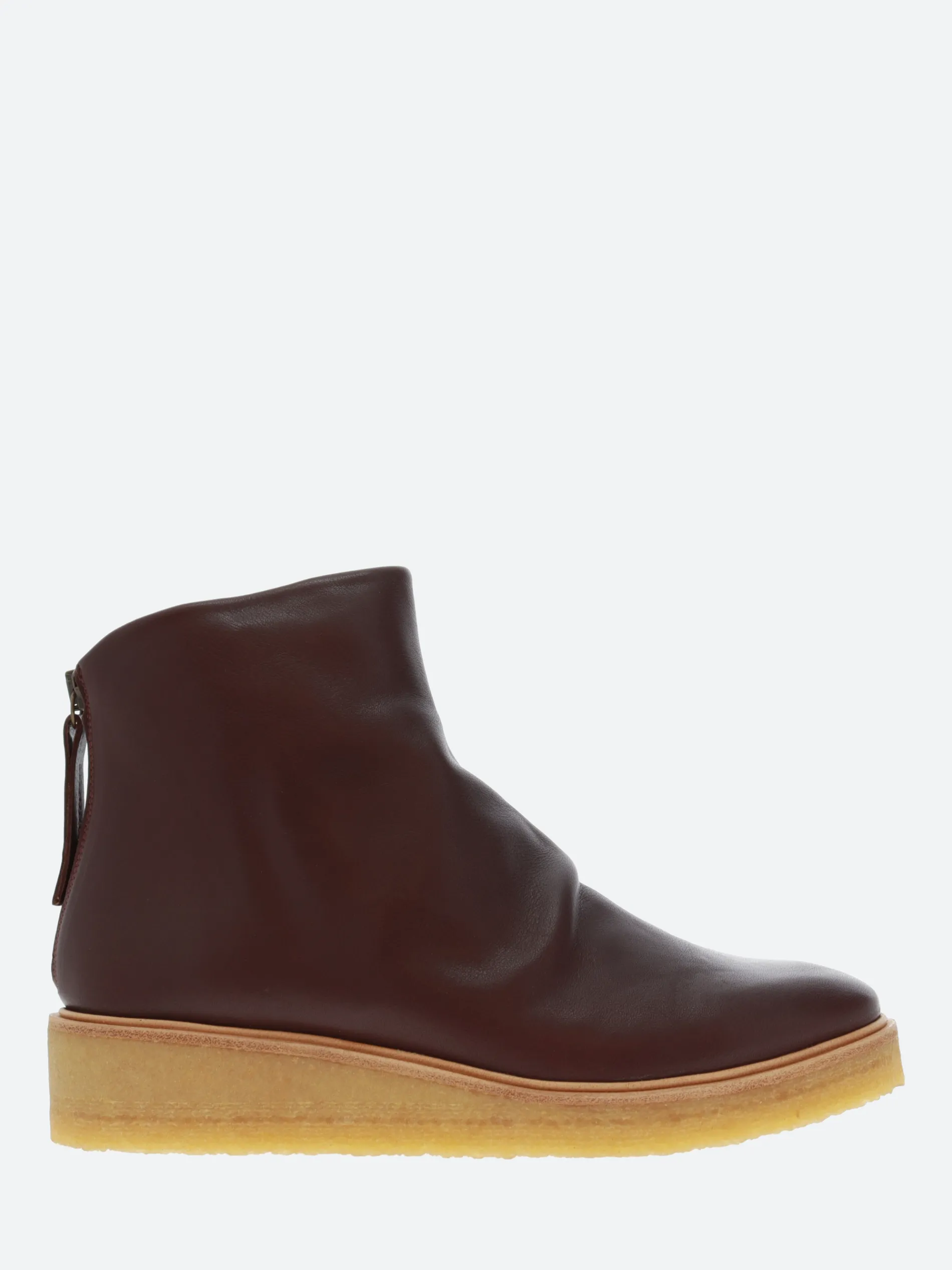 Soft wrinkles belie the comfort of this relaxed shaft, genuine crepe-soled wedge with natural leather welt. Its subdued details include a patinated metal back zipper and a softly sculpted toe shape.
