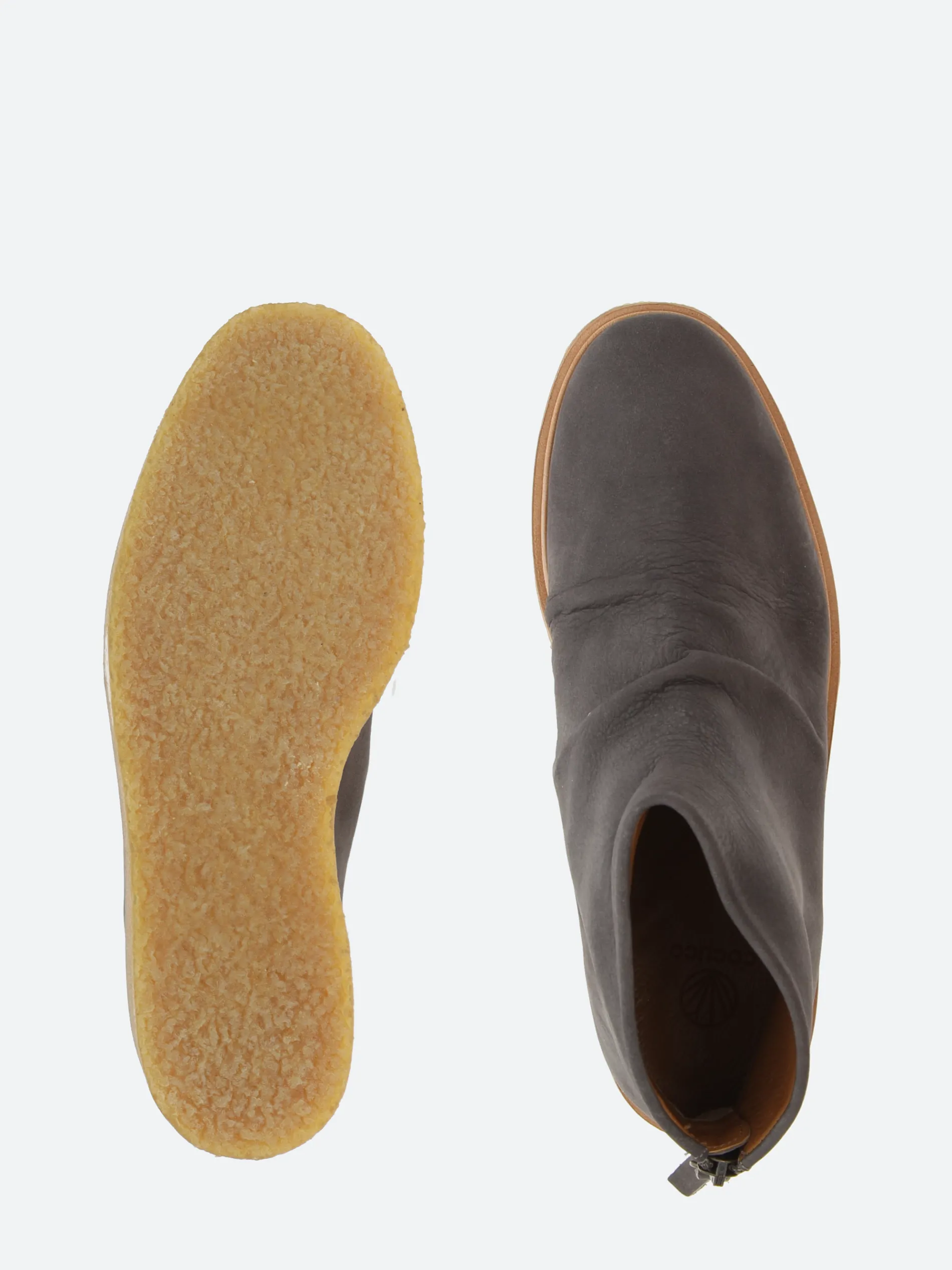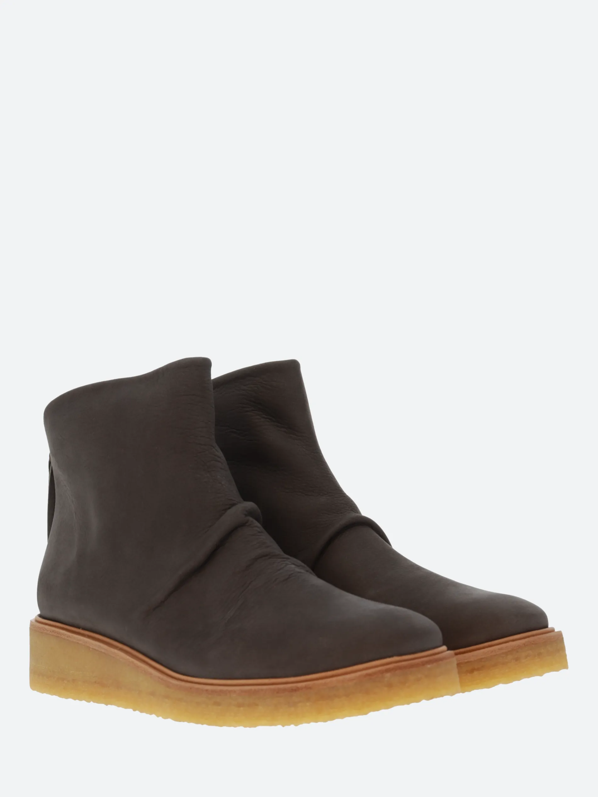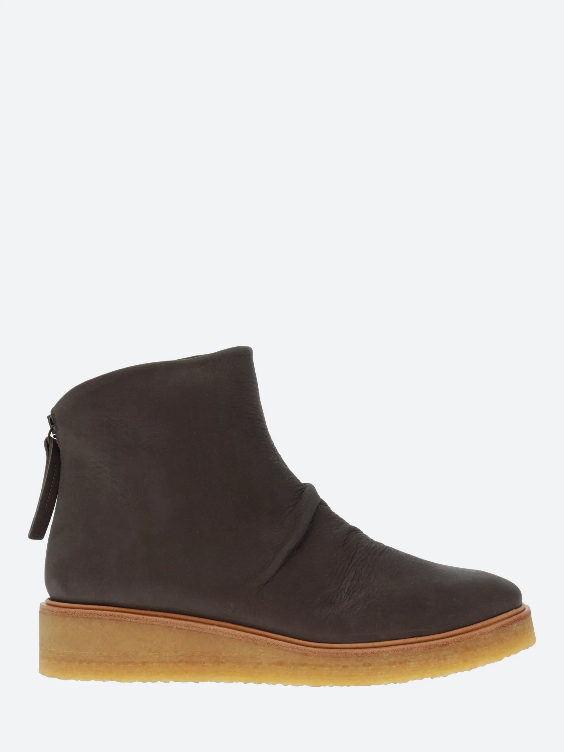 Soft wrinkles belie the comfort of this relaxed shaft, genuine crepe-soled wedge with natural leather welt. Its subdued details include a patinated metal back zipper and a softly sculpted toe shape.
