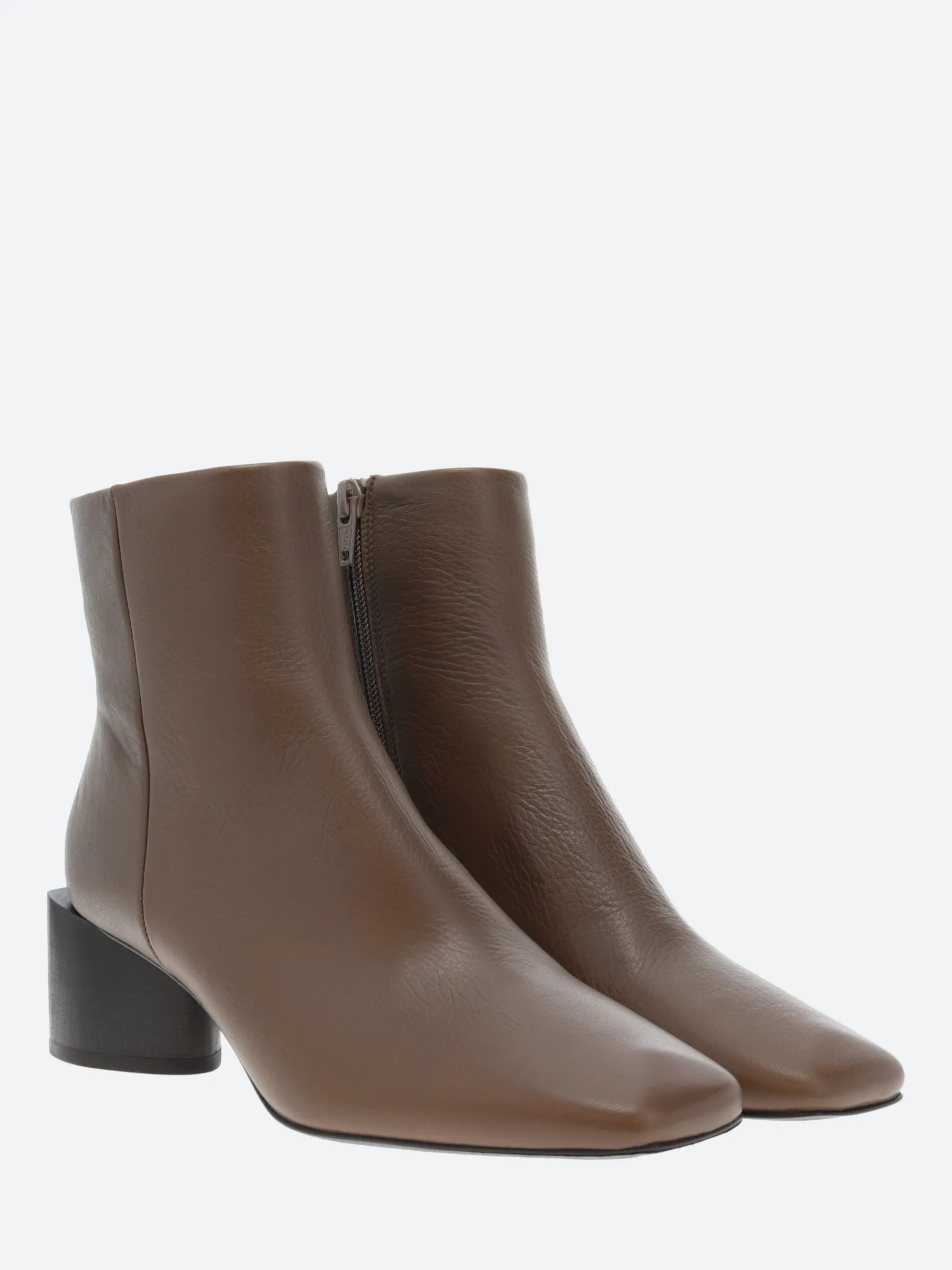 To achieve the perfectly minimal, modern look of the Ione boot no attention to detail was spared. Note the squared off toe with its distinctive toe box which is mirrored by the sculptural block-heel, squared off in the back and curved to a gentle point under the center of the foot.