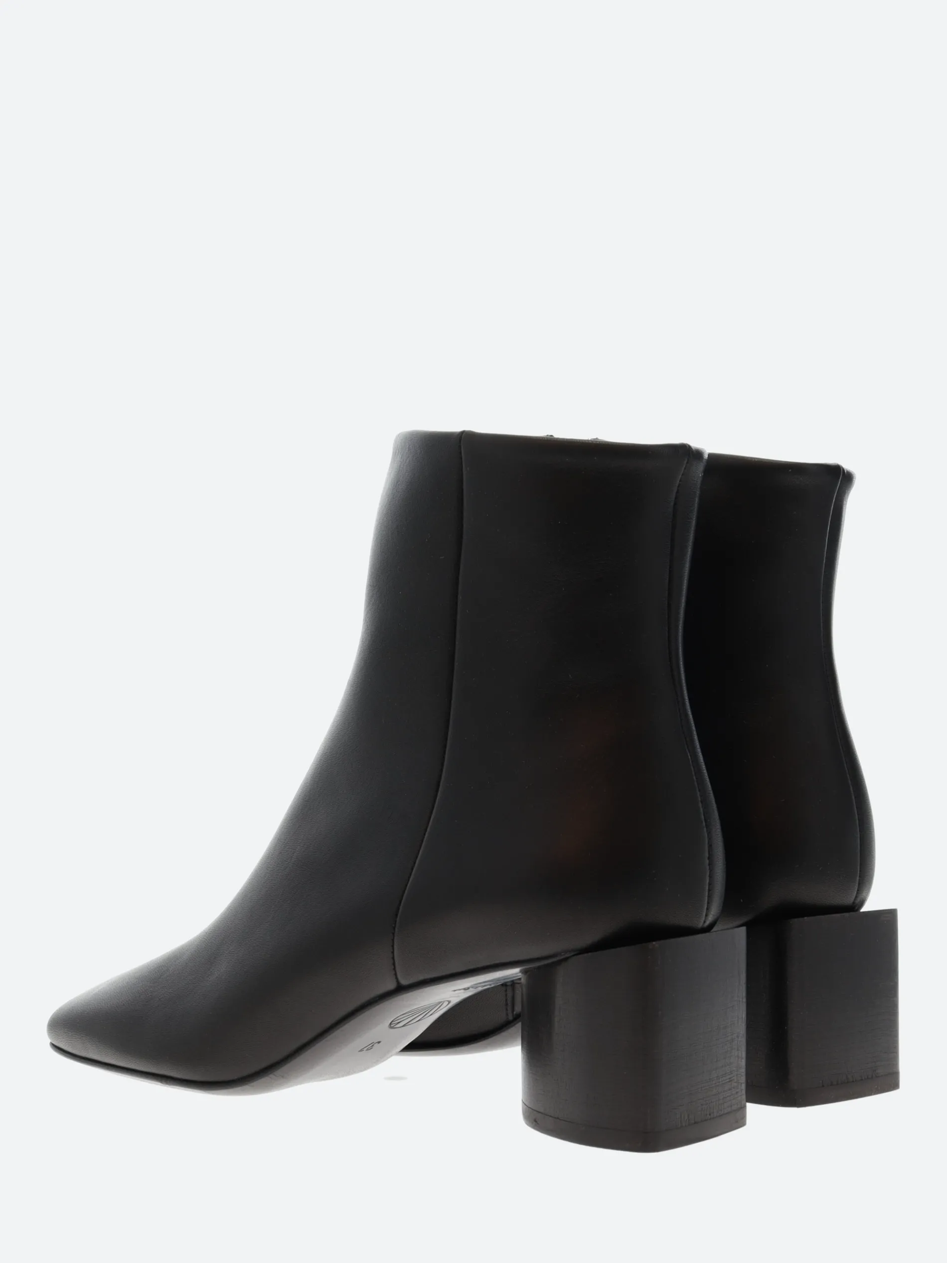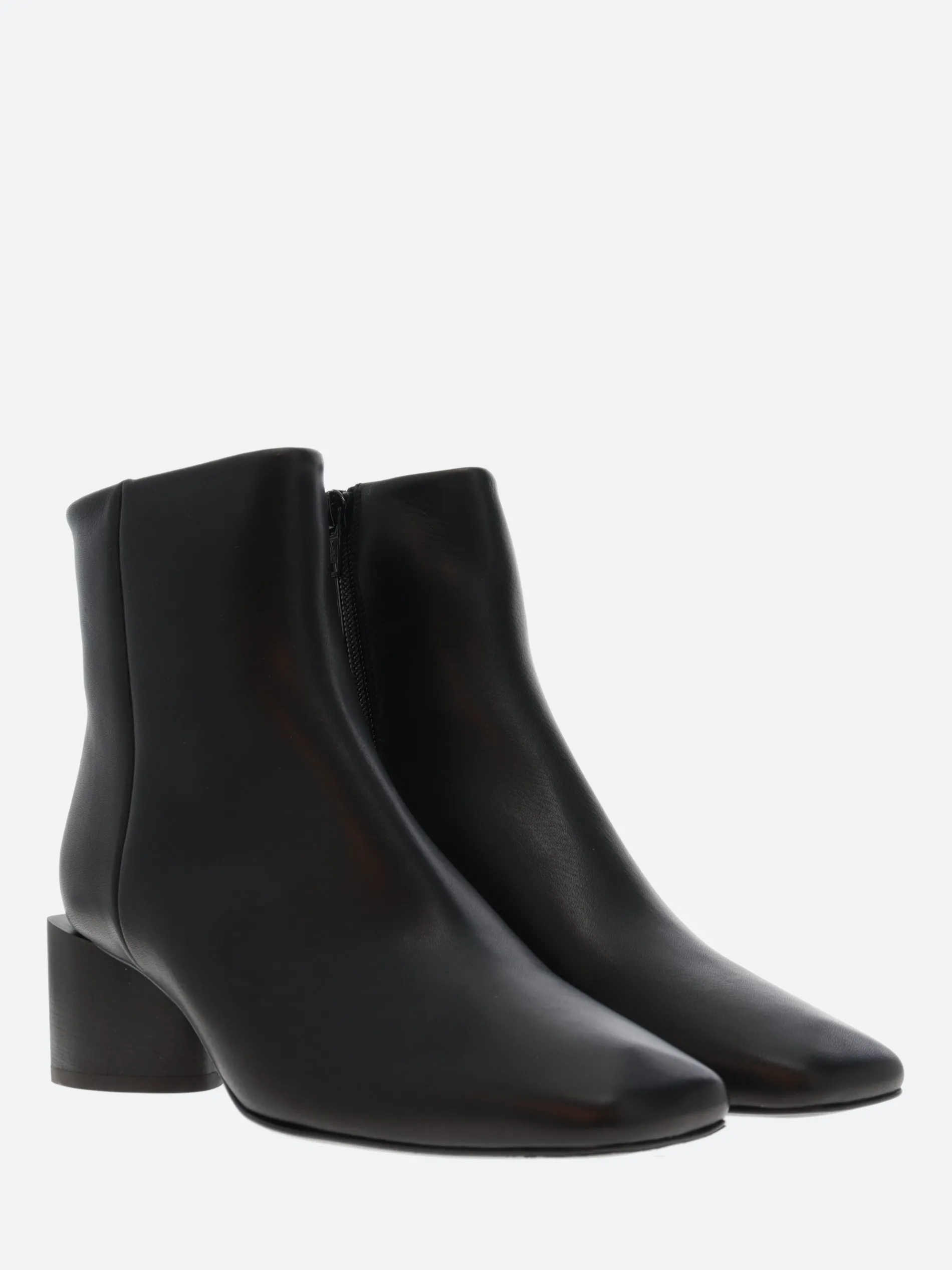 To achieve the perfectly minimal, modern look of the Ione boot no attention to detail was spared. Note the squared off toe with its distinctive toe box which is mirrored by the sculptural block-heel, squared off in the back and curved to a gentle point under the center of the foot.
