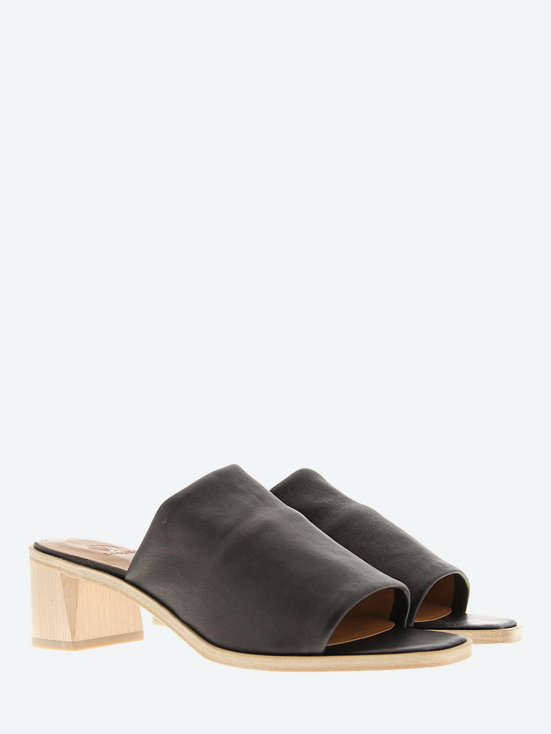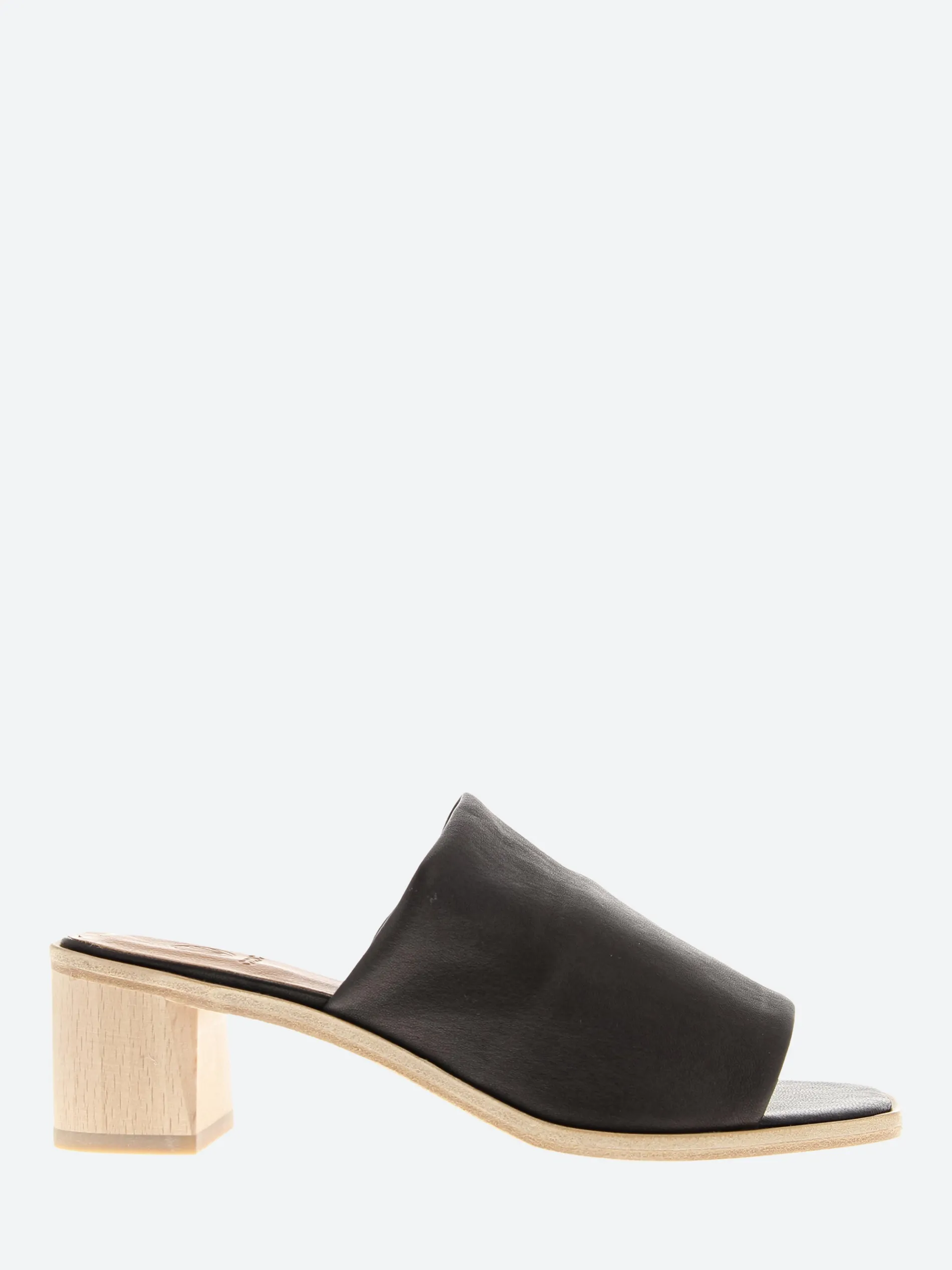 Stretch leather slide on a mid height architectural wood heel that takes you out the door in your own style.